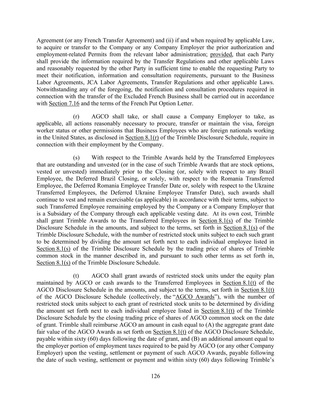 126 Agreement (or any French Transfer Agreement) and (ii) if and when required by applicable Law, to acquire or transfer to the Company or any Company Employer the prior authorization and employment-related Permits from the relevant labor administration; provided, that each Party shall provide the information required by the Transfer Regulations and other applicable Laws and reasonably requested by the other Party in sufficient time to enable the requesting Party to meet their notification, information and consultation requirements, pursuant to the Business Labor Agreements, JCA Labor Agreements, Transfer Regulations and other applicable Laws. Notwithstanding any of the foregoing, the notification and consultation procedures required in connection with the transfer of the Excluded French Business shall be carried out in accordance with Section 7.16 and the terms of the French Put Option Letter. (r) AGCO shall take, or shall cause a Company Employer to take, as applicable, all actions reasonably necessary to procure, transfer or maintain the visa, foreign worker status or other permissions that Business Employees who are foreign nationals working in the United States, as disclosed in Section 8.1(r) of the Trimble Disclosure Schedule, require in connection with their employment by the Company. (s) With respect to the Trimble Awards held by the Transferred Employees that are outstanding and unvested (or in the case of such Trimble Awards that are stock options, vested or unvested) immediately prior to the Closing (or, solely with respect to any Brazil Employee, the Deferred Brazil Closing, or solely, with respect to the Romania Transferred Employee, the Deferred Romania Employee Transfer Date or, solely with respect to the Ukraine Transferred Employees, the Deferred Ukraine Employee Transfer Date), such awards shall continue to vest and remain exercisable (as applicable) in accordance with their terms, subject to such Transferred Employee remaining employed by the Company or a Company Employer that is a Subsidary of the Company through each applicable vesting date. At its own cost, Trimble shall grant Trimble Awards to the Transferred Employees in Section 8.1(s) of the Trimble Disclosure Schedule in the amounts, and subject to the terms, set forth in Section 8.1(s) of the Trimble Disclosure Schedule, with the number of restricted stock units subject to each such grant to be determined by dividing the amount set forth next to each individual employee listed in Section 8.1(s) of the Trimble Disclosure Schedule by the trading price of shares of Trimble common stock in the manner described in, and pursuant to such other terms as set forth in, Section 8.1(s) of the Trimble Disclosure Schedule. (t) AGCO shall grant awards of restricted stock units under the equity plan maintained by AGCO or cash awards to the Transferred Employees in Section 8.1(t) of the AGCO Disclosure Schedule in the amounts, and subject to the terms, set forth in Section 8.1(t) of the AGCO Disclosure Schedule (collectively, the “AGCO Awards”), with the number of restricted stock units subject to each grant of restricted stock units to be determined by dividing the amount set forth next to each individual employee listed in Section 8.1(t) of the Trimble Disclosure Schedule by the closing trading price of shares of AGCO common stock on the date of grant. Trimble shall reimburse AGCO an amount in cash equal to (A) the aggregate grant date fair value of the AGCO Awards as set forth on Section 8.1(t) of the AGCO Disclosure Schedule, payable within sixty (60) days following the date of grant, and (B) an additional amount equal to the employer portion of employment taxes required to be paid by AGCO (or any other Company Employer) upon the vesting, settlement or payment of such AGCO Awards, payable following the date of such vesting, settlement or payment and within sixty (60) days following Trimble’s