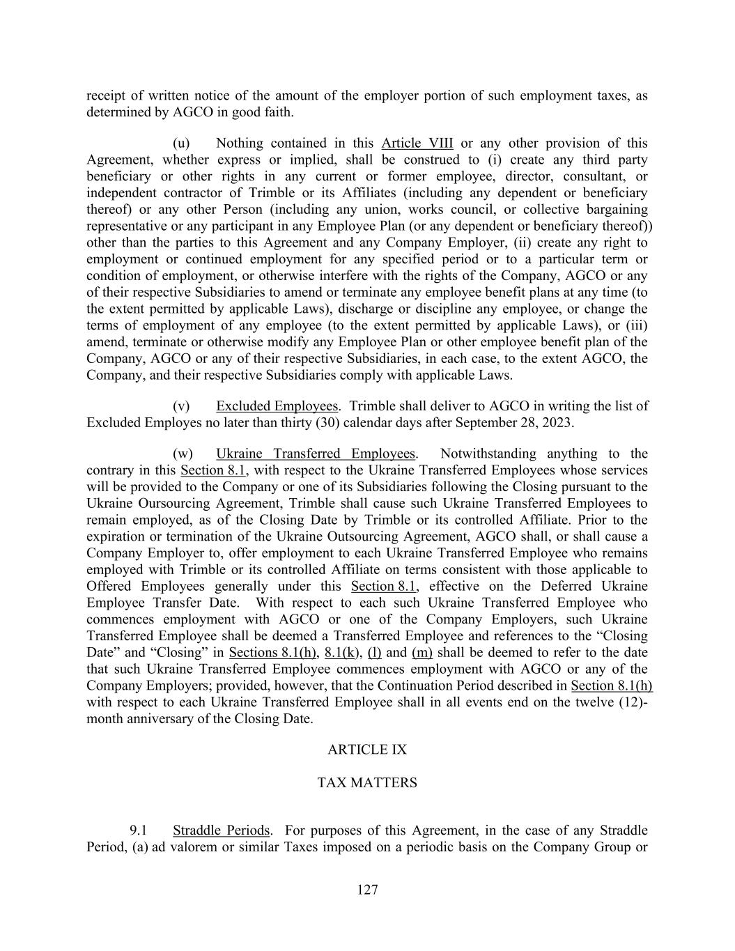 127 receipt of written notice of the amount of the employer portion of such employment taxes, as determined by AGCO in good faith. (u) Nothing contained in this Article VIII or any other provision of this Agreement, whether express or implied, shall be construed to (i) create any third party beneficiary or other rights in any current or former employee, director, consultant, or independent contractor of Trimble or its Affiliates (including any dependent or beneficiary thereof) or any other Person (including any union, works council, or collective bargaining representative or any participant in any Employee Plan (or any dependent or beneficiary thereof)) other than the parties to this Agreement and any Company Employer, (ii) create any right to employment or continued employment for any specified period or to a particular term or condition of employment, or otherwise interfere with the rights of the Company, AGCO or any of their respective Subsidiaries to amend or terminate any employee benefit plans at any time (to the extent permitted by applicable Laws), discharge or discipline any employee, or change the terms of employment of any employee (to the extent permitted by applicable Laws), or (iii) amend, terminate or otherwise modify any Employee Plan or other employee benefit plan of the Company, AGCO or any of their respective Subsidiaries, in each case, to the extent AGCO, the Company, and their respective Subsidiaries comply with applicable Laws. (v) Excluded Employees. Trimble shall deliver to AGCO in writing the list of Excluded Employes no later than thirty (30) calendar days after September 28, 2023. (w) Ukraine Transferred Employees. Notwithstanding anything to the contrary in this Section 8.1, with respect to the Ukraine Transferred Employees whose services will be provided to the Company or one of its Subsidiaries following the Closing pursuant to the Ukraine Oursourcing Agreement, Trimble shall cause such Ukraine Transferred Employees to remain employed, as of the Closing Date by Trimble or its controlled Affiliate. Prior to the expiration or termination of the Ukraine Outsourcing Agreement, AGCO shall, or shall cause a Company Employer to, offer employment to each Ukraine Transferred Employee who remains employed with Trimble or its controlled Affiliate on terms consistent with those applicable to Offered Employees generally under this Section 8.1, effective on the Deferred Ukraine Employee Transfer Date. With respect to each such Ukraine Transferred Employee who commences employment with AGCO or one of the Company Employers, such Ukraine Transferred Employee shall be deemed a Transferred Employee and references to the “Closing Date” and “Closing” in Sections 8.1(h), 8.1(k), (l) and (m) shall be deemed to refer to the date that such Ukraine Transferred Employee commences employment with AGCO or any of the Company Employers; provided, however, that the Continuation Period described in Section 8.1(h) with respect to each Ukraine Transferred Employee shall in all events end on the twelve (12)- month anniversary of the Closing Date. ARTICLE IX TAX MATTERS 9.1 Straddle Periods. For purposes of this Agreement, in the case of any Straddle Period, (a) ad valorem or similar Taxes imposed on a periodic basis on the Company Group or