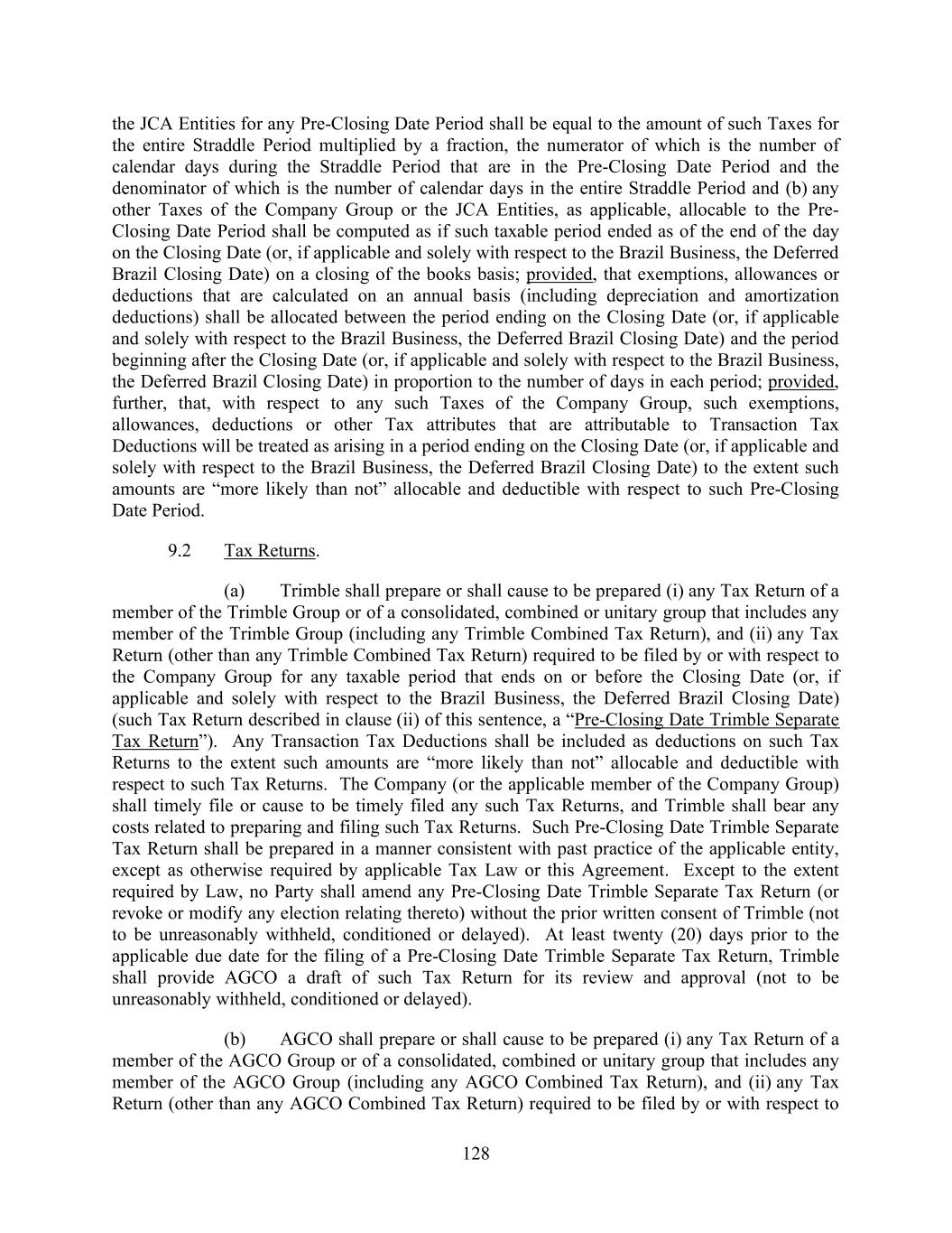 128 the JCA Entities for any Pre-Closing Date Period shall be equal to the amount of such Taxes for the entire Straddle Period multiplied by a fraction, the numerator of which is the number of calendar days during the Straddle Period that are in the Pre-Closing Date Period and the denominator of which is the number of calendar days in the entire Straddle Period and (b) any other Taxes of the Company Group or the JCA Entities, as applicable, allocable to the Pre- Closing Date Period shall be computed as if such taxable period ended as of the end of the day on the Closing Date (or, if applicable and solely with respect to the Brazil Business, the Deferred Brazil Closing Date) on a closing of the books basis; provided, that exemptions, allowances or deductions that are calculated on an annual basis (including depreciation and amortization deductions) shall be allocated between the period ending on the Closing Date (or, if applicable and solely with respect to the Brazil Business, the Deferred Brazil Closing Date) and the period beginning after the Closing Date (or, if applicable and solely with respect to the Brazil Business, the Deferred Brazil Closing Date) in proportion to the number of days in each period; provided, further, that, with respect to any such Taxes of the Company Group, such exemptions, allowances, deductions or other Tax attributes that are attributable to Transaction Tax Deductions will be treated as arising in a period ending on the Closing Date (or, if applicable and solely with respect to the Brazil Business, the Deferred Brazil Closing Date) to the extent such amounts are “more likely than not” allocable and deductible with respect to such Pre-Closing Date Period. 9.2 Tax Returns. (a) Trimble shall prepare or shall cause to be prepared (i) any Tax Return of a member of the Trimble Group or of a consolidated, combined or unitary group that includes any member of the Trimble Group (including any Trimble Combined Tax Return), and (ii) any Tax Return (other than any Trimble Combined Tax Return) required to be filed by or with respect to the Company Group for any taxable period that ends on or before the Closing Date (or, if applicable and solely with respect to the Brazil Business, the Deferred Brazil Closing Date) (such Tax Return described in clause (ii) of this sentence, a “Pre-Closing Date Trimble Separate Tax Return”). Any Transaction Tax Deductions shall be included as deductions on such Tax Returns to the extent such amounts are “more likely than not” allocable and deductible with respect to such Tax Returns. The Company (or the applicable member of the Company Group) shall timely file or cause to be timely filed any such Tax Returns, and Trimble shall bear any costs related to preparing and filing such Tax Returns. Such Pre-Closing Date Trimble Separate Tax Return shall be prepared in a manner consistent with past practice of the applicable entity, except as otherwise required by applicable Tax Law or this Agreement. Except to the extent required by Law, no Party shall amend any Pre-Closing Date Trimble Separate Tax Return (or revoke or modify any election relating thereto) without the prior written consent of Trimble (not to be unreasonably withheld, conditioned or delayed). At least twenty (20) days prior to the applicable due date for the filing of a Pre-Closing Date Trimble Separate Tax Return, Trimble shall provide AGCO a draft of such Tax Return for its review and approval (not to be unreasonably withheld, conditioned or delayed). (b) AGCO shall prepare or shall cause to be prepared (i) any Tax Return of a member of the AGCO Group or of a consolidated, combined or unitary group that includes any member of the AGCO Group (including any AGCO Combined Tax Return), and (ii) any Tax Return (other than any AGCO Combined Tax Return) required to be filed by or with respect to