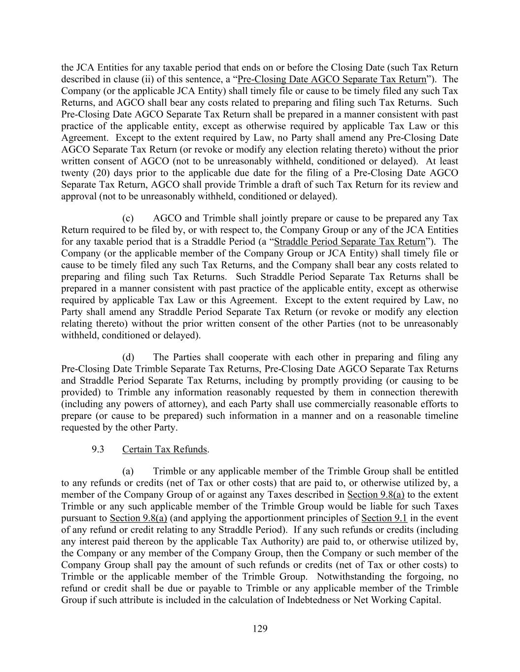 129 the JCA Entities for any taxable period that ends on or before the Closing Date (such Tax Return described in clause (ii) of this sentence, a “Pre-Closing Date AGCO Separate Tax Return”). The Company (or the applicable JCA Entity) shall timely file or cause to be timely filed any such Tax Returns, and AGCO shall bear any costs related to preparing and filing such Tax Returns. Such Pre-Closing Date AGCO Separate Tax Return shall be prepared in a manner consistent with past practice of the applicable entity, except as otherwise required by applicable Tax Law or this Agreement. Except to the extent required by Law, no Party shall amend any Pre-Closing Date AGCO Separate Tax Return (or revoke or modify any election relating thereto) without the prior written consent of AGCO (not to be unreasonably withheld, conditioned or delayed). At least twenty (20) days prior to the applicable due date for the filing of a Pre-Closing Date AGCO Separate Tax Return, AGCO shall provide Trimble a draft of such Tax Return for its review and approval (not to be unreasonably withheld, conditioned or delayed). (c) AGCO and Trimble shall jointly prepare or cause to be prepared any Tax Return required to be filed by, or with respect to, the Company Group or any of the JCA Entities for any taxable period that is a Straddle Period (a “Straddle Period Separate Tax Return”). The Company (or the applicable member of the Company Group or JCA Entity) shall timely file or cause to be timely filed any such Tax Returns, and the Company shall bear any costs related to preparing and filing such Tax Returns. Such Straddle Period Separate Tax Returns shall be prepared in a manner consistent with past practice of the applicable entity, except as otherwise required by applicable Tax Law or this Agreement. Except to the extent required by Law, no Party shall amend any Straddle Period Separate Tax Return (or revoke or modify any election relating thereto) without the prior written consent of the other Parties (not to be unreasonably withheld, conditioned or delayed). (d) The Parties shall cooperate with each other in preparing and filing any Pre-Closing Date Trimble Separate Tax Returns, Pre-Closing Date AGCO Separate Tax Returns and Straddle Period Separate Tax Returns, including by promptly providing (or causing to be provided) to Trimble any information reasonably requested by them in connection therewith (including any powers of attorney), and each Party shall use commercially reasonable efforts to prepare (or cause to be prepared) such information in a manner and on a reasonable timeline requested by the other Party. 9.3 Certain Tax Refunds. (a) Trimble or any applicable member of the Trimble Group shall be entitled to any refunds or credits (net of Tax or other costs) that are paid to, or otherwise utilized by, a member of the Company Group of or against any Taxes described in Section 9.8(a) to the extent Trimble or any such applicable member of the Trimble Group would be liable for such Taxes pursuant to Section 9.8(a) (and applying the apportionment principles of Section 9.1 in the event of any refund or credit relating to any Straddle Period). If any such refunds or credits (including any interest paid thereon by the applicable Tax Authority) are paid to, or otherwise utilized by, the Company or any member of the Company Group, then the Company or such member of the Company Group shall pay the amount of such refunds or credits (net of Tax or other costs) to Trimble or the applicable member of the Trimble Group. Notwithstanding the forgoing, no refund or credit shall be due or payable to Trimble or any applicable member of the Trimble Group if such attribute is included in the calculation of Indebtedness or Net Working Capital.