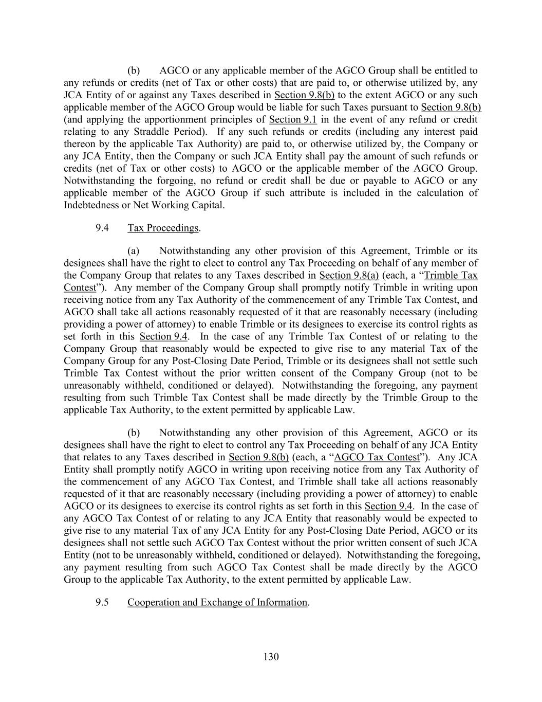 130 (b) AGCO or any applicable member of the AGCO Group shall be entitled to any refunds or credits (net of Tax or other costs) that are paid to, or otherwise utilized by, any JCA Entity of or against any Taxes described in Section 9.8(b) to the extent AGCO or any such applicable member of the AGCO Group would be liable for such Taxes pursuant to Section 9.8(b) (and applying the apportionment principles of Section 9.1 in the event of any refund or credit relating to any Straddle Period). If any such refunds or credits (including any interest paid thereon by the applicable Tax Authority) are paid to, or otherwise utilized by, the Company or any JCA Entity, then the Company or such JCA Entity shall pay the amount of such refunds or credits (net of Tax or other costs) to AGCO or the applicable member of the AGCO Group. Notwithstanding the forgoing, no refund or credit shall be due or payable to AGCO or any applicable member of the AGCO Group if such attribute is included in the calculation of Indebtedness or Net Working Capital. 9.4 Tax Proceedings. (a) Notwithstanding any other provision of this Agreement, Trimble or its designees shall have the right to elect to control any Tax Proceeding on behalf of any member of the Company Group that relates to any Taxes described in Section 9.8(a) (each, a “Trimble Tax Contest”). Any member of the Company Group shall promptly notify Trimble in writing upon receiving notice from any Tax Authority of the commencement of any Trimble Tax Contest, and AGCO shall take all actions reasonably requested of it that are reasonably necessary (including providing a power of attorney) to enable Trimble or its designees to exercise its control rights as set forth in this Section 9.4. In the case of any Trimble Tax Contest of or relating to the Company Group that reasonably would be expected to give rise to any material Tax of the Company Group for any Post-Closing Date Period, Trimble or its designees shall not settle such Trimble Tax Contest without the prior written consent of the Company Group (not to be unreasonably withheld, conditioned or delayed). Notwithstanding the foregoing, any payment resulting from such Trimble Tax Contest shall be made directly by the Trimble Group to the applicable Tax Authority, to the extent permitted by applicable Law. (b) Notwithstanding any other provision of this Agreement, AGCO or its designees shall have the right to elect to control any Tax Proceeding on behalf of any JCA Entity that relates to any Taxes described in Section 9.8(b) (each, a “AGCO Tax Contest”). Any JCA Entity shall promptly notify AGCO in writing upon receiving notice from any Tax Authority of the commencement of any AGCO Tax Contest, and Trimble shall take all actions reasonably requested of it that are reasonably necessary (including providing a power of attorney) to enable AGCO or its designees to exercise its control rights as set forth in this Section 9.4. In the case of any AGCO Tax Contest of or relating to any JCA Entity that reasonably would be expected to give rise to any material Tax of any JCA Entity for any Post-Closing Date Period, AGCO or its designees shall not settle such AGCO Tax Contest without the prior written consent of such JCA Entity (not to be unreasonably withheld, conditioned or delayed). Notwithstanding the foregoing, any payment resulting from such AGCO Tax Contest shall be made directly by the AGCO Group to the applicable Tax Authority, to the extent permitted by applicable Law. 9.5 Cooperation and Exchange of Information.