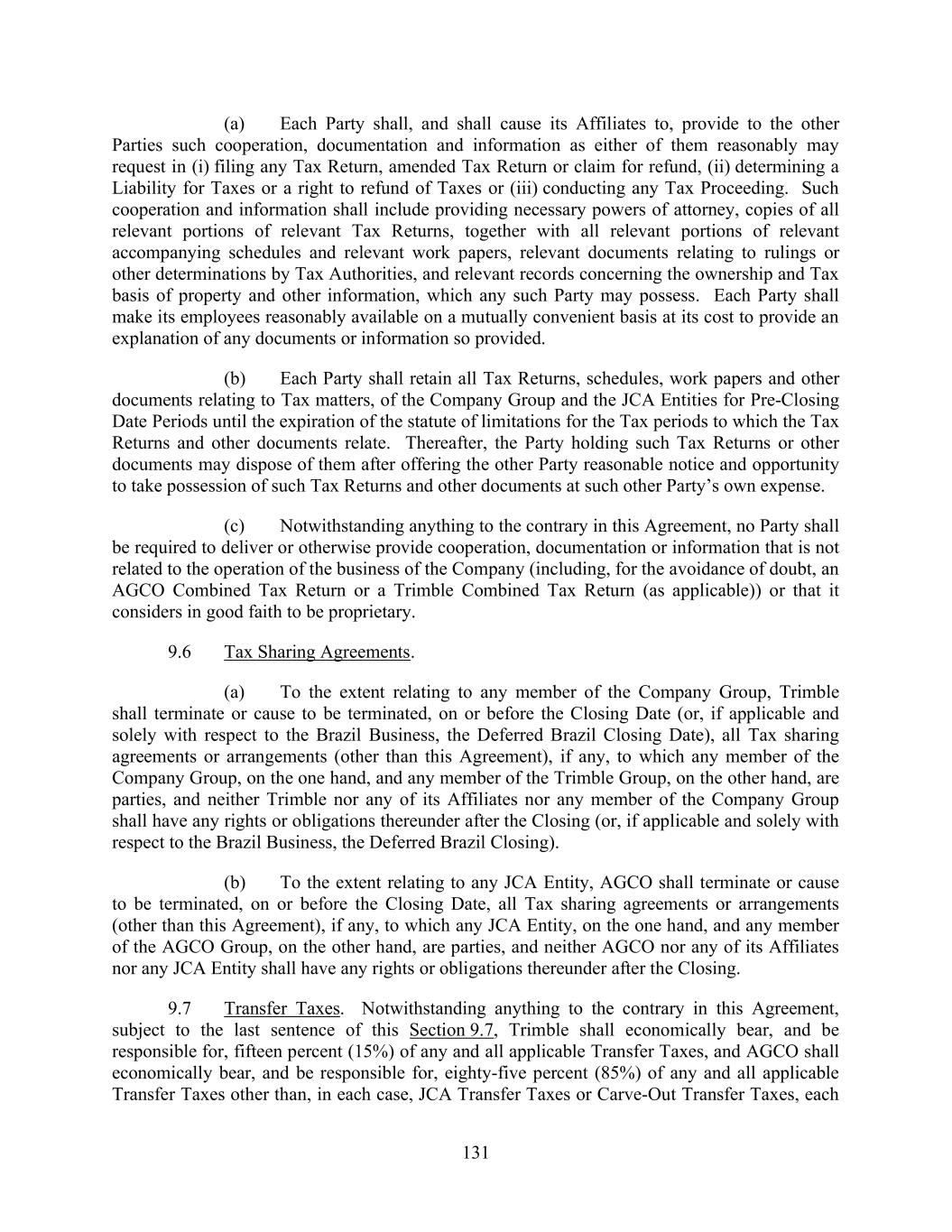 131 (a) Each Party shall, and shall cause its Affiliates to, provide to the other Parties such cooperation, documentation and information as either of them reasonably may request in (i) filing any Tax Return, amended Tax Return or claim for refund, (ii) determining a Liability for Taxes or a right to refund of Taxes or (iii) conducting any Tax Proceeding. Such cooperation and information shall include providing necessary powers of attorney, copies of all relevant portions of relevant Tax Returns, together with all relevant portions of relevant accompanying schedules and relevant work papers, relevant documents relating to rulings or other determinations by Tax Authorities, and relevant records concerning the ownership and Tax basis of property and other information, which any such Party may possess. Each Party shall make its employees reasonably available on a mutually convenient basis at its cost to provide an explanation of any documents or information so provided. (b) Each Party shall retain all Tax Returns, schedules, work papers and other documents relating to Tax matters, of the Company Group and the JCA Entities for Pre-Closing Date Periods until the expiration of the statute of limitations for the Tax periods to which the Tax Returns and other documents relate. Thereafter, the Party holding such Tax Returns or other documents may dispose of them after offering the other Party reasonable notice and opportunity to take possession of such Tax Returns and other documents at such other Party’s own expense. (c) Notwithstanding anything to the contrary in this Agreement, no Party shall be required to deliver or otherwise provide cooperation, documentation or information that is not related to the operation of the business of the Company (including, for the avoidance of doubt, an AGCO Combined Tax Return or a Trimble Combined Tax Return (as applicable)) or that it considers in good faith to be proprietary. 9.6 Tax Sharing Agreements. (a) To the extent relating to any member of the Company Group, Trimble shall terminate or cause to be terminated, on or before the Closing Date (or, if applicable and solely with respect to the Brazil Business, the Deferred Brazil Closing Date), all Tax sharing agreements or arrangements (other than this Agreement), if any, to which any member of the Company Group, on the one hand, and any member of the Trimble Group, on the other hand, are parties, and neither Trimble nor any of its Affiliates nor any member of the Company Group shall have any rights or obligations thereunder after the Closing (or, if applicable and solely with respect to the Brazil Business, the Deferred Brazil Closing). (b) To the extent relating to any JCA Entity, AGCO shall terminate or cause to be terminated, on or before the Closing Date, all Tax sharing agreements or arrangements (other than this Agreement), if any, to which any JCA Entity, on the one hand, and any member of the AGCO Group, on the other hand, are parties, and neither AGCO nor any of its Affiliates nor any JCA Entity shall have any rights or obligations thereunder after the Closing. 9.7 Transfer Taxes. Notwithstanding anything to the contrary in this Agreement, subject to the last sentence of this Section 9.7, Trimble shall economically bear, and be responsible for, fifteen percent (15%) of any and all applicable Transfer Taxes, and AGCO shall economically bear, and be responsible for, eighty-five percent (85%) of any and all applicable Transfer Taxes other than, in each case, JCA Transfer Taxes or Carve-Out Transfer Taxes, each