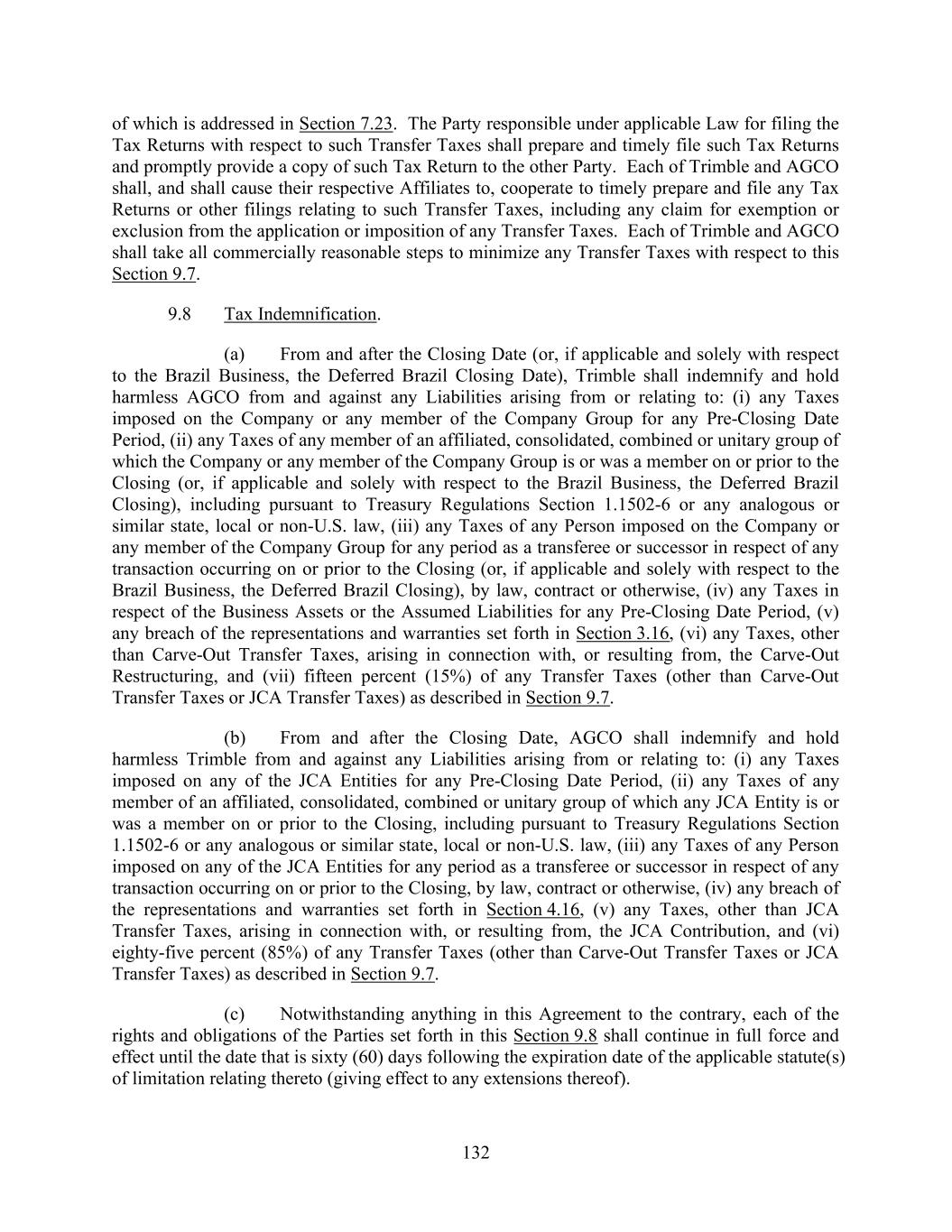 132 of which is addressed in Section 7.23. The Party responsible under applicable Law for filing the Tax Returns with respect to such Transfer Taxes shall prepare and timely file such Tax Returns and promptly provide a copy of such Tax Return to the other Party. Each of Trimble and AGCO shall, and shall cause their respective Affiliates to, cooperate to timely prepare and file any Tax Returns or other filings relating to such Transfer Taxes, including any claim for exemption or exclusion from the application or imposition of any Transfer Taxes. Each of Trimble and AGCO shall take all commercially reasonable steps to minimize any Transfer Taxes with respect to this Section 9.7. 9.8 Tax Indemnification. (a) From and after the Closing Date (or, if applicable and solely with respect to the Brazil Business, the Deferred Brazil Closing Date), Trimble shall indemnify and hold harmless AGCO from and against any Liabilities arising from or relating to: (i) any Taxes imposed on the Company or any member of the Company Group for any Pre-Closing Date Period, (ii) any Taxes of any member of an affiliated, consolidated, combined or unitary group of which the Company or any member of the Company Group is or was a member on or prior to the Closing (or, if applicable and solely with respect to the Brazil Business, the Deferred Brazil Closing), including pursuant to Treasury Regulations Section 1.1502-6 or any analogous or similar state, local or non-U.S. law, (iii) any Taxes of any Person imposed on the Company or any member of the Company Group for any period as a transferee or successor in respect of any transaction occurring on or prior to the Closing (or, if applicable and solely with respect to the Brazil Business, the Deferred Brazil Closing), by law, contract or otherwise, (iv) any Taxes in respect of the Business Assets or the Assumed Liabilities for any Pre-Closing Date Period, (v) any breach of the representations and warranties set forth in Section 3.16, (vi) any Taxes, other than Carve-Out Transfer Taxes, arising in connection with, or resulting from, the Carve-Out Restructuring, and (vii) fifteen percent (15%) of any Transfer Taxes (other than Carve-Out Transfer Taxes or JCA Transfer Taxes) as described in Section 9.7. (b) From and after the Closing Date, AGCO shall indemnify and hold harmless Trimble from and against any Liabilities arising from or relating to: (i) any Taxes imposed on any of the JCA Entities for any Pre-Closing Date Period, (ii) any Taxes of any member of an affiliated, consolidated, combined or unitary group of which any JCA Entity is or was a member on or prior to the Closing, including pursuant to Treasury Regulations Section 1.1502-6 or any analogous or similar state, local or non-U.S. law, (iii) any Taxes of any Person imposed on any of the JCA Entities for any period as a transferee or successor in respect of any transaction occurring on or prior to the Closing, by law, contract or otherwise, (iv) any breach of the representations and warranties set forth in Section 4.16, (v) any Taxes, other than JCA Transfer Taxes, arising in connection with, or resulting from, the JCA Contribution, and (vi) eighty-five percent (85%) of any Transfer Taxes (other than Carve-Out Transfer Taxes or JCA Transfer Taxes) as described in Section 9.7. (c) Notwithstanding anything in this Agreement to the contrary, each of the rights and obligations of the Parties set forth in this Section 9.8 shall continue in full force and effect until the date that is sixty (60) days following the expiration date of the applicable statute(s) of limitation relating thereto (giving effect to any extensions thereof).