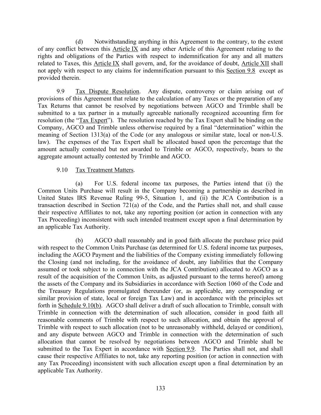 133 (d) Notwithstanding anything in this Agreement to the contrary, to the extent of any conflict between this Article IX and any other Article of this Agreement relating to the rights and obligations of the Parties with respect to indemnification for any and all matters related to Taxes, this Article IX shall govern, and, for the avoidance of doubt, Article XII shall not apply with respect to any claims for indemnification pursuant to this Section 9.8 except as provided therein. 9.9 Tax Dispute Resolution. Any dispute, controversy or claim arising out of provisions of this Agreement that relate to the calculation of any Taxes or the preparation of any Tax Returns that cannot be resolved by negotiations between AGCO and Trimble shall be submitted to a tax partner in a mutually agreeable nationally recognized accounting firm for resolution (the “Tax Expert”). The resolution reached by the Tax Expert shall be binding on the Company, AGCO and Trimble unless otherwise required by a final “determination” within the meaning of Section 1313(a) of the Code (or any analogous or similar state, local or non-U.S. law). The expenses of the Tax Expert shall be allocated based upon the percentage that the amount actually contested but not awarded to Trimble or AGCO, respectively, bears to the aggregate amount actually contested by Trimble and AGCO. 9.10 Tax Treatment Matters. (a) For U.S. federal income tax purposes, the Parties intend that (i) the Common Units Purchase will result in the Company becoming a partnership as described in United States IRS Revenue Ruling 99-5, Situation 1, and (ii) the JCA Contribution is a transaction described in Section 721(a) of the Code, and the Parties shall not, and shall cause their respective Affiliates to not, take any reporting position (or action in connection with any Tax Proceeding) inconsistent with such intended treatment except upon a final determination by an applicable Tax Authority. (b) AGCO shall reasonably and in good faith allocate the purchase price paid with respect to the Common Units Purchase (as determined for U.S. federal income tax purposes, including the AGCO Payment and the liabilities of the Company existing immediately following the Closing (and not including, for the avoidance of doubt, any liabilities that the Company assumed or took subject to in connection with the JCA Contribution) allocated to AGCO as a result of the acquisition of the Common Units, as adjusted pursuant to the terms hereof) among the assets of the Company and its Subsidiaries in accordance with Section 1060 of the Code and the Treasury Regulations promulgated thereunder (or, as applicable, any corresponding or similar provision of state, local or foreign Tax Law) and in accordance with the principles set forth in Schedule 9.10(b). AGCO shall deliver a draft of such allocation to Trimble, consult with Trimble in connection with the determination of such allocation, consider in good faith all reasonable comments of Trimble with respect to such allocation, and obtain the approval of Trimble with respect to such allocation (not to be unreasonably withheld, delayed or condition), and any dispute between AGCO and Trimble in connection with the determination of such allocation that cannot be resolved by negotiations between AGCO and Trimble shall be submitted to the Tax Expert in accordance with Section 9.9. The Parties shall not, and shall cause their respective Affiliates to not, take any reporting position (or action in connection with any Tax Proceeding) inconsistent with such allocation except upon a final determination by an applicable Tax Authority.