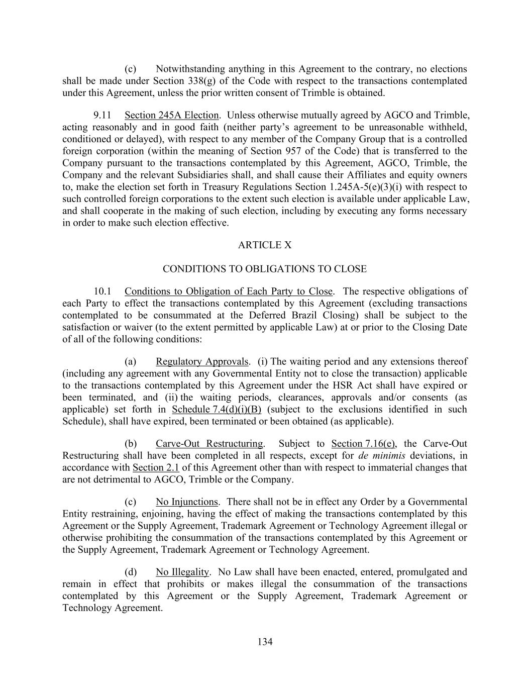 134 (c) Notwithstanding anything in this Agreement to the contrary, no elections shall be made under Section 338(g) of the Code with respect to the transactions contemplated under this Agreement, unless the prior written consent of Trimble is obtained. 9.11 Section 245A Election. Unless otherwise mutually agreed by AGCO and Trimble, acting reasonably and in good faith (neither party’s agreement to be unreasonable withheld, conditioned or delayed), with respect to any member of the Company Group that is a controlled foreign corporation (within the meaning of Section 957 of the Code) that is transferred to the Company pursuant to the transactions contemplated by this Agreement, AGCO, Trimble, the Company and the relevant Subsidiaries shall, and shall cause their Affiliates and equity owners to, make the election set forth in Treasury Regulations Section 1.245A-5(e)(3)(i) with respect to such controlled foreign corporations to the extent such election is available under applicable Law, and shall cooperate in the making of such election, including by executing any forms necessary in order to make such election effective. ARTICLE X CONDITIONS TO OBLIGATIONS TO CLOSE 10.1 Conditions to Obligation of Each Party to Close. The respective obligations of each Party to effect the transactions contemplated by this Agreement (excluding transactions contemplated to be consummated at the Deferred Brazil Closing) shall be subject to the satisfaction or waiver (to the extent permitted by applicable Law) at or prior to the Closing Date of all of the following conditions: (a) Regulatory Approvals. (i) The waiting period and any extensions thereof (including any agreement with any Governmental Entity not to close the transaction) applicable to the transactions contemplated by this Agreement under the HSR Act shall have expired or been terminated, and (ii) the waiting periods, clearances, approvals and/or consents (as applicable) set forth in Schedule 7.4(d)(i)(B) (subject to the exclusions identified in such Schedule), shall have expired, been terminated or been obtained (as applicable). (b) Carve-Out Restructuring. Subject to Section 7.16(e), the Carve-Out Restructuring shall have been completed in all respects, except for de minimis deviations, in accordance with Section 2.1 of this Agreement other than with respect to immaterial changes that are not detrimental to AGCO, Trimble or the Company. (c) No Injunctions. There shall not be in effect any Order by a Governmental Entity restraining, enjoining, having the effect of making the transactions contemplated by this Agreement or the Supply Agreement, Trademark Agreement or Technology Agreement illegal or otherwise prohibiting the consummation of the transactions contemplated by this Agreement or the Supply Agreement, Trademark Agreement or Technology Agreement. (d) No Illegality. No Law shall have been enacted, entered, promulgated and remain in effect that prohibits or makes illegal the consummation of the transactions contemplated by this Agreement or the Supply Agreement, Trademark Agreement or Technology Agreement.