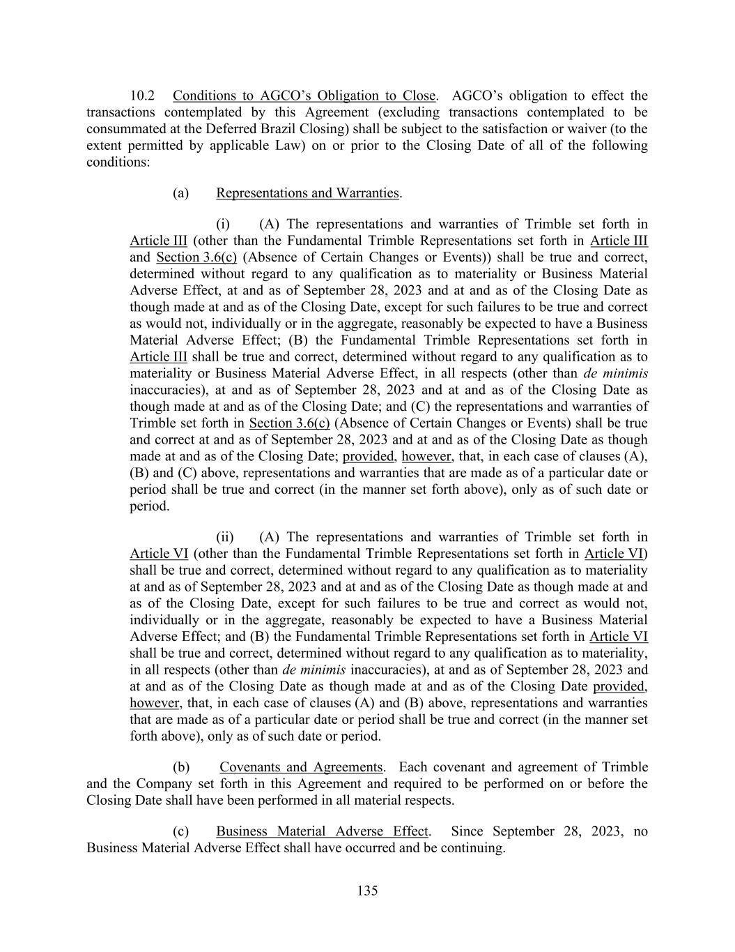 135 10.2 Conditions to AGCO’s Obligation to Close. AGCO’s obligation to effect the transactions contemplated by this Agreement (excluding transactions contemplated to be consummated at the Deferred Brazil Closing) shall be subject to the satisfaction or waiver (to the extent permitted by applicable Law) on or prior to the Closing Date of all of the following conditions: (a) Representations and Warranties. (i) (A) The representations and warranties of Trimble set forth in Article III (other than the Fundamental Trimble Representations set forth in Article III and Section 3.6(c) (Absence of Certain Changes or Events)) shall be true and correct, determined without regard to any qualification as to materiality or Business Material Adverse Effect, at and as of September 28, 2023 and at and as of the Closing Date as though made at and as of the Closing Date, except for such failures to be true and correct as would not, individually or in the aggregate, reasonably be expected to have a Business Material Adverse Effect; (B) the Fundamental Trimble Representations set forth in Article III shall be true and correct, determined without regard to any qualification as to materiality or Business Material Adverse Effect, in all respects (other than de minimis inaccuracies), at and as of September 28, 2023 and at and as of the Closing Date as though made at and as of the Closing Date; and (C) the representations and warranties of Trimble set forth in Section 3.6(c) (Absence of Certain Changes or Events) shall be true and correct at and as of September 28, 2023 and at and as of the Closing Date as though made at and as of the Closing Date; provided, however, that, in each case of clauses (A), (B) and (C) above, representations and warranties that are made as of a particular date or period shall be true and correct (in the manner set forth above), only as of such date or period. (ii) (A) The representations and warranties of Trimble set forth in Article VI (other than the Fundamental Trimble Representations set forth in Article VI) shall be true and correct, determined without regard to any qualification as to materiality at and as of September 28, 2023 and at and as of the Closing Date as though made at and as of the Closing Date, except for such failures to be true and correct as would not, individually or in the aggregate, reasonably be expected to have a Business Material Adverse Effect; and (B) the Fundamental Trimble Representations set forth in Article VI shall be true and correct, determined without regard to any qualification as to materiality, in all respects (other than de minimis inaccuracies), at and as of September 28, 2023 and at and as of the Closing Date as though made at and as of the Closing Date provided, however, that, in each case of clauses (A) and (B) above, representations and warranties that are made as of a particular date or period shall be true and correct (in the manner set forth above), only as of such date or period. (b) Covenants and Agreements. Each covenant and agreement of Trimble and the Company set forth in this Agreement and required to be performed on or before the Closing Date shall have been performed in all material respects. (c) Business Material Adverse Effect. Since September 28, 2023, no Business Material Adverse Effect shall have occurred and be continuing.