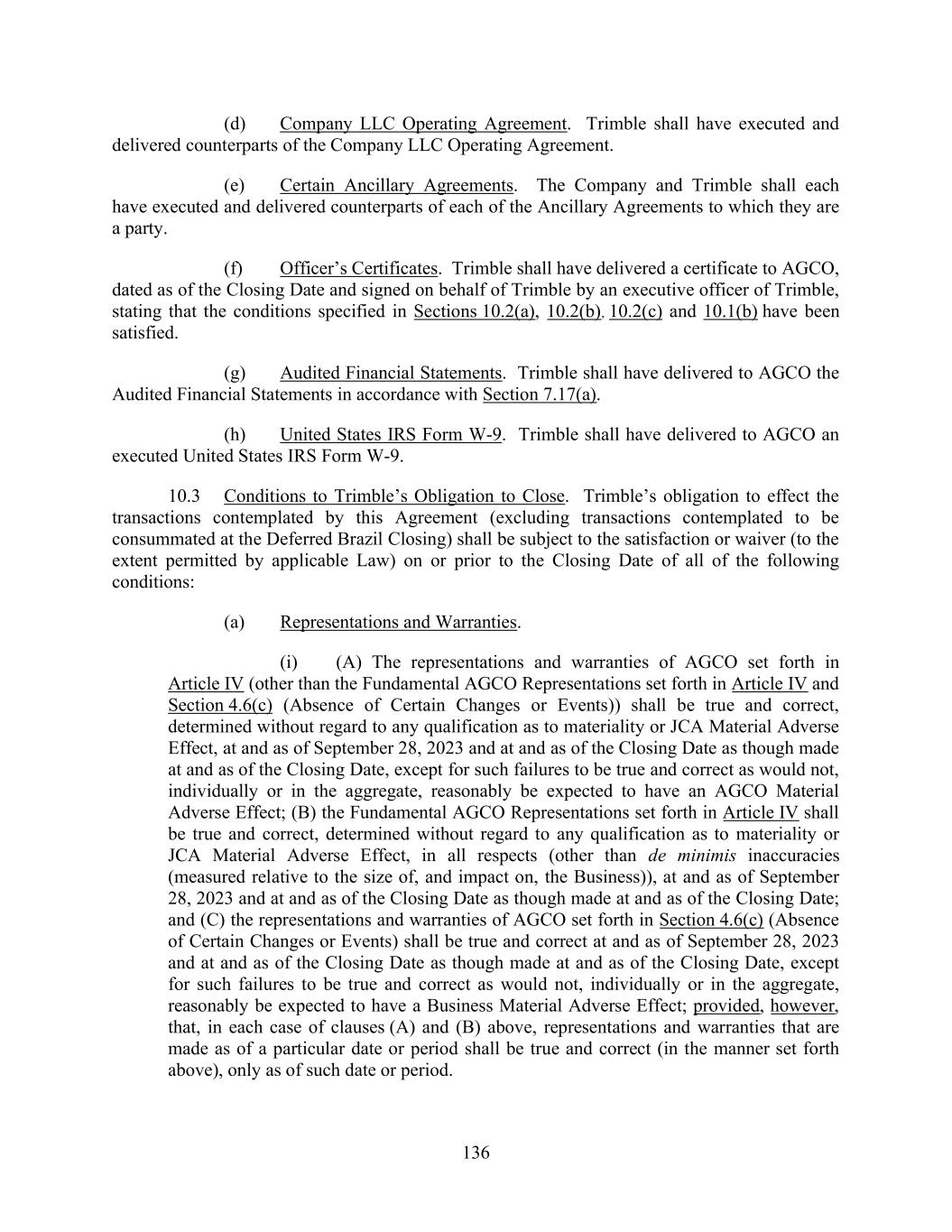 136 (d) Company LLC Operating Agreement. Trimble shall have executed and delivered counterparts of the Company LLC Operating Agreement. (e) Certain Ancillary Agreements. The Company and Trimble shall each have executed and delivered counterparts of each of the Ancillary Agreements to which they are a party. (f) Officer’s Certificates. Trimble shall have delivered a certificate to AGCO, dated as of the Closing Date and signed on behalf of Trimble by an executive officer of Trimble, stating that the conditions specified in Sections 10.2(a), 10.2(b), 10.2(c) and 10.1(b) have been satisfied. (g) Audited Financial Statements. Trimble shall have delivered to AGCO the Audited Financial Statements in accordance with Section 7.17(a). (h) United States IRS Form W-9. Trimble shall have delivered to AGCO an executed United States IRS Form W-9. 10.3 Conditions to Trimble’s Obligation to Close. Trimble’s obligation to effect the transactions contemplated by this Agreement (excluding transactions contemplated to be consummated at the Deferred Brazil Closing) shall be subject to the satisfaction or waiver (to the extent permitted by applicable Law) on or prior to the Closing Date of all of the following conditions: (a) Representations and Warranties. (i) (A) The representations and warranties of AGCO set forth in Article IV (other than the Fundamental AGCO Representations set forth in Article IV and Section 4.6(c) (Absence of Certain Changes or Events)) shall be true and correct, determined without regard to any qualification as to materiality or JCA Material Adverse Effect, at and as of September 28, 2023 and at and as of the Closing Date as though made at and as of the Closing Date, except for such failures to be true and correct as would not, individually or in the aggregate, reasonably be expected to have an AGCO Material Adverse Effect; (B) the Fundamental AGCO Representations set forth in Article IV shall be true and correct, determined without regard to any qualification as to materiality or JCA Material Adverse Effect, in all respects (other than de minimis inaccuracies (measured relative to the size of, and impact on, the Business)), at and as of September 28, 2023 and at and as of the Closing Date as though made at and as of the Closing Date; and (C) the representations and warranties of AGCO set forth in Section 4.6(c) (Absence of Certain Changes or Events) shall be true and correct at and as of September 28, 2023 and at and as of the Closing Date as though made at and as of the Closing Date, except for such failures to be true and correct as would not, individually or in the aggregate, reasonably be expected to have a Business Material Adverse Effect; provided, however, that, in each case of clauses (A) and (B) above, representations and warranties that are made as of a particular date or period shall be true and correct (in the manner set forth above), only as of such date or period.