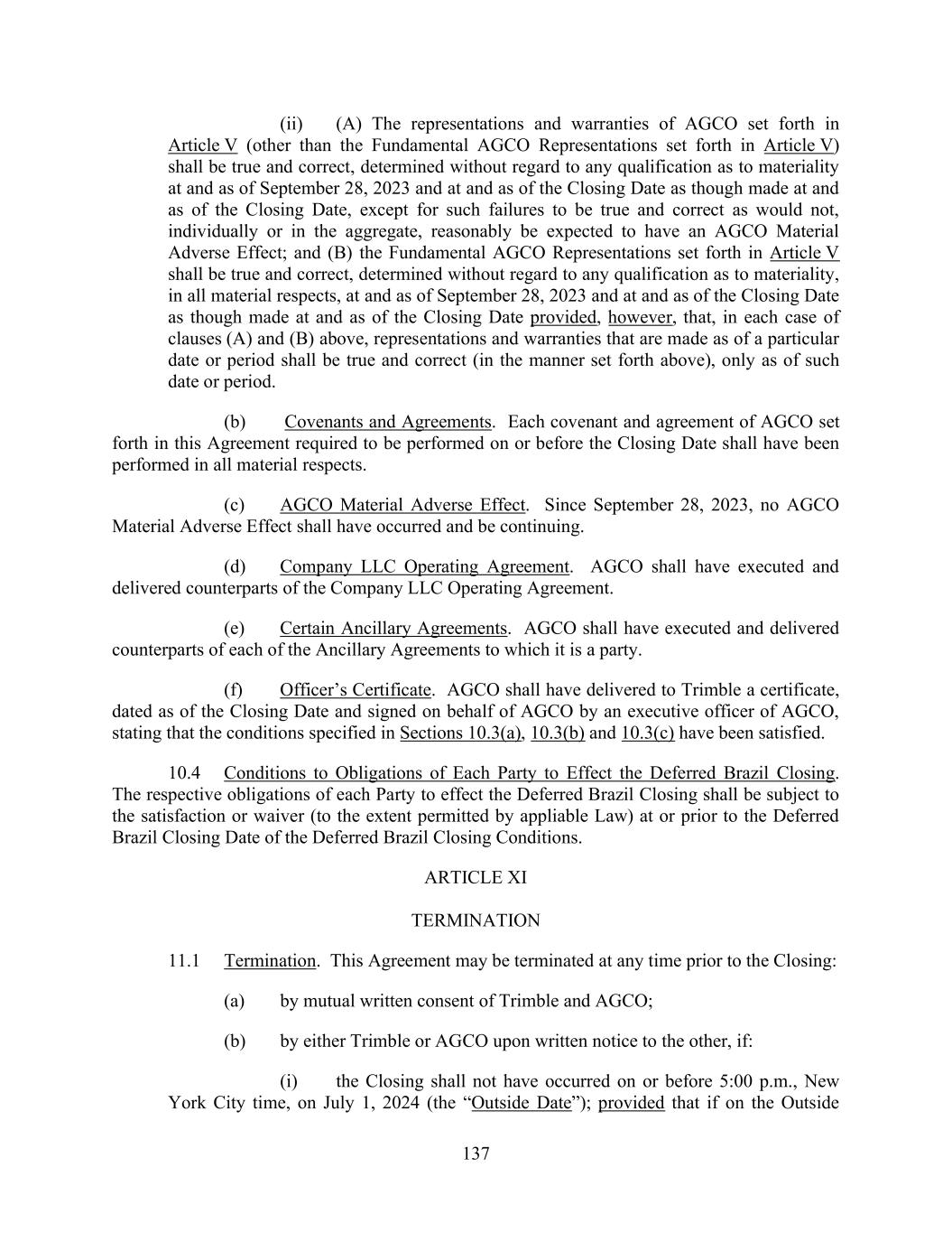 137 (ii) (A) The representations and warranties of AGCO set forth in Article V (other than the Fundamental AGCO Representations set forth in Article V) shall be true and correct, determined without regard to any qualification as to materiality at and as of September 28, 2023 and at and as of the Closing Date as though made at and as of the Closing Date, except for such failures to be true and correct as would not, individually or in the aggregate, reasonably be expected to have an AGCO Material Adverse Effect; and (B) the Fundamental AGCO Representations set forth in Article V shall be true and correct, determined without regard to any qualification as to materiality, in all material respects, at and as of September 28, 2023 and at and as of the Closing Date as though made at and as of the Closing Date provided, however, that, in each case of clauses (A) and (B) above, representations and warranties that are made as of a particular date or period shall be true and correct (in the manner set forth above), only as of such date or period. (b) Covenants and Agreements. Each covenant and agreement of AGCO set forth in this Agreement required to be performed on or before the Closing Date shall have been performed in all material respects. (c) AGCO Material Adverse Effect. Since September 28, 2023, no AGCO Material Adverse Effect shall have occurred and be continuing. (d) Company LLC Operating Agreement. AGCO shall have executed and delivered counterparts of the Company LLC Operating Agreement. (e) Certain Ancillary Agreements. AGCO shall have executed and delivered counterparts of each of the Ancillary Agreements to which it is a party. (f) Officer’s Certificate. AGCO shall have delivered to Trimble a certificate, dated as of the Closing Date and signed on behalf of AGCO by an executive officer of AGCO, stating that the conditions specified in Sections 10.3(a), 10.3(b) and 10.3(c) have been satisfied. 10.4 Conditions to Obligations of Each Party to Effect the Deferred Brazil Closing. The respective obligations of each Party to effect the Deferred Brazil Closing shall be subject to the satisfaction or waiver (to the extent permitted by appliable Law) at or prior to the Deferred Brazil Closing Date of the Deferred Brazil Closing Conditions. ARTICLE XI TERMINATION 11.1 Termination. This Agreement may be terminated at any time prior to the Closing: (a) by mutual written consent of Trimble and AGCO; (b) by either Trimble or AGCO upon written notice to the other, if: (i) the Closing shall not have occurred on or before 5:00 p.m., New York City time, on July 1, 2024 (the “Outside Date”); provided that if on the Outside