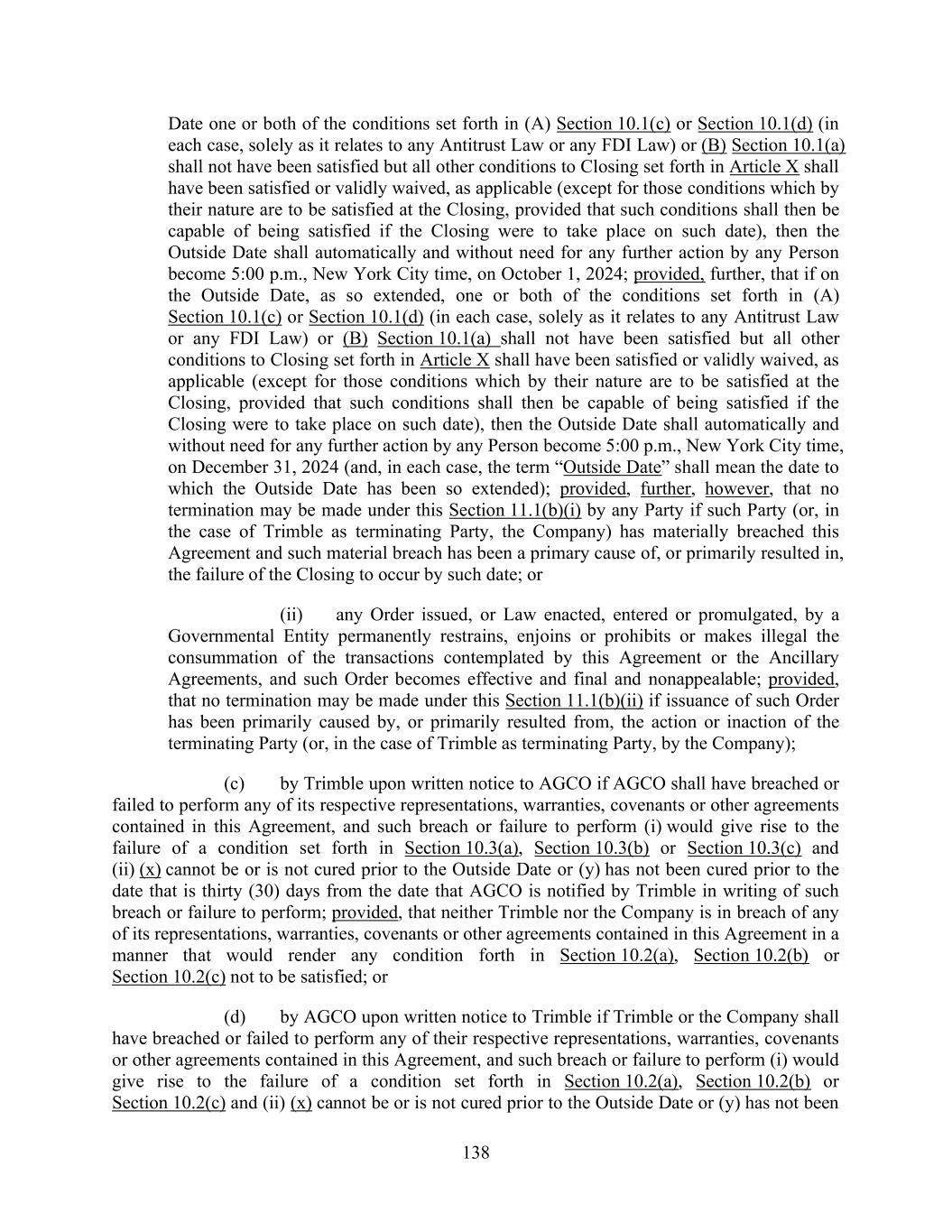 138 Date one or both of the conditions set forth in (A) Section 10.1(c) or Section 10.1(d) (in each case, solely as it relates to any Antitrust Law or any FDI Law) or (B) Section 10.1(a) shall not have been satisfied but all other conditions to Closing set forth in Article X shall have been satisfied or validly waived, as applicable (except for those conditions which by their nature are to be satisfied at the Closing, provided that such conditions shall then be capable of being satisfied if the Closing were to take place on such date), then the Outside Date shall automatically and without need for any further action by any Person become 5:00 p.m., New York City time, on October 1, 2024; provided, further, that if on the Outside Date, as so extended, one or both of the conditions set forth in (A) Section 10.1(c) or Section 10.1(d) (in each case, solely as it relates to any Antitrust Law or any FDI Law) or (B) Section 10.1(a) shall not have been satisfied but all other conditions to Closing set forth in Article X shall have been satisfied or validly waived, as applicable (except for those conditions which by their nature are to be satisfied at the Closing, provided that such conditions shall then be capable of being satisfied if the Closing were to take place on such date), then the Outside Date shall automatically and without need for any further action by any Person become 5:00 p.m., New York City time, on December 31, 2024 (and, in each case, the term “Outside Date” shall mean the date to which the Outside Date has been so extended); provided, further, however, that no termination may be made under this Section 11.1(b)(i) by any Party if such Party (or, in the case of Trimble as terminating Party, the Company) has materially breached this Agreement and such material breach has been a primary cause of, or primarily resulted in, the failure of the Closing to occur by such date; or (ii) any Order issued, or Law enacted, entered or promulgated, by a Governmental Entity permanently restrains, enjoins or prohibits or makes illegal the consummation of the transactions contemplated by this Agreement or the Ancillary Agreements, and such Order becomes effective and final and nonappealable; provided, that no termination may be made under this Section 11.1(b)(ii) if issuance of such Order has been primarily caused by, or primarily resulted from, the action or inaction of the terminating Party (or, in the case of Trimble as terminating Party, by the Company); (c) by Trimble upon written notice to AGCO if AGCO shall have breached or failed to perform any of its respective representations, warranties, covenants or other agreements contained in this Agreement, and such breach or failure to perform (i) would give rise to the failure of a condition set forth in Section 10.3(a), Section 10.3(b) or Section 10.3(c) and (ii) (x) cannot be or is not cured prior to the Outside Date or (y) has not been cured prior to the date that is thirty (30) days from the date that AGCO is notified by Trimble in writing of such breach or failure to perform; provided, that neither Trimble nor the Company is in breach of any of its representations, warranties, covenants or other agreements contained in this Agreement in a manner that would render any condition forth in Section 10.2(a), Section 10.2(b) or Section 10.2(c) not to be satisfied; or (d) by AGCO upon written notice to Trimble if Trimble or the Company shall have breached or failed to perform any of their respective representations, warranties, covenants or other agreements contained in this Agreement, and such breach or failure to perform (i) would give rise to the failure of a condition set forth in Section 10.2(a), Section 10.2(b) or Section 10.2(c) and (ii) (x) cannot be or is not cured prior to the Outside Date or (y) has not been