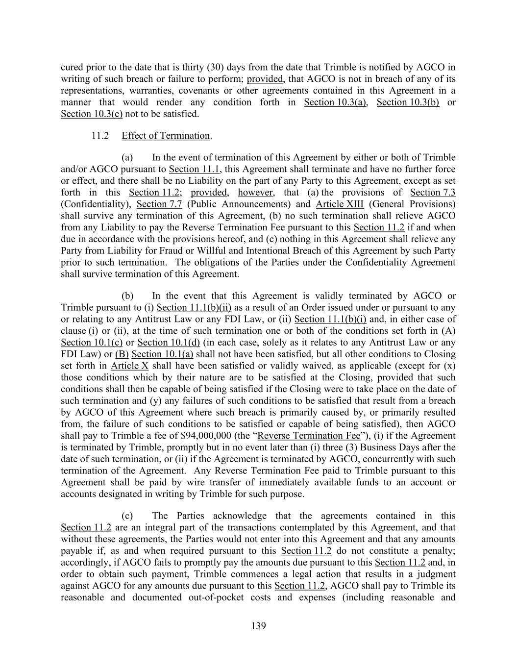 139 cured prior to the date that is thirty (30) days from the date that Trimble is notified by AGCO in writing of such breach or failure to perform; provided, that AGCO is not in breach of any of its representations, warranties, covenants or other agreements contained in this Agreement in a manner that would render any condition forth in Section 10.3(a), Section 10.3(b) or Section 10.3(c) not to be satisfied. 11.2 Effect of Termination. (a) In the event of termination of this Agreement by either or both of Trimble and/or AGCO pursuant to Section 11.1, this Agreement shall terminate and have no further force or effect, and there shall be no Liability on the part of any Party to this Agreement, except as set forth in this Section 11.2; provided, however, that (a) the provisions of Section 7.3 (Confidentiality), Section 7.7 (Public Announcements) and Article XIII (General Provisions) shall survive any termination of this Agreement, (b) no such termination shall relieve AGCO from any Liability to pay the Reverse Termination Fee pursuant to this Section 11.2 if and when due in accordance with the provisions hereof, and (c) nothing in this Agreement shall relieve any Party from Liability for Fraud or Willful and Intentional Breach of this Agreement by such Party prior to such termination. The obligations of the Parties under the Confidentiality Agreement shall survive termination of this Agreement. (b) In the event that this Agreement is validly terminated by AGCO or Trimble pursuant to (i) Section 11.1(b)(ii) as a result of an Order issued under or pursuant to any or relating to any Antitrust Law or any FDI Law, or (ii) Section 11.1(b)(i) and, in either case of clause (i) or (ii), at the time of such termination one or both of the conditions set forth in (A) Section 10.1(c) or Section 10.1(d) (in each case, solely as it relates to any Antitrust Law or any FDI Law) or (B) Section 10.1(a) shall not have been satisfied, but all other conditions to Closing set forth in Article X shall have been satisfied or validly waived, as applicable (except for (x) those conditions which by their nature are to be satisfied at the Closing, provided that such conditions shall then be capable of being satisfied if the Closing were to take place on the date of such termination and (y) any failures of such conditions to be satisfied that result from a breach by AGCO of this Agreement where such breach is primarily caused by, or primarily resulted from, the failure of such conditions to be satisfied or capable of being satisfied), then AGCO shall pay to Trimble a fee of $94,000,000 (the “Reverse Termination Fee”), (i) if the Agreement is terminated by Trimble, promptly but in no event later than (i) three (3) Business Days after the date of such termination, or (ii) if the Agreement is terminated by AGCO, concurrently with such termination of the Agreement. Any Reverse Termination Fee paid to Trimble pursuant to this Agreement shall be paid by wire transfer of immediately available funds to an account or accounts designated in writing by Trimble for such purpose. (c) The Parties acknowledge that the agreements contained in this Section 11.2 are an integral part of the transactions contemplated by this Agreement, and that without these agreements, the Parties would not enter into this Agreement and that any amounts payable if, as and when required pursuant to this Section 11.2 do not constitute a penalty; accordingly, if AGCO fails to promptly pay the amounts due pursuant to this Section 11.2 and, in order to obtain such payment, Trimble commences a legal action that results in a judgment against AGCO for any amounts due pursuant to this Section 11.2, AGCO shall pay to Trimble its reasonable and documented out-of-pocket costs and expenses (including reasonable and