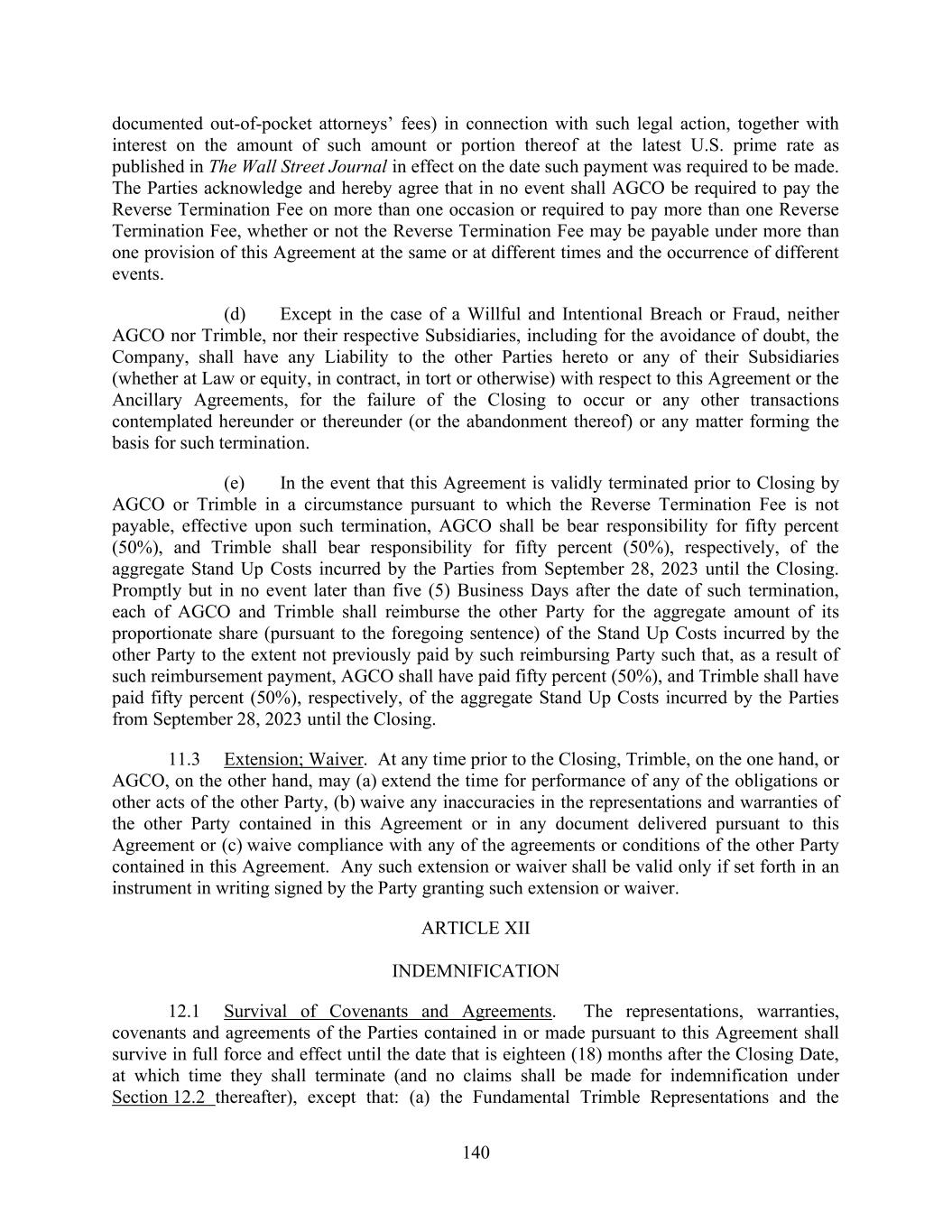 140 documented out-of-pocket attorneys’ fees) in connection with such legal action, together with interest on the amount of such amount or portion thereof at the latest U.S. prime rate as published in The Wall Street Journal in effect on the date such payment was required to be made. The Parties acknowledge and hereby agree that in no event shall AGCO be required to pay the Reverse Termination Fee on more than one occasion or required to pay more than one Reverse Termination Fee, whether or not the Reverse Termination Fee may be payable under more than one provision of this Agreement at the same or at different times and the occurrence of different events. (d) Except in the case of a Willful and Intentional Breach or Fraud, neither AGCO nor Trimble, nor their respective Subsidiaries, including for the avoidance of doubt, the Company, shall have any Liability to the other Parties hereto or any of their Subsidiaries (whether at Law or equity, in contract, in tort or otherwise) with respect to this Agreement or the Ancillary Agreements, for the failure of the Closing to occur or any other transactions contemplated hereunder or thereunder (or the abandonment thereof) or any matter forming the basis for such termination. (e) In the event that this Agreement is validly terminated prior to Closing by AGCO or Trimble in a circumstance pursuant to which the Reverse Termination Fee is not payable, effective upon such termination, AGCO shall be bear responsibility for fifty percent (50%), and Trimble shall bear responsibility for fifty percent (50%), respectively, of the aggregate Stand Up Costs incurred by the Parties from September 28, 2023 until the Closing. Promptly but in no event later than five (5) Business Days after the date of such termination, each of AGCO and Trimble shall reimburse the other Party for the aggregate amount of its proportionate share (pursuant to the foregoing sentence) of the Stand Up Costs incurred by the other Party to the extent not previously paid by such reimbursing Party such that, as a result of such reimbursement payment, AGCO shall have paid fifty percent (50%), and Trimble shall have paid fifty percent (50%), respectively, of the aggregate Stand Up Costs incurred by the Parties from September 28, 2023 until the Closing. 11.3 Extension; Waiver. At any time prior to the Closing, Trimble, on the one hand, or AGCO, on the other hand, may (a) extend the time for performance of any of the obligations or other acts of the other Party, (b) waive any inaccuracies in the representations and warranties of the other Party contained in this Agreement or in any document delivered pursuant to this Agreement or (c) waive compliance with any of the agreements or conditions of the other Party contained in this Agreement. Any such extension or waiver shall be valid only if set forth in an instrument in writing signed by the Party granting such extension or waiver. ARTICLE XII INDEMNIFICATION 12.1 Survival of Covenants and Agreements. The representations, warranties, covenants and agreements of the Parties contained in or made pursuant to this Agreement shall survive in full force and effect until the date that is eighteen (18) months after the Closing Date, at which time they shall terminate (and no claims shall be made for indemnification under Section 12.2 thereafter), except that: (a) the Fundamental Trimble Representations and the