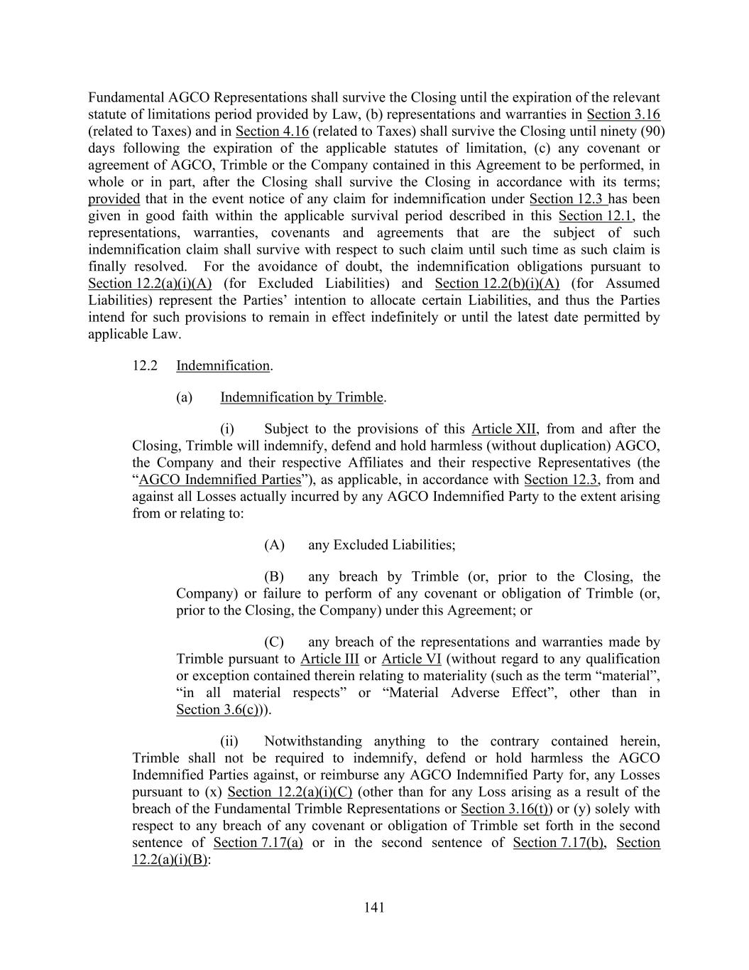 141 Fundamental AGCO Representations shall survive the Closing until the expiration of the relevant statute of limitations period provided by Law, (b) representations and warranties in Section 3.16 (related to Taxes) and in Section 4.16 (related to Taxes) shall survive the Closing until ninety (90) days following the expiration of the applicable statutes of limitation, (c) any covenant or agreement of AGCO, Trimble or the Company contained in this Agreement to be performed, in whole or in part, after the Closing shall survive the Closing in accordance with its terms; provided that in the event notice of any claim for indemnification under Section 12.3 has been given in good faith within the applicable survival period described in this Section 12.1, the representations, warranties, covenants and agreements that are the subject of such indemnification claim shall survive with respect to such claim until such time as such claim is finally resolved. For the avoidance of doubt, the indemnification obligations pursuant to Section 12.2(a)(i)(A) (for Excluded Liabilities) and Section 12.2(b)(i)(A) (for Assumed Liabilities) represent the Parties’ intention to allocate certain Liabilities, and thus the Parties intend for such provisions to remain in effect indefinitely or until the latest date permitted by applicable Law. 12.2 Indemnification. (a) Indemnification by Trimble. (i) Subject to the provisions of this Article XII, from and after the Closing, Trimble will indemnify, defend and hold harmless (without duplication) AGCO, the Company and their respective Affiliates and their respective Representatives (the “AGCO Indemnified Parties”), as applicable, in accordance with Section 12.3, from and against all Losses actually incurred by any AGCO Indemnified Party to the extent arising from or relating to: (A) any Excluded Liabilities; (B) any breach by Trimble (or, prior to the Closing, the Company) or failure to perform of any covenant or obligation of Trimble (or, prior to the Closing, the Company) under this Agreement; or (C) any breach of the representations and warranties made by Trimble pursuant to Article III or Article VI (without regard to any qualification or exception contained therein relating to materiality (such as the term “material”, “in all material respects” or “Material Adverse Effect”, other than in Section 3.6(c))). (ii) Notwithstanding anything to the contrary contained herein, Trimble shall not be required to indemnify, defend or hold harmless the AGCO Indemnified Parties against, or reimburse any AGCO Indemnified Party for, any Losses pursuant to (x) Section 12.2(a)(i)(C) (other than for any Loss arising as a result of the breach of the Fundamental Trimble Representations or Section 3.16(t)) or (y) solely with respect to any breach of any covenant or obligation of Trimble set forth in the second sentence of Section 7.17(a) or in the second sentence of Section 7.17(b), Section 12.2(a)(i)(B):