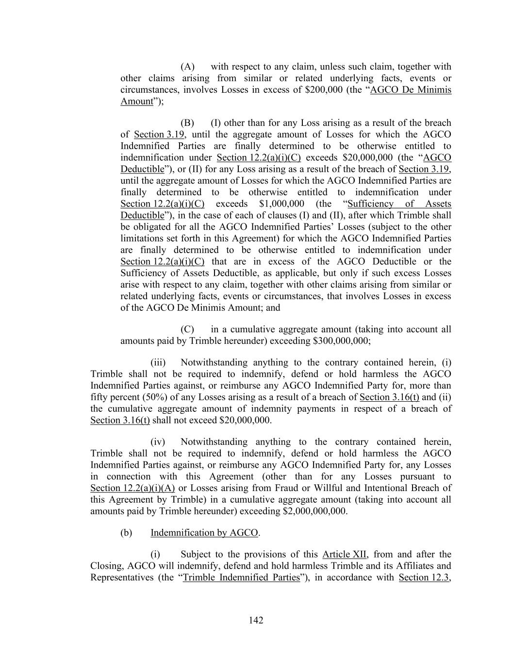 142 (A) with respect to any claim, unless such claim, together with other claims arising from similar or related underlying facts, events or circumstances, involves Losses in excess of $200,000 (the “AGCO De Minimis Amount”); (B) (I) other than for any Loss arising as a result of the breach of Section 3.19, until the aggregate amount of Losses for which the AGCO Indemnified Parties are finally determined to be otherwise entitled to indemnification under Section 12.2(a)(i)(C) exceeds $20,000,000 (the “AGCO Deductible”), or (II) for any Loss arising as a result of the breach of Section 3.19, until the aggregate amount of Losses for which the AGCO Indemnified Parties are finally determined to be otherwise entitled to indemnification under Section 12.2(a)(i)(C) exceeds $1,000,000 (the “Sufficiency of Assets Deductible”), in the case of each of clauses (I) and (II), after which Trimble shall be obligated for all the AGCO Indemnified Parties’ Losses (subject to the other limitations set forth in this Agreement) for which the AGCO Indemnified Parties are finally determined to be otherwise entitled to indemnification under Section 12.2(a)(i)(C) that are in excess of the AGCO Deductible or the Sufficiency of Assets Deductible, as applicable, but only if such excess Losses arise with respect to any claim, together with other claims arising from similar or related underlying facts, events or circumstances, that involves Losses in excess of the AGCO De Minimis Amount; and (C) in a cumulative aggregate amount (taking into account all amounts paid by Trimble hereunder) exceeding $300,000,000; (iii) Notwithstanding anything to the contrary contained herein, (i) Trimble shall not be required to indemnify, defend or hold harmless the AGCO Indemnified Parties against, or reimburse any AGCO Indemnified Party for, more than fifty percent (50%) of any Losses arising as a result of a breach of Section 3.16(t) and (ii) the cumulative aggregate amount of indemnity payments in respect of a breach of Section 3.16(t) shall not exceed $20,000,000. (iv) Notwithstanding anything to the contrary contained herein, Trimble shall not be required to indemnify, defend or hold harmless the AGCO Indemnified Parties against, or reimburse any AGCO Indemnified Party for, any Losses in connection with this Agreement (other than for any Losses pursuant to Section 12.2(a)(i)(A) or Losses arising from Fraud or Willful and Intentional Breach of this Agreement by Trimble) in a cumulative aggregate amount (taking into account all amounts paid by Trimble hereunder) exceeding $2,000,000,000. (b) Indemnification by AGCO. (i) Subject to the provisions of this Article XII, from and after the Closing, AGCO will indemnify, defend and hold harmless Trimble and its Affiliates and Representatives (the “Trimble Indemnified Parties”), in accordance with Section 12.3,