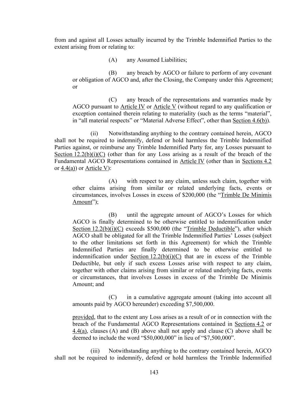 143 from and against all Losses actually incurred by the Trimble Indemnified Parties to the extent arising from or relating to: (A) any Assumed Liabilities; (B) any breach by AGCO or failure to perform of any covenant or obligation of AGCO and, after the Closing, the Company under this Agreement; or (C) any breach of the representations and warranties made by AGCO pursuant to Article IV or Article V (without regard to any qualification or exception contained therein relating to materiality (such as the terms “material”, in “all material respects” or “Material Adverse Effect”, other than Section 4.6(b)). (ii) Notwithstanding anything to the contrary contained herein, AGCO shall not be required to indemnify, defend or hold harmless the Trimble Indemnified Parties against, or reimburse any Trimble Indemnified Party for, any Losses pursuant to Section 12.2(b)(i)(C) (other than for any Loss arising as a result of the breach of the Fundamental AGCO Representations contained in Article IV (other than in Sections 4.2 or 4.4(a)) or Article V): (A) with respect to any claim, unless such claim, together with other claims arising from similar or related underlying facts, events or circumstances, involves Losses in excess of $200,000 (the “Trimble De Minimis Amount”); (B) until the aggregate amount of AGCO’s Losses for which AGCO is finally determined to be otherwise entitled to indemnification under Section 12.2(b)(i)(C) exceeds $500,000 (the “Trimble Deductible”), after which AGCO shall be obligated for all the Trimble Indemnified Parties’ Losses (subject to the other limitations set forth in this Agreement) for which the Trimble Indemnified Parties are finally determined to be otherwise entitled to indemnification under Section 12.2(b)(i)(C) that are in excess of the Trimble Deductible, but only if such excess Losses arise with respect to any claim, together with other claims arising from similar or related underlying facts, events or circumstances, that involves Losses in excess of the Trimble De Minimis Amount; and (C) in a cumulative aggregate amount (taking into account all amounts paid by AGCO hereunder) exceeding $7,500,000. provided, that to the extent any Loss arises as a result of or in connection with the breach of the Fundamental AGCO Representations contained in Sections 4.2 or 4.4(a), clauses (A) and (B) above shall not apply and clause (C) above shall be deemed to include the word “$50,000,000” in lieu of “$7,500,000”. (iii) Notwithstanding anything to the contrary contained herein, AGCO shall not be required to indemnify, defend or hold harmless the Trimble Indemnified
