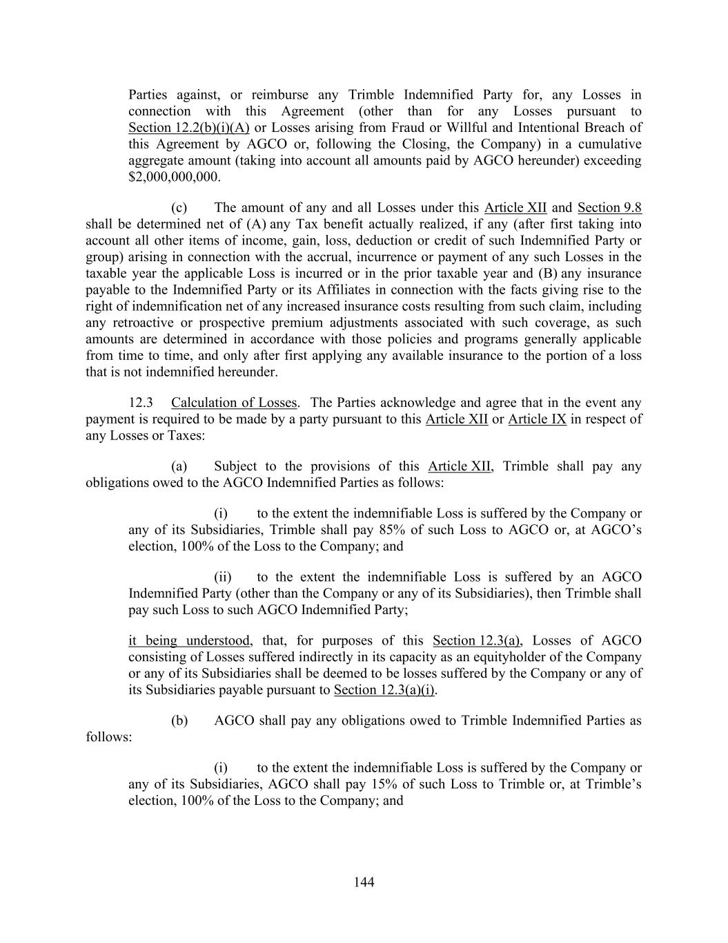 144 Parties against, or reimburse any Trimble Indemnified Party for, any Losses in connection with this Agreement (other than for any Losses pursuant to Section 12.2(b)(i)(A) or Losses arising from Fraud or Willful and Intentional Breach of this Agreement by AGCO or, following the Closing, the Company) in a cumulative aggregate amount (taking into account all amounts paid by AGCO hereunder) exceeding $2,000,000,000. (c) The amount of any and all Losses under this Article XII and Section 9.8 shall be determined net of (A) any Tax benefit actually realized, if any (after first taking into account all other items of income, gain, loss, deduction or credit of such Indemnified Party or group) arising in connection with the accrual, incurrence or payment of any such Losses in the taxable year the applicable Loss is incurred or in the prior taxable year and (B) any insurance payable to the Indemnified Party or its Affiliates in connection with the facts giving rise to the right of indemnification net of any increased insurance costs resulting from such claim, including any retroactive or prospective premium adjustments associated with such coverage, as such amounts are determined in accordance with those policies and programs generally applicable from time to time, and only after first applying any available insurance to the portion of a loss that is not indemnified hereunder. 12.3 Calculation of Losses. The Parties acknowledge and agree that in the event any payment is required to be made by a party pursuant to this Article XII or Article IX in respect of any Losses or Taxes: (a) Subject to the provisions of this Article XII, Trimble shall pay any obligations owed to the AGCO Indemnified Parties as follows: (i) to the extent the indemnifiable Loss is suffered by the Company or any of its Subsidiaries, Trimble shall pay 85% of such Loss to AGCO or, at AGCO’s election, 100% of the Loss to the Company; and (ii) to the extent the indemnifiable Loss is suffered by an AGCO Indemnified Party (other than the Company or any of its Subsidiaries), then Trimble shall pay such Loss to such AGCO Indemnified Party; it being understood, that, for purposes of this Section 12.3(a), Losses of AGCO consisting of Losses suffered indirectly in its capacity as an equityholder of the Company or any of its Subsidiaries shall be deemed to be losses suffered by the Company or any of its Subsidiaries payable pursuant to Section 12.3(a)(i). (b) AGCO shall pay any obligations owed to Trimble Indemnified Parties as follows: (i) to the extent the indemnifiable Loss is suffered by the Company or any of its Subsidiaries, AGCO shall pay 15% of such Loss to Trimble or, at Trimble’s election, 100% of the Loss to the Company; and