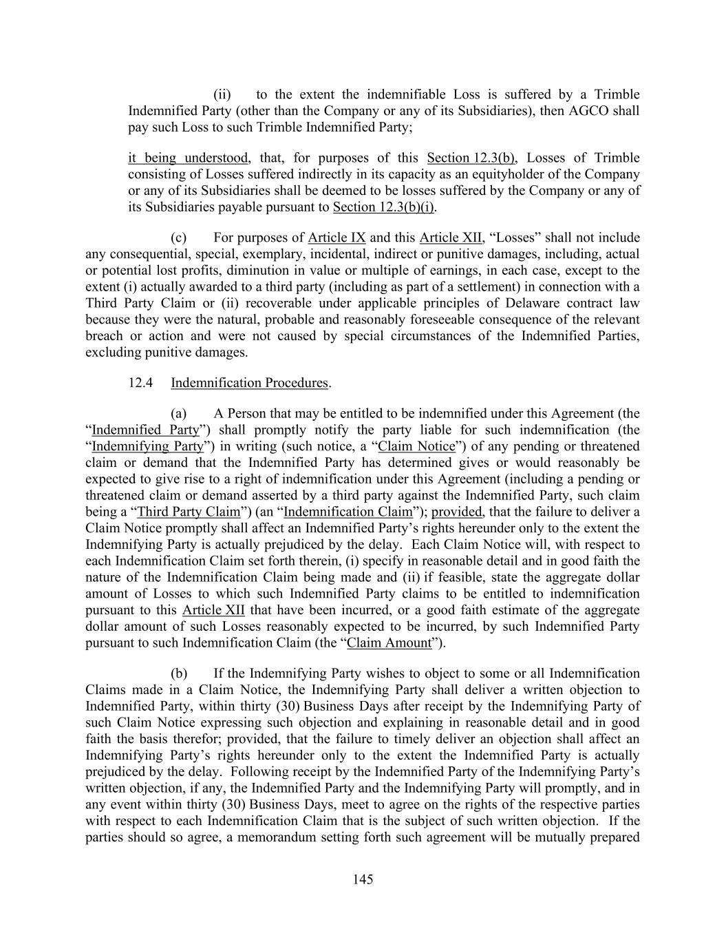 145 (ii) to the extent the indemnifiable Loss is suffered by a Trimble Indemnified Party (other than the Company or any of its Subsidiaries), then AGCO shall pay such Loss to such Trimble Indemnified Party; it being understood, that, for purposes of this Section 12.3(b), Losses of Trimble consisting of Losses suffered indirectly in its capacity as an equityholder of the Company or any of its Subsidiaries shall be deemed to be losses suffered by the Company or any of its Subsidiaries payable pursuant to Section 12.3(b)(i). (c) For purposes of Article IX and this Article XII, “Losses” shall not include any consequential, special, exemplary, incidental, indirect or punitive damages, including, actual or potential lost profits, diminution in value or multiple of earnings, in each case, except to the extent (i) actually awarded to a third party (including as part of a settlement) in connection with a Third Party Claim or (ii) recoverable under applicable principles of Delaware contract law because they were the natural, probable and reasonably foreseeable consequence of the relevant breach or action and were not caused by special circumstances of the Indemnified Parties, excluding punitive damages. 12.4 Indemnification Procedures. (a) A Person that may be entitled to be indemnified under this Agreement (the “Indemnified Party”) shall promptly notify the party liable for such indemnification (the “Indemnifying Party”) in writing (such notice, a “Claim Notice”) of any pending or threatened claim or demand that the Indemnified Party has determined gives or would reasonably be expected to give rise to a right of indemnification under this Agreement (including a pending or threatened claim or demand asserted by a third party against the Indemnified Party, such claim being a “Third Party Claim”) (an “Indemnification Claim”); provided, that the failure to deliver a Claim Notice promptly shall affect an Indemnified Party’s rights hereunder only to the extent the Indemnifying Party is actually prejudiced by the delay. Each Claim Notice will, with respect to each Indemnification Claim set forth therein, (i) specify in reasonable detail and in good faith the nature of the Indemnification Claim being made and (ii) if feasible, state the aggregate dollar amount of Losses to which such Indemnified Party claims to be entitled to indemnification pursuant to this Article XII that have been incurred, or a good faith estimate of the aggregate dollar amount of such Losses reasonably expected to be incurred, by such Indemnified Party pursuant to such Indemnification Claim (the “Claim Amount”). (b) If the Indemnifying Party wishes to object to some or all Indemnification Claims made in a Claim Notice, the Indemnifying Party shall deliver a written objection to Indemnified Party, within thirty (30) Business Days after receipt by the Indemnifying Party of such Claim Notice expressing such objection and explaining in reasonable detail and in good faith the basis therefor; provided, that the failure to timely deliver an objection shall affect an Indemnifying Party’s rights hereunder only to the extent the Indemnified Party is actually prejudiced by the delay. Following receipt by the Indemnified Party of the Indemnifying Party’s written objection, if any, the Indemnified Party and the Indemnifying Party will promptly, and in any event within thirty (30) Business Days, meet to agree on the rights of the respective parties with respect to each Indemnification Claim that is the subject of such written objection. If the parties should so agree, a memorandum setting forth such agreement will be mutually prepared