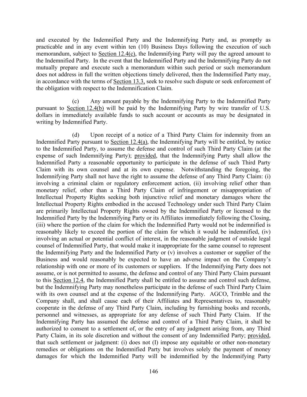146 and executed by the Indemnified Party and the Indemnifying Party and, as promptly as practicable and in any event within ten (10) Business Days following the execution of such memorandum, subject to Section 12.4(c), the Indemnifying Party will pay the agreed amount to the Indemnified Party. In the event that the Indemnified Party and the Indemnifying Party do not mutually prepare and execute such a memorandum within such period or such memorandum does not address in full the written objections timely delivered, then the Indemnified Party may, in accordance with the terms of Section 13.3, seek to resolve such dispute or seek enforcement of the obligation with respect to the Indemnification Claim. (c) Any amount payable by the Indemnifying Party to the Indemnified Party pursuant to Section 12.4(b) will be paid by the Indemnifying Party by wire transfer of U.S. dollars in immediately available funds to such account or accounts as may be designated in writing by Indemnified Party. (d) Upon receipt of a notice of a Third Party Claim for indemnity from an Indemnified Party pursuant to Section 12.4(a), the Indemnifying Party will be entitled, by notice to the Indemnified Party, to assume the defense and control of such Third Party Claim (at the expense of such Indemnifying Party); provided, that the Indemnifying Party shall allow the Indemnified Party a reasonable opportunity to participate in the defense of such Third Party Claim with its own counsel and at its own expense. Notwithstanding the foregoing, the Indemnifying Party shall not have the right to assume the defense of any Third Party Claim: (i) involving a criminal claim or regulatory enforcement action, (ii) involving relief other than monetary relief, other than a Third Party Claim of infringement or misappropriation of Intellectual Property Rights seeking both injunctive relief and monetary damages where the Intellectual Property Rights embodied in the accused Technology under such Third Party Claim are primarily Intellectual Property Rights owned by the Indemnified Party or licensed to the Indemnified Party by the Indemnifying Party or its Affiliates immediately following the Closing, (iii) where the portion of the claim for which the Indemnified Party would not be indemnified is reasonably likely to exceed the portion of the claim for which it would be indemnified, (iv) involving an actual or potential conflict of interest, in the reasonable judgment of outside legal counsel of Indemnified Party, that would make it inappropriate for the same counsel to represent the Indemnifying Party and the Indemnified Party or (v) involves a customer or supplier of the Business and would reasonably be expected to have an adverse impact on the Company’s relationship with one or more of its customers or suppliers. If the Indemnifying Party does not assume, or is not permitted to assume, the defense and control of any Third Party Claim pursuant to this Section 12.4, the Indemnified Party shall be entitled to assume and control such defense, but the Indemnifying Party may nonetheless participate in the defense of such Third Party Claim with its own counsel and at the expense of the Indemnifying Party. AGCO, Trimble and the Company shall, and shall cause each of their Affiliates and Representatives to, reasonably cooperate in the defense of any Third Party Claim, including by furnishing books and records, personnel and witnesses, as appropriate for any defense of such Third Party Claim. If the Indemnifying Party has assumed the defense and control of a Third Party Claim, it shall be authorized to consent to a settlement of, or the entry of any judgment arising from, any Third Party Claim, in its sole discretion and without the consent of any Indemnified Party; provided, that such settlement or judgment: (i) does not (I) impose any equitable or other non-monetary remedies or obligations on the Indemnified Party but involves solely the payment of money damages for which the Indemnified Party will be indemnified by the Indemnifying Party