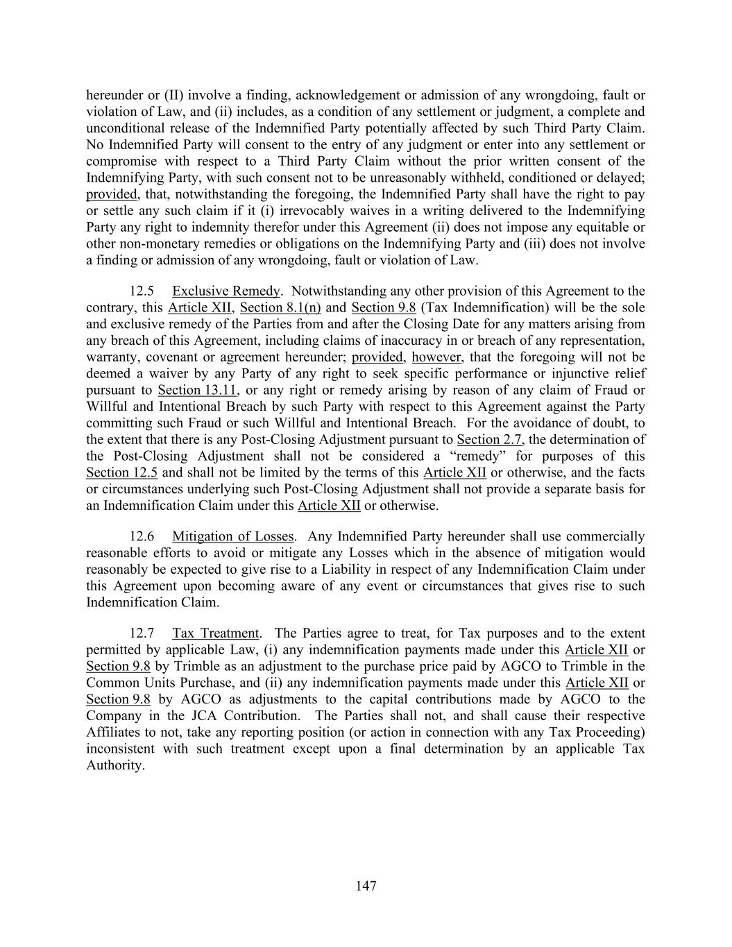 147 hereunder or (II) involve a finding, acknowledgement or admission of any wrongdoing, fault or violation of Law, and (ii) includes, as a condition of any settlement or judgment, a complete and unconditional release of the Indemnified Party potentially affected by such Third Party Claim. No Indemnified Party will consent to the entry of any judgment or enter into any settlement or compromise with respect to a Third Party Claim without the prior written consent of the Indemnifying Party, with such consent not to be unreasonably withheld, conditioned or delayed; provided, that, notwithstanding the foregoing, the Indemnified Party shall have the right to pay or settle any such claim if it (i) irrevocably waives in a writing delivered to the Indemnifying Party any right to indemnity therefor under this Agreement (ii) does not impose any equitable or other non-monetary remedies or obligations on the Indemnifying Party and (iii) does not involve a finding or admission of any wrongdoing, fault or violation of Law. 12.5 Exclusive Remedy. Notwithstanding any other provision of this Agreement to the contrary, this Article XII, Section 8.1(n) and Section 9.8 (Tax Indemnification) will be the sole and exclusive remedy of the Parties from and after the Closing Date for any matters arising from any breach of this Agreement, including claims of inaccuracy in or breach of any representation, warranty, covenant or agreement hereunder; provided, however, that the foregoing will not be deemed a waiver by any Party of any right to seek specific performance or injunctive relief pursuant to Section 13.11, or any right or remedy arising by reason of any claim of Fraud or Willful and Intentional Breach by such Party with respect to this Agreement against the Party committing such Fraud or such Willful and Intentional Breach. For the avoidance of doubt, to the extent that there is any Post-Closing Adjustment pursuant to Section 2.7, the determination of the Post-Closing Adjustment shall not be considered a “remedy” for purposes of this Section 12.5 and shall not be limited by the terms of this Article XII or otherwise, and the facts or circumstances underlying such Post-Closing Adjustment shall not provide a separate basis for an Indemnification Claim under this Article XII or otherwise. 12.6 Mitigation of Losses. Any Indemnified Party hereunder shall use commercially reasonable efforts to avoid or mitigate any Losses which in the absence of mitigation would reasonably be expected to give rise to a Liability in respect of any Indemnification Claim under this Agreement upon becoming aware of any event or circumstances that gives rise to such Indemnification Claim. 12.7 Tax Treatment. The Parties agree to treat, for Tax purposes and to the extent permitted by applicable Law, (i) any indemnification payments made under this Article XII or Section 9.8 by Trimble as an adjustment to the purchase price paid by AGCO to Trimble in the Common Units Purchase, and (ii) any indemnification payments made under this Article XII or Section 9.8 by AGCO as adjustments to the capital contributions made by AGCO to the Company in the JCA Contribution. The Parties shall not, and shall cause their respective Affiliates to not, take any reporting position (or action in connection with any Tax Proceeding) inconsistent with such treatment except upon a final determination by an applicable Tax Authority.