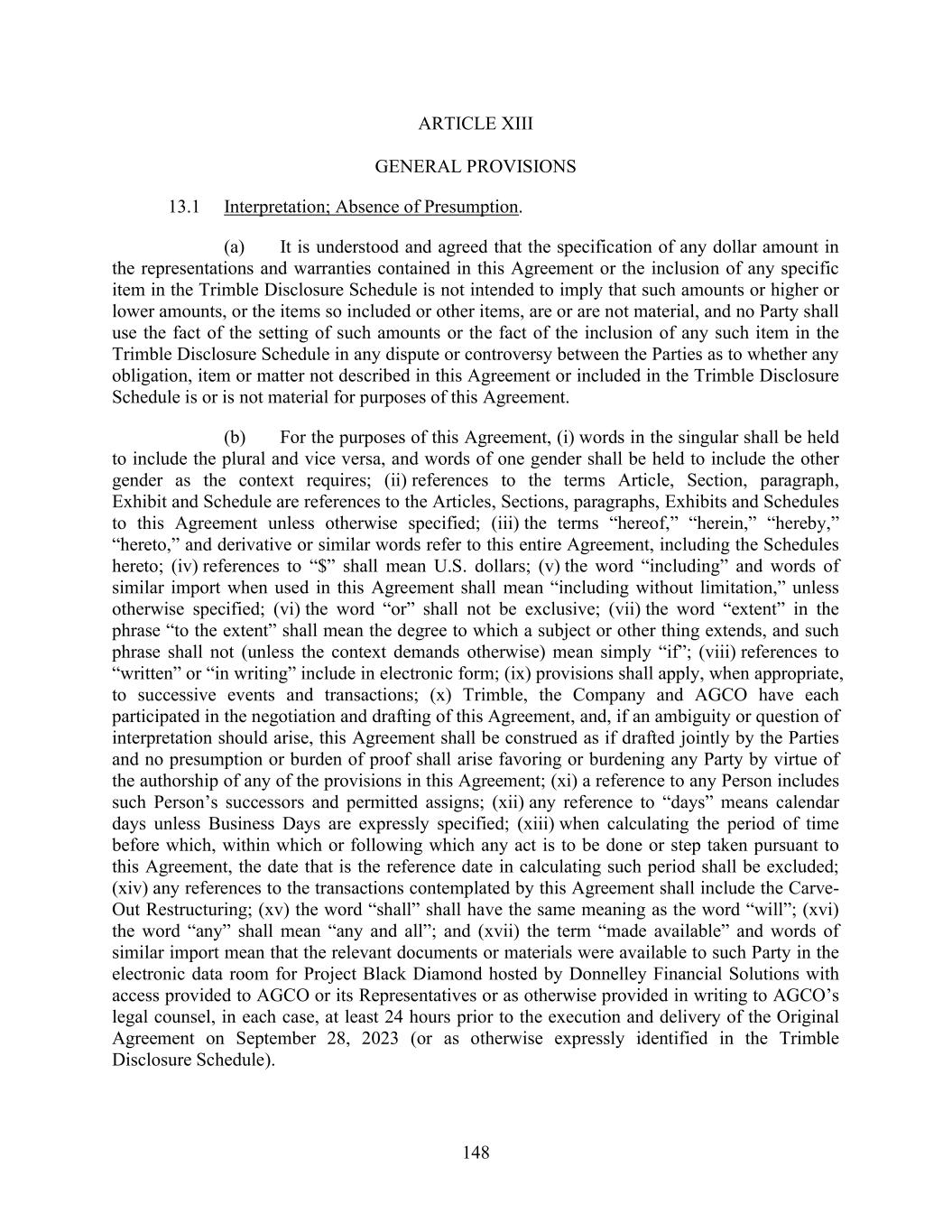 148 ARTICLE XIII GENERAL PROVISIONS 13.1 Interpretation; Absence of Presumption. (a) It is understood and agreed that the specification of any dollar amount in the representations and warranties contained in this Agreement or the inclusion of any specific item in the Trimble Disclosure Schedule is not intended to imply that such amounts or higher or lower amounts, or the items so included or other items, are or are not material, and no Party shall use the fact of the setting of such amounts or the fact of the inclusion of any such item in the Trimble Disclosure Schedule in any dispute or controversy between the Parties as to whether any obligation, item or matter not described in this Agreement or included in the Trimble Disclosure Schedule is or is not material for purposes of this Agreement. (b) For the purposes of this Agreement, (i) words in the singular shall be held to include the plural and vice versa, and words of one gender shall be held to include the other gender as the context requires; (ii) references to the terms Article, Section, paragraph, Exhibit and Schedule are references to the Articles, Sections, paragraphs, Exhibits and Schedules to this Agreement unless otherwise specified; (iii) the terms “hereof,” “herein,” “hereby,” “hereto,” and derivative or similar words refer to this entire Agreement, including the Schedules hereto; (iv) references to “$” shall mean U.S. dollars; (v) the word “including” and words of similar import when used in this Agreement shall mean “including without limitation,” unless otherwise specified; (vi) the word “or” shall not be exclusive; (vii) the word “extent” in the phrase “to the extent” shall mean the degree to which a subject or other thing extends, and such phrase shall not (unless the context demands otherwise) mean simply “if”; (viii) references to “written” or “in writing” include in electronic form; (ix) provisions shall apply, when appropriate, to successive events and transactions; (x) Trimble, the Company and AGCO have each participated in the negotiation and drafting of this Agreement, and, if an ambiguity or question of interpretation should arise, this Agreement shall be construed as if drafted jointly by the Parties and no presumption or burden of proof shall arise favoring or burdening any Party by virtue of the authorship of any of the provisions in this Agreement; (xi) a reference to any Person includes such Person’s successors and permitted assigns; (xii) any reference to “days” means calendar days unless Business Days are expressly specified; (xiii) when calculating the period of time before which, within which or following which any act is to be done or step taken pursuant to this Agreement, the date that is the reference date in calculating such period shall be excluded; (xiv) any references to the transactions contemplated by this Agreement shall include the Carve- Out Restructuring; (xv) the word “shall” shall have the same meaning as the word “will”; (xvi) the word “any” shall mean “any and all”; and (xvii) the term “made available” and words of similar import mean that the relevant documents or materials were available to such Party in the electronic data room for Project Black Diamond hosted by Donnelley Financial Solutions with access provided to AGCO or its Representatives or as otherwise provided in writing to AGCO’s legal counsel, in each case, at least 24 hours prior to the execution and delivery of the Original Agreement on September 28, 2023 (or as otherwise expressly identified in the Trimble Disclosure Schedule).
