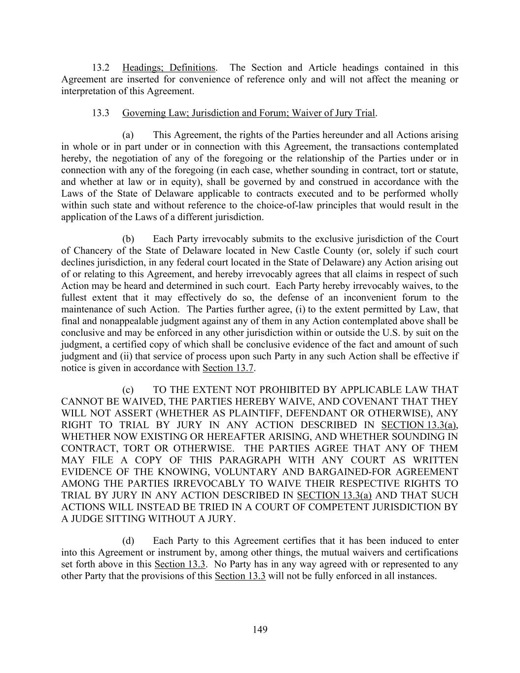 149 13.2 Headings; Definitions. The Section and Article headings contained in this Agreement are inserted for convenience of reference only and will not affect the meaning or interpretation of this Agreement. 13.3 Governing Law; Jurisdiction and Forum; Waiver of Jury Trial. (a) This Agreement, the rights of the Parties hereunder and all Actions arising in whole or in part under or in connection with this Agreement, the transactions contemplated hereby, the negotiation of any of the foregoing or the relationship of the Parties under or in connection with any of the foregoing (in each case, whether sounding in contract, tort or statute, and whether at law or in equity), shall be governed by and construed in accordance with the Laws of the State of Delaware applicable to contracts executed and to be performed wholly within such state and without reference to the choice-of-law principles that would result in the application of the Laws of a different jurisdiction. (b) Each Party irrevocably submits to the exclusive jurisdiction of the Court of Chancery of the State of Delaware located in New Castle County (or, solely if such court declines jurisdiction, in any federal court located in the State of Delaware) any Action arising out of or relating to this Agreement, and hereby irrevocably agrees that all claims in respect of such Action may be heard and determined in such court. Each Party hereby irrevocably waives, to the fullest extent that it may effectively do so, the defense of an inconvenient forum to the maintenance of such Action. The Parties further agree, (i) to the extent permitted by Law, that final and nonappealable judgment against any of them in any Action contemplated above shall be conclusive and may be enforced in any other jurisdiction within or outside the U.S. by suit on the judgment, a certified copy of which shall be conclusive evidence of the fact and amount of such judgment and (ii) that service of process upon such Party in any such Action shall be effective if notice is given in accordance with Section 13.7. (c) TO THE EXTENT NOT PROHIBITED BY APPLICABLE LAW THAT CANNOT BE WAIVED, THE PARTIES HEREBY WAIVE, AND COVENANT THAT THEY WILL NOT ASSERT (WHETHER AS PLAINTIFF, DEFENDANT OR OTHERWISE), ANY RIGHT TO TRIAL BY JURY IN ANY ACTION DESCRIBED IN SECTION 13.3(a), WHETHER NOW EXISTING OR HEREAFTER ARISING, AND WHETHER SOUNDING IN CONTRACT, TORT OR OTHERWISE. THE PARTIES AGREE THAT ANY OF THEM MAY FILE A COPY OF THIS PARAGRAPH WITH ANY COURT AS WRITTEN EVIDENCE OF THE KNOWING, VOLUNTARY AND BARGAINED-FOR AGREEMENT AMONG THE PARTIES IRREVOCABLY TO WAIVE THEIR RESPECTIVE RIGHTS TO TRIAL BY JURY IN ANY ACTION DESCRIBED IN SECTION 13.3(a) AND THAT SUCH ACTIONS WILL INSTEAD BE TRIED IN A COURT OF COMPETENT JURISDICTION BY A JUDGE SITTING WITHOUT A JURY. (d) Each Party to this Agreement certifies that it has been induced to enter into this Agreement or instrument by, among other things, the mutual waivers and certifications set forth above in this Section 13.3. No Party has in any way agreed with or represented to any other Party that the provisions of this Section 13.3 will not be fully enforced in all instances.
