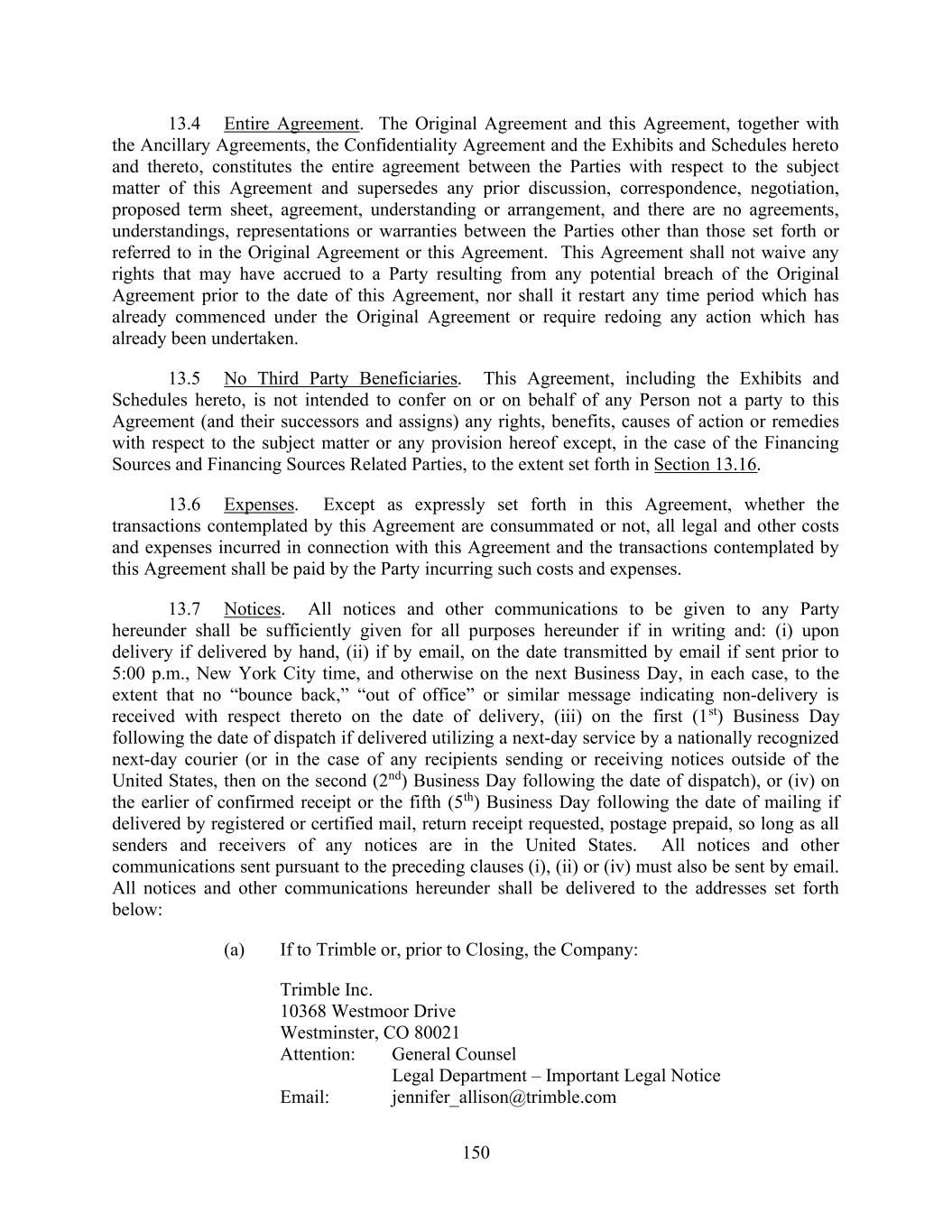 150 13.4 Entire Agreement. The Original Agreement and this Agreement, together with the Ancillary Agreements, the Confidentiality Agreement and the Exhibits and Schedules hereto and thereto, constitutes the entire agreement between the Parties with respect to the subject matter of this Agreement and supersedes any prior discussion, correspondence, negotiation, proposed term sheet, agreement, understanding or arrangement, and there are no agreements, understandings, representations or warranties between the Parties other than those set forth or referred to in the Original Agreement or this Agreement. This Agreement shall not waive any rights that may have accrued to a Party resulting from any potential breach of the Original Agreement prior to the date of this Agreement, nor shall it restart any time period which has already commenced under the Original Agreement or require redoing any action which has already been undertaken. 13.5 No Third Party Beneficiaries. This Agreement, including the Exhibits and Schedules hereto, is not intended to confer on or on behalf of any Person not a party to this Agreement (and their successors and assigns) any rights, benefits, causes of action or remedies with respect to the subject matter or any provision hereof except, in the case of the Financing Sources and Financing Sources Related Parties, to the extent set forth in Section 13.16. 13.6 Expenses. Except as expressly set forth in this Agreement, whether the transactions contemplated by this Agreement are consummated or not, all legal and other costs and expenses incurred in connection with this Agreement and the transactions contemplated by this Agreement shall be paid by the Party incurring such costs and expenses. 13.7 Notices. All notices and other communications to be given to any Party hereunder shall be sufficiently given for all purposes hereunder if in writing and: (i) upon delivery if delivered by hand, (ii) if by email, on the date transmitted by email if sent prior to 5:00 p.m., New York City time, and otherwise on the next Business Day, in each case, to the extent that no “bounce back,” “out of office” or similar message indicating non-delivery is received with respect thereto on the date of delivery, (iii) on the first (1st) Business Day following the date of dispatch if delivered utilizing a next-day service by a nationally recognized next-day courier (or in the case of any recipients sending or receiving notices outside of the United States, then on the second (2nd) Business Day following the date of dispatch), or (iv) on the earlier of confirmed receipt or the fifth (5th) Business Day following the date of mailing if delivered by registered or certified mail, return receipt requested, postage prepaid, so long as all senders and receivers of any notices are in the United States. All notices and other communications sent pursuant to the preceding clauses (i), (ii) or (iv) must also be sent by email. All notices and other communications hereunder shall be delivered to the addresses set forth below: (a) If to Trimble or, prior to Closing, the Company: Trimble Inc. 10368 Westmoor Drive Westminster, CO 80021 Attention: General Counsel Legal Department – Important Legal Notice Email: jennifer_allison@trimble.com