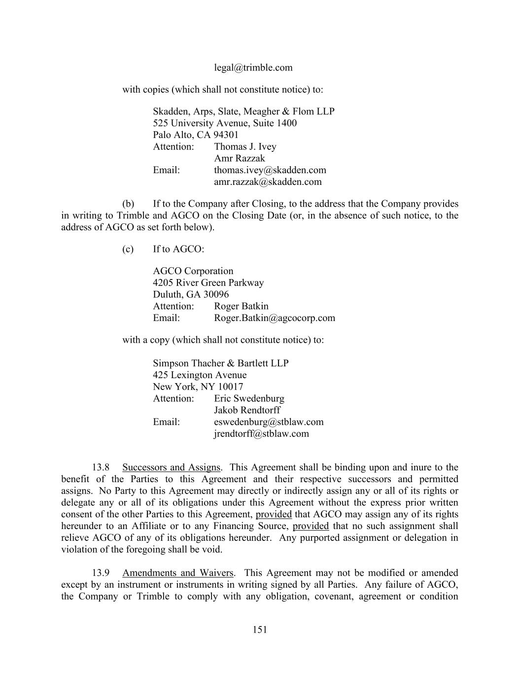 151 legal@trimble.com with copies (which shall not constitute notice) to: Skadden, Arps, Slate, Meagher & Flom LLP 525 University Avenue, Suite 1400 Palo Alto, CA 94301 Attention: Thomas J. Ivey Amr Razzak Email: thomas.ivey@skadden.com amr.razzak@skadden.com (b) If to the Company after Closing, to the address that the Company provides in writing to Trimble and AGCO on the Closing Date (or, in the absence of such notice, to the address of AGCO as set forth below). (c) If to AGCO: AGCO Corporation 4205 River Green Parkway Duluth, GA 30096 Attention: Roger Batkin Email: Roger.Batkin@agcocorp.com with a copy (which shall not constitute notice) to: Simpson Thacher & Bartlett LLP 425 Lexington Avenue New York, NY 10017 Attention: Eric Swedenburg Jakob Rendtorff Email: eswedenburg@stblaw.com jrendtorff@stblaw.com 13.8 Successors and Assigns. This Agreement shall be binding upon and inure to the benefit of the Parties to this Agreement and their respective successors and permitted assigns. No Party to this Agreement may directly or indirectly assign any or all of its rights or delegate any or all of its obligations under this Agreement without the express prior written consent of the other Parties to this Agreement, provided that AGCO may assign any of its rights hereunder to an Affiliate or to any Financing Source, provided that no such assignment shall relieve AGCO of any of its obligations hereunder. Any purported assignment or delegation in violation of the foregoing shall be void. 13.9 Amendments and Waivers. This Agreement may not be modified or amended except by an instrument or instruments in writing signed by all Parties. Any failure of AGCO, the Company or Trimble to comply with any obligation, covenant, agreement or condition