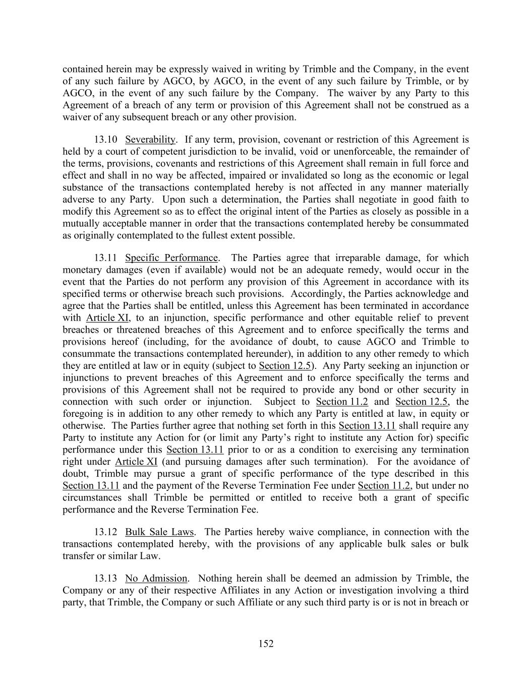 152 contained herein may be expressly waived in writing by Trimble and the Company, in the event of any such failure by AGCO, by AGCO, in the event of any such failure by Trimble, or by AGCO, in the event of any such failure by the Company. The waiver by any Party to this Agreement of a breach of any term or provision of this Agreement shall not be construed as a waiver of any subsequent breach or any other provision. 13.10 Severability. If any term, provision, covenant or restriction of this Agreement is held by a court of competent jurisdiction to be invalid, void or unenforceable, the remainder of the terms, provisions, covenants and restrictions of this Agreement shall remain in full force and effect and shall in no way be affected, impaired or invalidated so long as the economic or legal substance of the transactions contemplated hereby is not affected in any manner materially adverse to any Party. Upon such a determination, the Parties shall negotiate in good faith to modify this Agreement so as to effect the original intent of the Parties as closely as possible in a mutually acceptable manner in order that the transactions contemplated hereby be consummated as originally contemplated to the fullest extent possible. 13.11 Specific Performance. The Parties agree that irreparable damage, for which monetary damages (even if available) would not be an adequate remedy, would occur in the event that the Parties do not perform any provision of this Agreement in accordance with its specified terms or otherwise breach such provisions. Accordingly, the Parties acknowledge and agree that the Parties shall be entitled, unless this Agreement has been terminated in accordance with Article XI, to an injunction, specific performance and other equitable relief to prevent breaches or threatened breaches of this Agreement and to enforce specifically the terms and provisions hereof (including, for the avoidance of doubt, to cause AGCO and Trimble to consummate the transactions contemplated hereunder), in addition to any other remedy to which they are entitled at law or in equity (subject to Section 12.5). Any Party seeking an injunction or injunctions to prevent breaches of this Agreement and to enforce specifically the terms and provisions of this Agreement shall not be required to provide any bond or other security in connection with such order or injunction. Subject to Section 11.2 and Section 12.5, the foregoing is in addition to any other remedy to which any Party is entitled at law, in equity or otherwise. The Parties further agree that nothing set forth in this Section 13.11 shall require any Party to institute any Action for (or limit any Party’s right to institute any Action for) specific performance under this Section 13.11 prior to or as a condition to exercising any termination right under Article XI (and pursuing damages after such termination). For the avoidance of doubt, Trimble may pursue a grant of specific performance of the type described in this Section 13.11 and the payment of the Reverse Termination Fee under Section 11.2, but under no circumstances shall Trimble be permitted or entitled to receive both a grant of specific performance and the Reverse Termination Fee. 13.12 Bulk Sale Laws. The Parties hereby waive compliance, in connection with the transactions contemplated hereby, with the provisions of any applicable bulk sales or bulk transfer or similar Law. 13.13 No Admission. Nothing herein shall be deemed an admission by Trimble, the Company or any of their respective Affiliates in any Action or investigation involving a third party, that Trimble, the Company or such Affiliate or any such third party is or is not in breach or