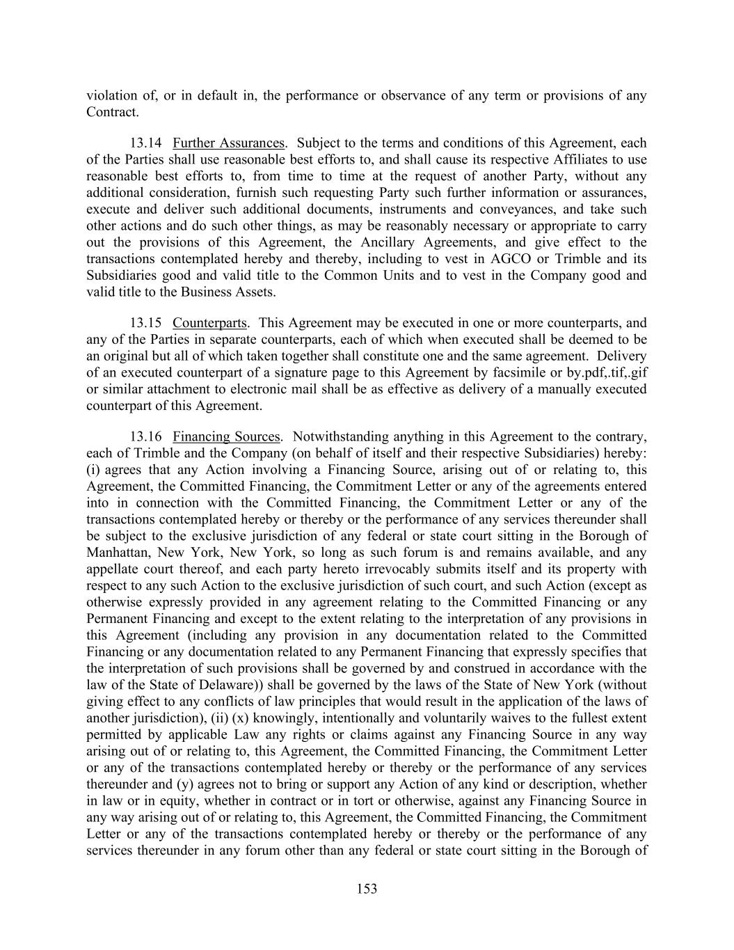 153 violation of, or in default in, the performance or observance of any term or provisions of any Contract. 13.14 Further Assurances. Subject to the terms and conditions of this Agreement, each of the Parties shall use reasonable best efforts to, and shall cause its respective Affiliates to use reasonable best efforts to, from time to time at the request of another Party, without any additional consideration, furnish such requesting Party such further information or assurances, execute and deliver such additional documents, instruments and conveyances, and take such other actions and do such other things, as may be reasonably necessary or appropriate to carry out the provisions of this Agreement, the Ancillary Agreements, and give effect to the transactions contemplated hereby and thereby, including to vest in AGCO or Trimble and its Subsidiaries good and valid title to the Common Units and to vest in the Company good and valid title to the Business Assets. 13.15 Counterparts. This Agreement may be executed in one or more counterparts, and any of the Parties in separate counterparts, each of which when executed shall be deemed to be an original but all of which taken together shall constitute one and the same agreement. Delivery of an executed counterpart of a signature page to this Agreement by facsimile or by.pdf,.tif,.gif or similar attachment to electronic mail shall be as effective as delivery of a manually executed counterpart of this Agreement. 13.16 Financing Sources. Notwithstanding anything in this Agreement to the contrary, each of Trimble and the Company (on behalf of itself and their respective Subsidiaries) hereby: (i) agrees that any Action involving a Financing Source, arising out of or relating to, this Agreement, the Committed Financing, the Commitment Letter or any of the agreements entered into in connection with the Committed Financing, the Commitment Letter or any of the transactions contemplated hereby or thereby or the performance of any services thereunder shall be subject to the exclusive jurisdiction of any federal or state court sitting in the Borough of Manhattan, New York, New York, so long as such forum is and remains available, and any appellate court thereof, and each party hereto irrevocably submits itself and its property with respect to any such Action to the exclusive jurisdiction of such court, and such Action (except as otherwise expressly provided in any agreement relating to the Committed Financing or any Permanent Financing and except to the extent relating to the interpretation of any provisions in this Agreement (including any provision in any documentation related to the Committed Financing or any documentation related to any Permanent Financing that expressly specifies that the interpretation of such provisions shall be governed by and construed in accordance with the law of the State of Delaware)) shall be governed by the laws of the State of New York (without giving effect to any conflicts of law principles that would result in the application of the laws of another jurisdiction), (ii) (x) knowingly, intentionally and voluntarily waives to the fullest extent permitted by applicable Law any rights or claims against any Financing Source in any way arising out of or relating to, this Agreement, the Committed Financing, the Commitment Letter or any of the transactions contemplated hereby or thereby or the performance of any services thereunder and (y) agrees not to bring or support any Action of any kind or description, whether in law or in equity, whether in contract or in tort or otherwise, against any Financing Source in any way arising out of or relating to, this Agreement, the Committed Financing, the Commitment Letter or any of the transactions contemplated hereby or thereby or the performance of any services thereunder in any forum other than any federal or state court sitting in the Borough of