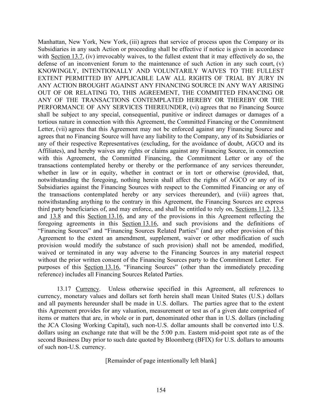 154 Manhattan, New York, New York, (iii) agrees that service of process upon the Company or its Subsidiaries in any such Action or proceeding shall be effective if notice is given in accordance with Section 13.7, (iv) irrevocably waives, to the fullest extent that it may effectively do so, the defense of an inconvenient forum to the maintenance of such Action in any such court, (v) KNOWINGLY, INTENTIONALLY AND VOLUNTARILY WAIVES TO THE FULLEST EXTENT PERMITTED BY APPLICABLE LAW ALL RIGHTS OF TRIAL BY JURY IN ANY ACTION BROUGHT AGAINST ANY FINANCING SOURCE IN ANY WAY ARISING OUT OF OR RELATING TO, THIS AGREEMENT, THE COMMITTED FINANCING OR ANY OF THE TRANSACTIONS CONTEMPLATED HEREBY OR THEREBY OR THE PERFORMANCE OF ANY SERVICES THEREUNDER, (vi) agrees that no Financing Source shall be subject to any special, consequential, punitive or indirect damages or damages of a tortious nature in connection with this Agreement, the Committed Financing or the Commitment Letter, (vii) agrees that this Agreement may not be enforced against any Financing Source and agrees that no Financing Source will have any liability to the Company, any of its Subsidiaries or any of their respective Representatives (excluding, for the avoidance of doubt, AGCO and its Affiliates), and hereby waives any rights or claims against any Financing Source, in connection with this Agreement, the Committed Financing, the Commitment Letter or any of the transactions contemplated hereby or thereby or the performance of any services thereunder, whether in law or in equity, whether in contract or in tort or otherwise (provided, that, notwithstanding the foregoing, nothing herein shall affect the rights of AGCO or any of its Subsidiaries against the Financing Sources with respect to the Committed Financing or any of the transactions contemplated hereby or any services thereunder), and (viii) agrees that, notwithstanding anything to the contrary in this Agreement, the Financing Sources are express third party beneficiaries of, and may enforce, and shall be entitled to rely on, Sections 11.2, 13.5 and 13.8 and this Section 13.16, and any of the provisions in this Agreement reflecting the foregoing agreements in this Section 13.16, and such provisions and the definitions of “Financing Sources” and “Financing Sources Related Parties” (and any other provision of this Agreement to the extent an amendment, supplement, waiver or other modification of such provision would modify the substance of such provision) shall not be amended, modified, waived or terminated in any way adverse to the Financing Sources in any material respect without the prior written consent of the Financing Sources party to the Commitment Letter. For purposes of this Section 13.16, “Financing Sources” (other than the immediately preceding reference) includes all Financing Sources Related Parties. 13.17 Currency. Unless otherwise specified in this Agreement, all references to currency, monetary values and dollars set forth herein shall mean United States (U.S.) dollars and all payments hereunder shall be made in U.S. dollars. The parties agree that to the extent this Agreement provides for any valuation, measurement or test as of a given date comprised of items or matters that are, in whole or in part, denominated other than in U.S. dollars (including the JCA Closing Working Capital), such non-U.S. dollar amounts shall be converted into U.S. dollars using an exchange rate that will be the 5:00 p.m. Eastern mid-point spot rate as of the second Business Day prior to such date quoted by Bloomberg (BFIX) for U.S. dollars to amounts of such non-U.S. currency. [Remainder of page intentionally left blank]