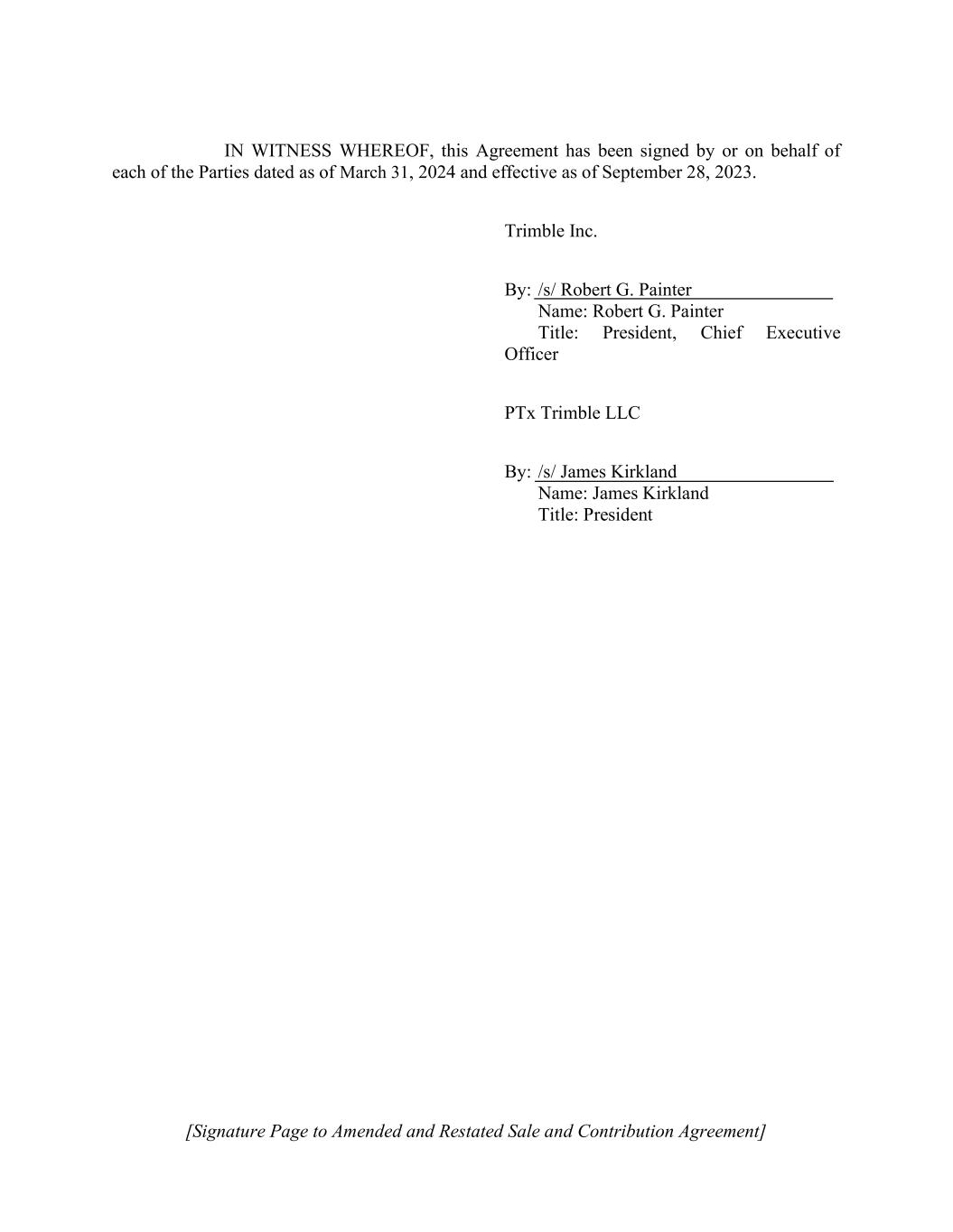 [Signature Page to Amended and Restated Sale and Contribution Agreement] IN WITNESS WHEREOF, this Agreement has been signed by or on behalf of each of the Parties dated as of March 31, 2024 and effective as of September 28, 2023. Trimble Inc. By: /s/ Robert G. Painter Name: Robert G. Painter Title: President, Chief Executive Officer PTx Trimble LLC By: /s/ James Kirkland Name: James Kirkland Title: President