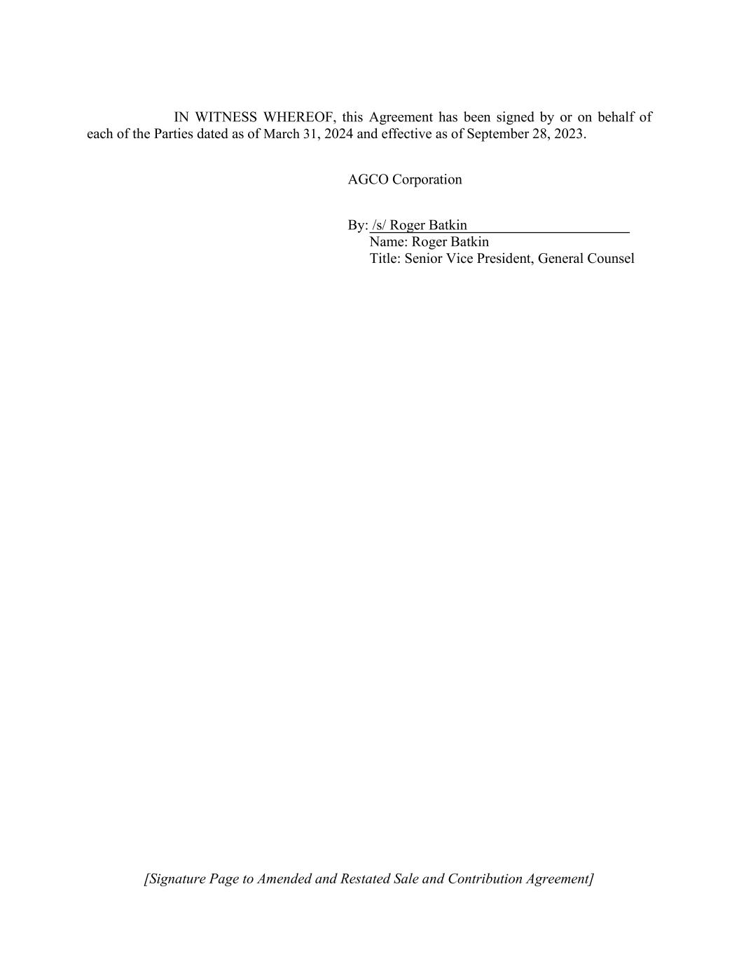 [Signature Page to Amended and Restated Sale and Contribution Agreement] IN WITNESS WHEREOF, this Agreement has been signed by or on behalf of each of the Parties dated as of March 31, 2024 and effective as of September 28, 2023. AGCO Corporation By: /s/ Roger Batkin Name: Roger Batkin Title: Senior Vice President, General Counsel