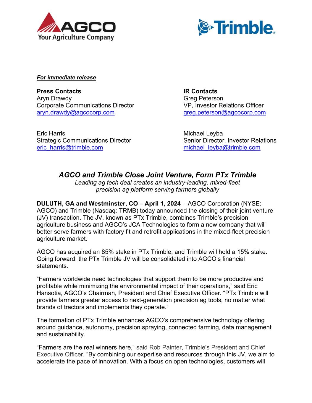 For immediate release Press Contacts IR Contacts Aryn Drawdy Greg Peterson Corporate Communications Director VP, Investor Relations Officer aryn.drawdy@agcocorp.com greg.peterson@agcocorp.com Eric Harris Michael Leyba Strategic Communications Director Senior Director, Investor Relations eric_harris@trimble.com michael_leyba@trimble.com AGCO and Trimble Close Joint Venture, Form PTx Trimble Leading ag tech deal creates an industry-leading, mixed-fleet precision ag platform serving farmers globally DULUTH, GA and Westminster, CO – April 1, 2024 – AGCO Corporation (NYSE: AGCO) and Trimble (Nasdaq: TRMB) today announced the closing of their joint venture (JV) transaction. The JV, known as PTx Trimble, combines Trimble’s precision agriculture business and AGCO’s JCA Technologies to form a new company that will better serve farmers with factory fit and retrofit applications in the mixed-fleet precision agriculture market. AGCO has acquired an 85% stake in PTx Trimble, and Trimble will hold a 15% stake. Going forward, the PTx Trimble JV will be consolidated into AGCO’s financial statements. “Farmers worldwide need technologies that support them to be more productive and profitable while minimizing the environmental impact of their operations,” said Eric Hansotia, AGCO’s Chairman, President and Chief Executive Officer. “PTx Trimble will provide farmers greater access to next-generation precision ag tools, no matter what brands of tractors and implements they operate.” The formation of PTx Trimble enhances AGCO’s comprehensive technology offering around guidance, autonomy, precision spraying, connected farming, data management and sustainability. “Farmers are the real winners here,” said Rob Painter, Trimble's President and Chief Executive Officer. “By combining our expertise and resources through this JV, we aim to accelerate the pace of innovation. With a focus on open technologies, customers will