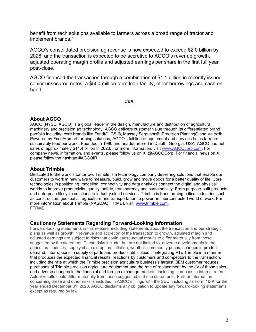 2 benefit from tech solutions available to farmers across a broad range of tractor and implement brands.” AGCO’s consolidated precision ag revenue is now expected to exceed $2.0 billion by 2028, and the transaction is expected to be accretive to AGCO’s revenue growth, adjusted operating margin profile and adjusted earnings per share in the first full year post-close. AGCO financed the transaction through a combination of $1.1 billion in recently issued senior unsecured notes, a $500 million term loan facility, other borrowings and cash on hand. ### About AGCO AGCO (NYSE: AGCO) is a global leader in the design, manufacture and distribution of agricultural machinery and precision ag technology. AGCO delivers customer value through its differentiated brand portfolio including core brands like Fendt®, GSI®, Massey Ferguson®, Precision Planting® and Valtra®. Powered by Fuse® smart farming solutions, AGCO's full line of equipment and services helps farmers sustainably feed our world. Founded in 1990 and headquartered in Duluth, Georgia, USA, AGCO had net sales of approximately $14.4 billion in 2023. For more information, visit www.AGCOcorp.com. For company news, information, and events, please follow us on X: @AGCOCorp. For financial news on X, please follow the hashtag #AGCOIR. About Trimble Dedicated to the world's tomorrow, Trimble is a technology company delivering solutions that enable our customers to work in new ways to measure, build, grow and move goods for a better quality of life. Core technologies in positioning, modeling, connectivity and data analytics connect the digital and physical worlds to improve productivity, quality, safety, transparency and sustainability. From purpose-built products and enterprise lifecycle solutions to industry cloud services, Trimble is transforming critical industries such as construction, geospatial, agriculture and transportation to power an interconnected world of work. For more information about Trimble (NASDAQ: TRMB), visit: www.trimble.com. FTRMB Cautionary Statements Regarding Forward-Looking Information Forward-looking statements in this release, including statements about the transaction and our strategic plans as well as growth in revenue and accretion of the transaction to growth, adjusted margin and adjusted earnings are subject to risks that could cause actual results to differ materially from those suggested by the statement. These risks include, but are not limited to, adverse developments in the agricultural industry, supply chain disruption, inflation, weather, commodity prices, changes in product demand, interruptions in supply of parts and products, difficulties in integrating PTx Trimble in a manner that produces the expected financial results, reactions by customers and competitors to the transaction, including the rate at which the Trimble precision agriculture business’s largest OEM customer reduces purchases of Trimble precision agriculture equipment and the rate of replacement by the JV of those sales, and adverse changes in the financial and foreign exchange markets, including increases in interest rates. Actual results could differ materially from those suggested in these statements. Further information concerning these and other risks is included in AGCO’s filings with the SEC, including its Form 10-K for the year ended December 31, 2023. AGCO disclaims any obligation to update any forward-looking statements except as required by law.