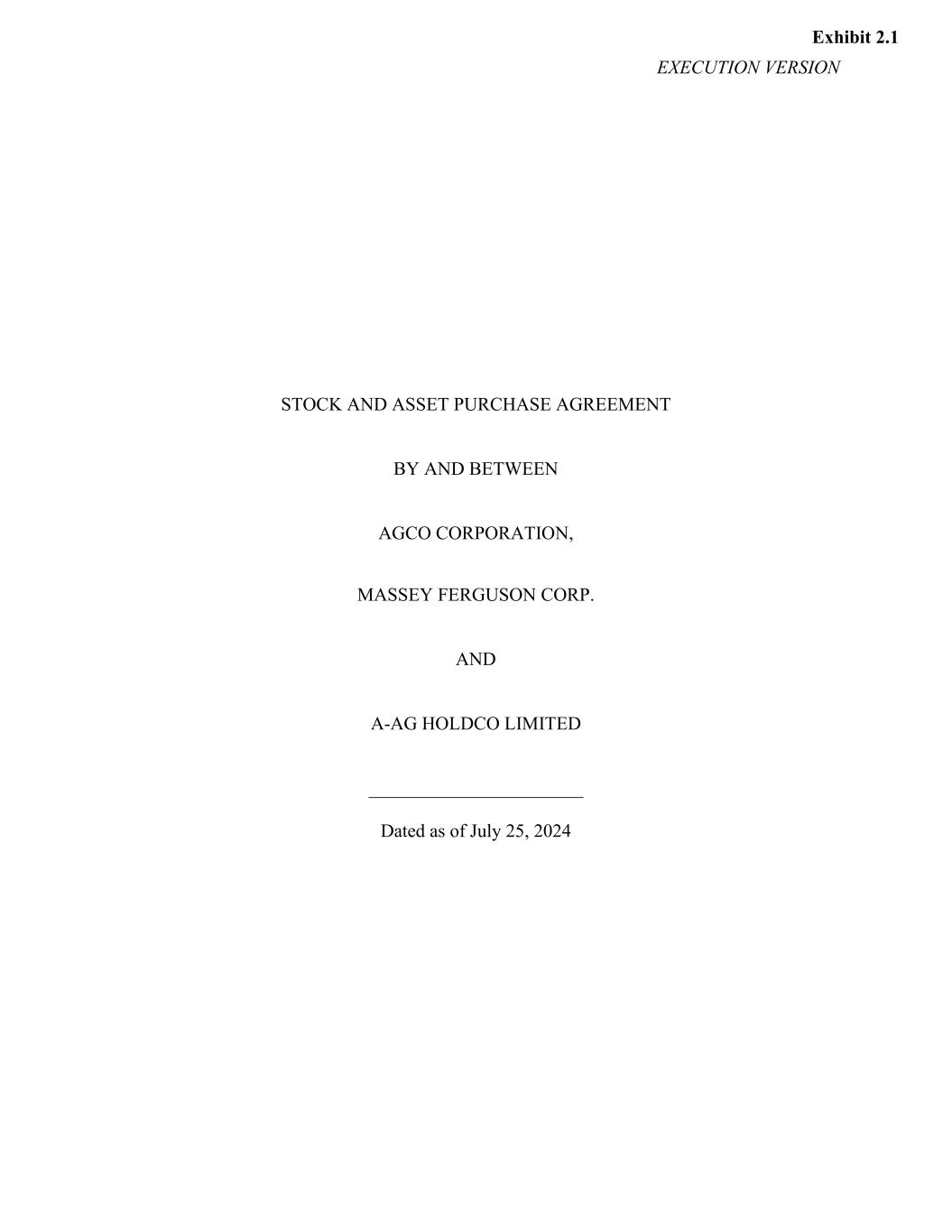 EXECUTION VERSION STOCK AND ASSET PURCHASE AGREEMENT BY AND BETWEEN AGCO CORPORATION, MASSEY FERGUSON CORP. AND A-AG HOLDCO LIMITED _______________________ Dated as of July 25, 2024