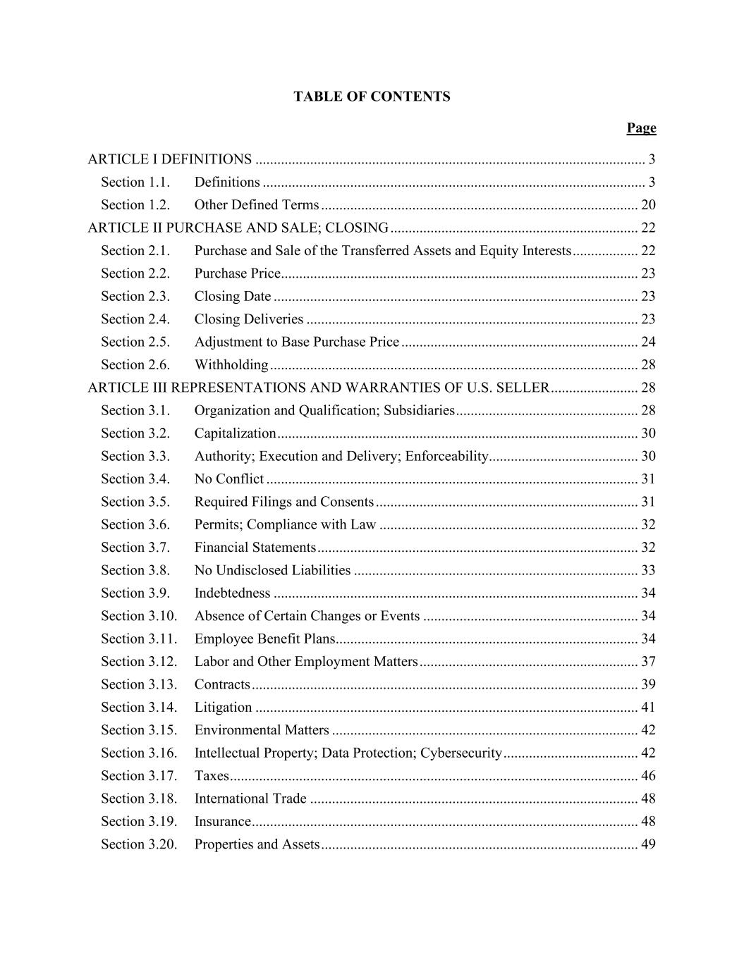 TABLE OF CONTENTS Page ARTICLE I DEFINITIONS ........................................................................................................... 3 Section 1.1. Definitions ......................................................................................................... 3 Section 1.2. Other Defined Terms ....................................................................................... 20 ARTICLE II PURCHASE AND SALE; CLOSING .................................................................... 22 Section 2.1. Purchase and Sale of the Transferred Assets and Equity Interests .................. 22 Section 2.2. Purchase Price.................................................................................................. 23 Section 2.3. Closing Date .................................................................................................... 23 Section 2.4. Closing Deliveries ........................................................................................... 23 Section 2.5. Adjustment to Base Purchase Price ................................................................. 24 Section 2.6. Withholding ..................................................................................................... 28 ARTICLE III REPRESENTATIONS AND WARRANTIES OF U.S. SELLER ........................ 28 Section 3.1. Organization and Qualification; Subsidiaries .................................................. 28 Section 3.2. Capitalization ................................................................................................... 30 Section 3.3. Authority; Execution and Delivery; Enforceability......................................... 30 Section 3.4. No Conflict ...................................................................................................... 31 Section 3.5. Required Filings and Consents ........................................................................ 31 Section 3.6. Permits; Compliance with Law ....................................................................... 32 Section 3.7. Financial Statements ........................................................................................ 32 Section 3.8. No Undisclosed Liabilities .............................................................................. 33 Section 3.9. Indebtedness .................................................................................................... 34 Section 3.10. Absence of Certain Changes or Events ........................................................... 34 Section 3.11. Employee Benefit Plans................................................................................... 34 Section 3.12. Labor and Other Employment Matters ............................................................ 37 Section 3.13. Contracts .......................................................................................................... 39 Section 3.14. Litigation ......................................................................................................... 41 Section 3.15. Environmental Matters .................................................................................... 42 Section 3.16. Intellectual Property; Data Protection; Cybersecurity ..................................... 42 Section 3.17. Taxes ................................................................................................................ 46 Section 3.18. International Trade .......................................................................................... 48 Section 3.19. Insurance .......................................................................................................... 48 Section 3.20. Properties and Assets ....................................................................................... 49