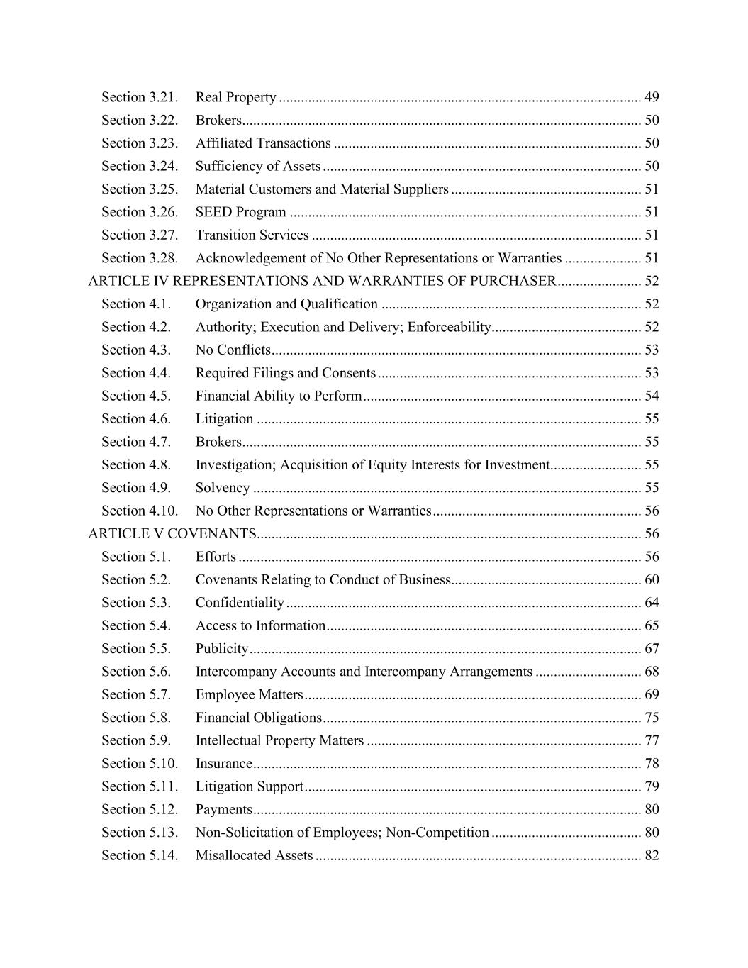 Section 3.21. Real Property ................................................................................................... 49 Section 3.22. Brokers............................................................................................................. 50 Section 3.23. Affiliated Transactions .................................................................................... 50 Section 3.24. Sufficiency of Assets ....................................................................................... 50 Section 3.25. Material Customers and Material Suppliers .................................................... 51 Section 3.26. SEED Program ................................................................................................ 51 Section 3.27. Transition Services .......................................................................................... 51 Section 3.28. Acknowledgement of No Other Representations or Warranties ..................... 51 ARTICLE IV REPRESENTATIONS AND WARRANTIES OF PURCHASER ....................... 52 Section 4.1. Organization and Qualification ....................................................................... 52 Section 4.2. Authority; Execution and Delivery; Enforceability......................................... 52 Section 4.3. No Conflicts ..................................................................................................... 53 Section 4.4. Required Filings and Consents ........................................................................ 53 Section 4.5. Financial Ability to Perform ............................................................................ 54 Section 4.6. Litigation ......................................................................................................... 55 Section 4.7. Brokers............................................................................................................. 55 Section 4.8. Investigation; Acquisition of Equity Interests for Investment......................... 55 Section 4.9. Solvency .......................................................................................................... 55 Section 4.10. No Other Representations or Warranties ......................................................... 56 ARTICLE V COVENANTS......................................................................................................... 56 Section 5.1. Efforts .............................................................................................................. 56 Section 5.2. Covenants Relating to Conduct of Business.................................................... 60 Section 5.3. Confidentiality ................................................................................................. 64 Section 5.4. Access to Information ...................................................................................... 65 Section 5.5. Publicity ........................................................................................................... 67 Section 5.6. Intercompany Accounts and Intercompany Arrangements ............................. 68 Section 5.7. Employee Matters ............................................................................................ 69 Section 5.8. Financial Obligations ....................................................................................... 75 Section 5.9. Intellectual Property Matters ........................................................................... 77 Section 5.10. Insurance .......................................................................................................... 78 Section 5.11. Litigation Support ............................................................................................ 79 Section 5.12. Payments .......................................................................................................... 80 Section 5.13. Non-Solicitation of Employees; Non-Competition ......................................... 80 Section 5.14. Misallocated Assets ......................................................................................... 82