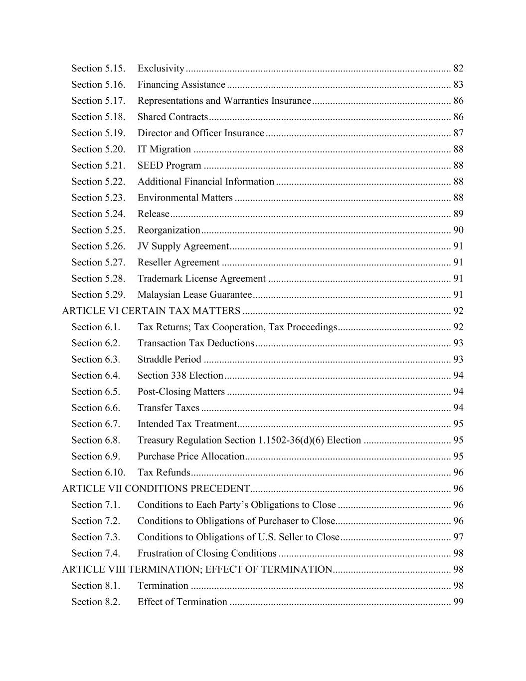 Section 5.15. Exclusivity ....................................................................................................... 82 Section 5.16. Financing Assistance ....................................................................................... 83 Section 5.17. Representations and Warranties Insurance ...................................................... 86 Section 5.18. Shared Contracts .............................................................................................. 86 Section 5.19. Director and Officer Insurance ........................................................................ 87 Section 5.20. IT Migration .................................................................................................... 88 Section 5.21. SEED Program ................................................................................................ 88 Section 5.22. Additional Financial Information .................................................................... 88 Section 5.23. Environmental Matters .................................................................................... 88 Section 5.24. Release ............................................................................................................. 89 Section 5.25. Reorganization ................................................................................................. 90 Section 5.26. JV Supply Agreement ...................................................................................... 91 Section 5.27. Reseller Agreement ......................................................................................... 91 Section 5.28. Trademark License Agreement ....................................................................... 91 Section 5.29. Malaysian Lease Guarantee ............................................................................. 91 ARTICLE VI CERTAIN TAX MATTERS ................................................................................. 92 Section 6.1. Tax Returns; Tax Cooperation, Tax Proceedings ............................................ 92 Section 6.2. Transaction Tax Deductions ............................................................................ 93 Section 6.3. Straddle Period ................................................................................................ 93 Section 6.4. Section 338 Election ........................................................................................ 94 Section 6.5. Post-Closing Matters ....................................................................................... 94 Section 6.6. Transfer Taxes ................................................................................................. 94 Section 6.7. Intended Tax Treatment ................................................................................... 95 Section 6.8. Treasury Regulation Section 1.1502-36(d)(6) Election .................................. 95 Section 6.9. Purchase Price Allocation ................................................................................ 95 Section 6.10. Tax Refunds ..................................................................................................... 96 ARTICLE VII CONDITIONS PRECEDENT.............................................................................. 96 Section 7.1. Conditions to Each Party’s Obligations to Close ............................................ 96 Section 7.2. Conditions to Obligations of Purchaser to Close............................................. 96 Section 7.3. Conditions to Obligations of U.S. Seller to Close ........................................... 97 Section 7.4. Frustration of Closing Conditions ................................................................... 98 ARTICLE VIII TERMINATION; EFFECT OF TERMINATION .............................................. 98 Section 8.1. Termination ..................................................................................................... 98 Section 8.2. Effect of Termination ...................................................................................... 99