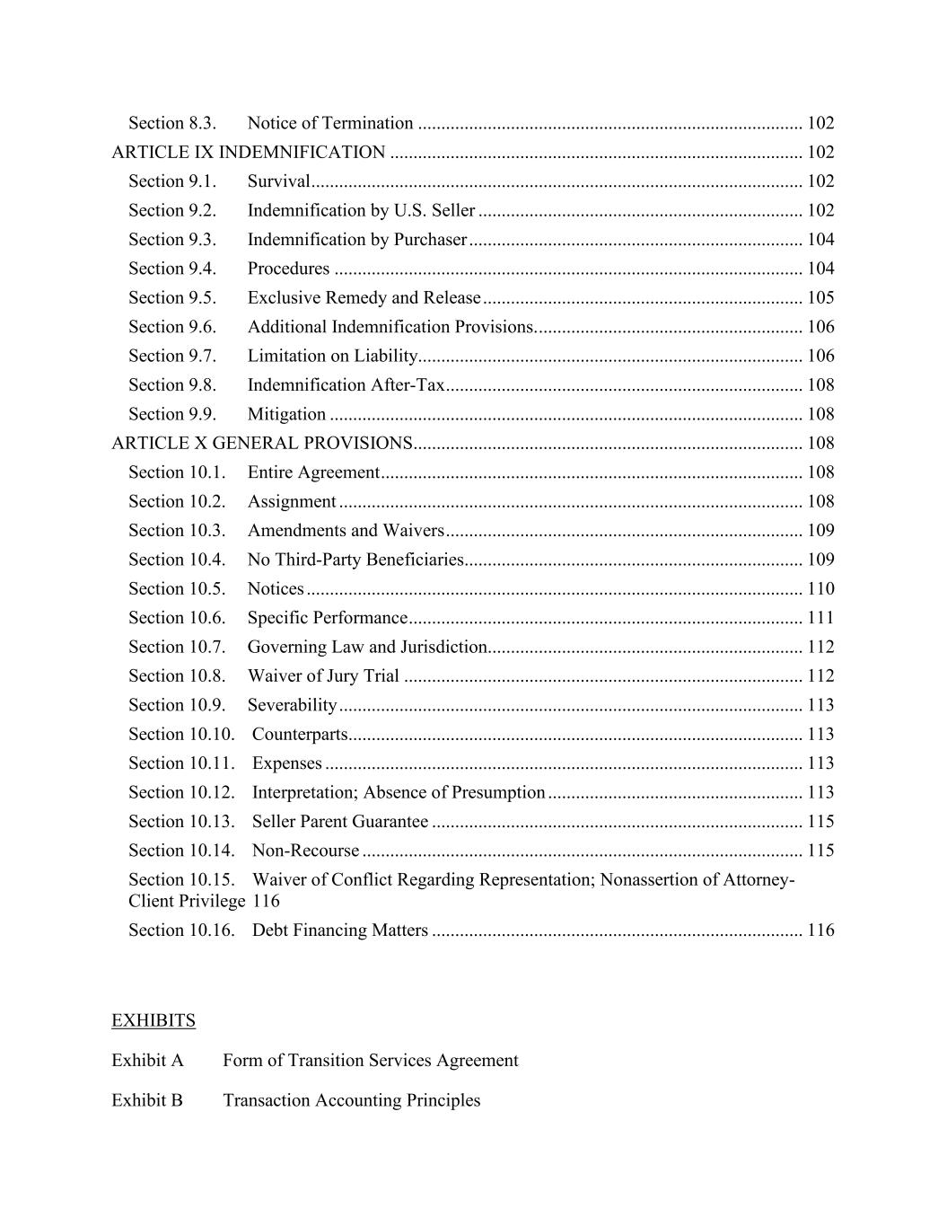 Section 8.3. Notice of Termination ................................................................................... 102 ARTICLE IX INDEMNIFICATION ......................................................................................... 102 Section 9.1. Survival .......................................................................................................... 102 Section 9.2. Indemnification by U.S. Seller ...................................................................... 102 Section 9.3. Indemnification by Purchaser ........................................................................ 104 Section 9.4. Procedures ..................................................................................................... 104 Section 9.5. Exclusive Remedy and Release ..................................................................... 105 Section 9.6. Additional Indemnification Provisions. ......................................................... 106 Section 9.7. Limitation on Liability................................................................................... 106 Section 9.8. Indemnification After-Tax ............................................................................. 108 Section 9.9. Mitigation ...................................................................................................... 108 ARTICLE X GENERAL PROVISIONS.................................................................................... 108 Section 10.1. Entire Agreement ........................................................................................... 108 Section 10.2. Assignment .................................................................................................... 108 Section 10.3. Amendments and Waivers ............................................................................. 109 Section 10.4. No Third-Party Beneficiaries ......................................................................... 109 Section 10.5. Notices ........................................................................................................... 110 Section 10.6. Specific Performance ..................................................................................... 111 Section 10.7. Governing Law and Jurisdiction.................................................................... 112 Section 10.8. Waiver of Jury Trial ...................................................................................... 112 Section 10.9. Severability .................................................................................................... 113 Section 10.10. Counterparts.................................................................................................. 113 Section 10.11. Expenses ....................................................................................................... 113 Section 10.12. Interpretation; Absence of Presumption ....................................................... 113 Section 10.13. Seller Parent Guarantee ................................................................................ 115 Section 10.14. Non-Recourse ............................................................................................... 115 Section 10.15. Waiver of Conflict Regarding Representation; Nonassertion of Attorney- Client Privilege 116 Section 10.16. Debt Financing Matters ................................................................................ 116 EXHIBITS Exhibit A Form of Transition Services Agreement Exhibit B Transaction Accounting Principles