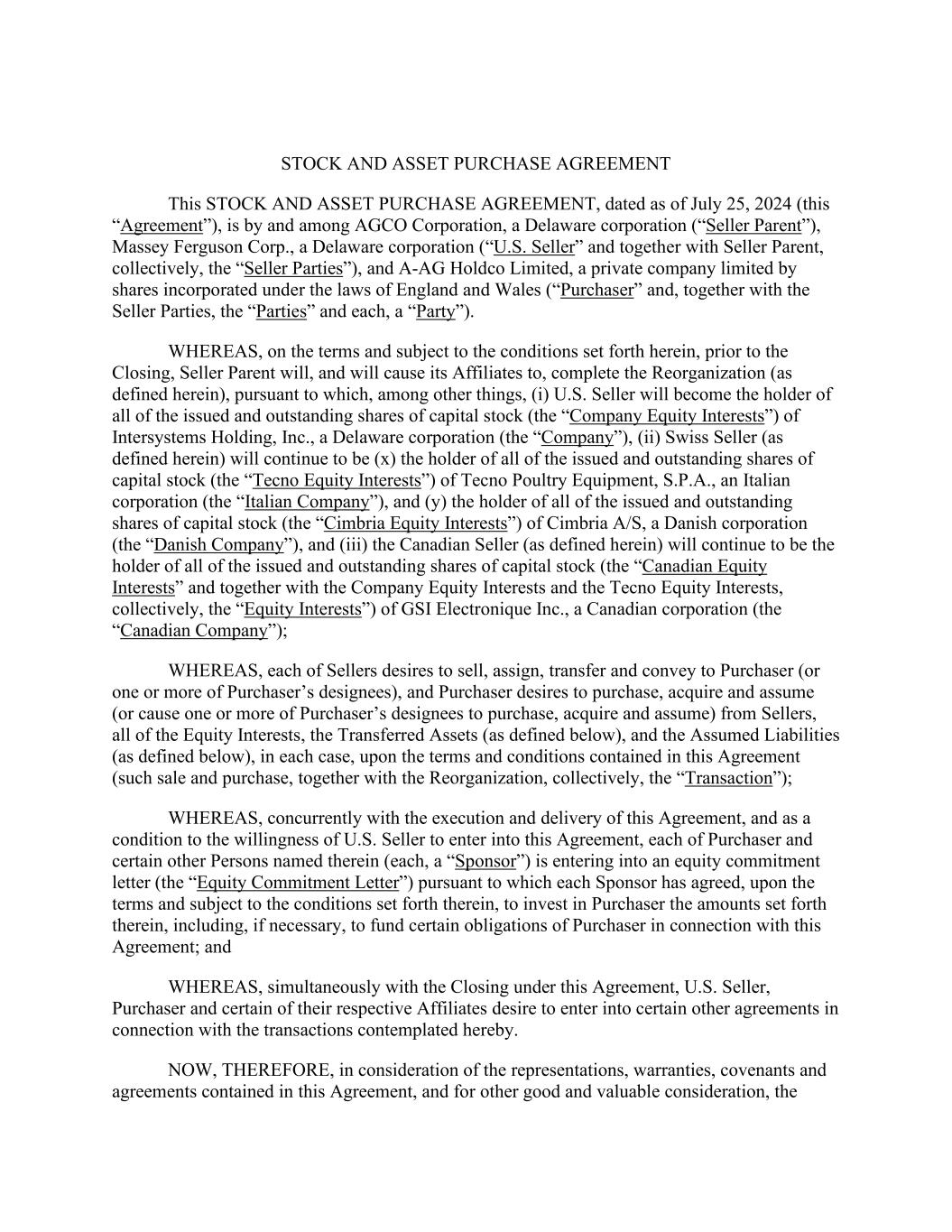 STOCK AND ASSET PURCHASE AGREEMENT This STOCK AND ASSET PURCHASE AGREEMENT, dated as of July 25, 2024 (this “Agreement”), is by and among AGCO Corporation, a Delaware corporation (“Seller Parent”), Massey Ferguson Corp., a Delaware corporation (“U.S. Seller” and together with Seller Parent, collectively, the “Seller Parties”), and A-AG Holdco Limited, a private company limited by shares incorporated under the laws of England and Wales (“Purchaser” and, together with the Seller Parties, the “Parties” and each, a “Party”). WHEREAS, on the terms and subject to the conditions set forth herein, prior to the Closing, Seller Parent will, and will cause its Affiliates to, complete the Reorganization (as defined herein), pursuant to which, among other things, (i) U.S. Seller will become the holder of all of the issued and outstanding shares of capital stock (the “Company Equity Interests”) of Intersystems Holding, Inc., a Delaware corporation (the “Company”), (ii) Swiss Seller (as defined herein) will continue to be (x) the holder of all of the issued and outstanding shares of capital stock (the “Tecno Equity Interests”) of Tecno Poultry Equipment, S.P.A., an Italian corporation (the “Italian Company”), and (y) the holder of all of the issued and outstanding shares of capital stock (the “Cimbria Equity Interests”) of Cimbria A/S, a Danish corporation (the “Danish Company”), and (iii) the Canadian Seller (as defined herein) will continue to be the holder of all of the issued and outstanding shares of capital stock (the “Canadian Equity Interests” and together with the Company Equity Interests and the Tecno Equity Interests, collectively, the “Equity Interests”) of GSI Electronique Inc., a Canadian corporation (the “Canadian Company”); WHEREAS, each of Sellers desires to sell, assign, transfer and convey to Purchaser (or one or more of Purchaser’s designees), and Purchaser desires to purchase, acquire and assume (or cause one or more of Purchaser’s designees to purchase, acquire and assume) from Sellers, all of the Equity Interests, the Transferred Assets (as defined below), and the Assumed Liabilities (as defined below), in each case, upon the terms and conditions contained in this Agreement (such sale and purchase, together with the Reorganization, collectively, the “Transaction”); WHEREAS, concurrently with the execution and delivery of this Agreement, and as a condition to the willingness of U.S. Seller to enter into this Agreement, each of Purchaser and certain other Persons named therein (each, a “Sponsor”) is entering into an equity commitment letter (the “Equity Commitment Letter”) pursuant to which each Sponsor has agreed, upon the terms and subject to the conditions set forth therein, to invest in Purchaser the amounts set forth therein, including, if necessary, to fund certain obligations of Purchaser in connection with this Agreement; and WHEREAS, simultaneously with the Closing under this Agreement, U.S. Seller, Purchaser and certain of their respective Affiliates desire to enter into certain other agreements in connection with the transactions contemplated hereby. NOW, THEREFORE, in consideration of the representations, warranties, covenants and agreements contained in this Agreement, and for other good and valuable consideration, the