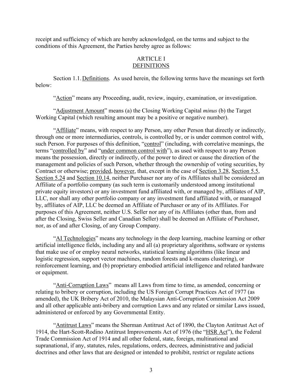 3 receipt and sufficiency of which are hereby acknowledged, on the terms and subject to the conditions of this Agreement, the Parties hereby agree as follows: ARTICLE I DEFINITIONS Section 1.1. Definitions. As used herein, the following terms have the meanings set forth below: “Action” means any Proceeding, audit, review, inquiry, examination, or investigation. “Adjustment Amount” means (a) the Closing Working Capital minus (b) the Target Working Capital (which resulting amount may be a positive or negative number). “Affiliate” means, with respect to any Person, any other Person that directly or indirectly, through one or more intermediaries, controls, is controlled by, or is under common control with, such Person. For purposes of this definition, “control” (including, with correlative meanings, the terms “controlled by” and “under common control with”), as used with respect to any Person means the possession, directly or indirectly, of the power to direct or cause the direction of the management and policies of such Person, whether through the ownership of voting securities, by Contract or otherwise; provided, however, that, except in the case of Section 3.28, Section 5.5, Section 5.24 and Section 10.14, neither Purchaser nor any of its Affiliates shall be considered an Affiliate of a portfolio company (as such term is customarily understood among institutional private equity investors) or any investment fund affiliated with, or managed by, affiliates of AIP, LLC, nor shall any other portfolio company or any investment fund affiliated with, or managed by, affiliates of AIP, LLC be deemed an Affiliate of Purchaser or any of its Affiliates. For purposes of this Agreement, neither U.S. Seller nor any of its Affiliates (other than, from and after the Closing, Swiss Seller and Canadian Seller) shall be deemed an Affiliate of Purchaser, nor, as of and after Closing, of any Group Company. “AI Technologies” means any technology in the deep learning, machine learning or other artificial intelligence fields, including any and all (a) proprietary algorithms, software or systems that make use of or employ neural networks, statistical learning algorithms (like linear and logistic regression, support vector machines, random forests and k-means clustering), or reinforcement learning, and (b) proprietary embodied artificial intelligence and related hardware or equipment. “Anti-Corruption Laws” means all Laws from time to time, as amended, concerning or relating to bribery or corruption, including the US Foreign Corrupt Practices Act of 1977 (as amended), the UK Bribery Act of 2010, the Malaysian Anti-Corruption Commission Act 2009 and all other applicable anti-bribery and corruption Laws and any related or similar Laws issued, administered or enforced by any Governmental Entity. “Antitrust Laws” means the Sherman Antitrust Act of 1890, the Clayton Antitrust Act of 1914, the Hart-Scott-Rodino Antitrust Improvements Act of 1976 (the “HSR Act”), the Federal Trade Commission Act of 1914 and all other federal, state, foreign, multinational and supranational, if any, statutes, rules, regulations, orders, decrees, administrative and judicial doctrines and other laws that are designed or intended to prohibit, restrict or regulate actions