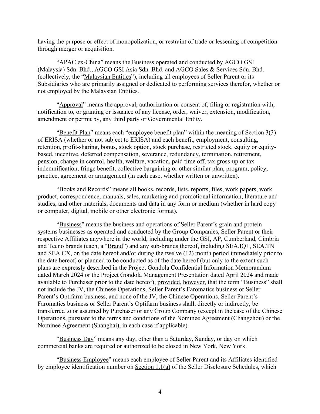 4 having the purpose or effect of monopolization, or restraint of trade or lessening of competition through merger or acquisition. “APAC ex-China” means the Business operated and conducted by AGCO GSI (Malaysia) Sdn. Bhd., AGCO GSI Asia Sdn. Bhd. and AGCO Sales & Services Sdn. Bhd. (collectively, the “Malaysian Entities”), including all employees of Seller Parent or its Subsidiaries who are primarily assigned or dedicated to performing services therefor, whether or not employed by the Malaysian Entities. “Approval” means the approval, authorization or consent of, filing or registration with, notification to, or granting or issuance of any license, order, waiver, extension, modification, amendment or permit by, any third party or Governmental Entity. “Benefit Plan” means each “employee benefit plan” within the meaning of Section 3(3) of ERISA (whether or not subject to ERISA) and each benefit, employment, consulting, retention, profit-sharing, bonus, stock option, stock purchase, restricted stock, equity or equity- based, incentive, deferred compensation, severance, redundancy, termination, retirement, pension, change in control, health, welfare, vacation, paid time off, tax gross-up or tax indemnification, fringe benefit, collective bargaining or other similar plan, program, policy, practice, agreement or arrangement (in each case, whether written or unwritten). “Books and Records” means all books, records, lists, reports, files, work papers, work product, correspondence, manuals, sales, marketing and promotional information, literature and studies, and other materials, documents and data in any form or medium (whether in hard copy or computer, digital, mobile or other electronic format). “Business” means the business and operations of Seller Parent’s grain and protein systems businesses as operated and conducted by the Group Companies, Seller Parent or their respective Affiliates anywhere in the world, including under the GSI, AP, Cumberland, Cimbria and Tecno brands (each, a “Brand”) and any sub-brands thereof, including SEA.IQ+, SEA.TN and SEA.CX, on the date hereof and/or during the twelve (12) month period immediately prior to the date hereof, or planned to be conducted as of the date hereof (but only to the extent such plans are expressly described in the Project Gondola Confidential Information Memorandum dated March 2024 or the Project Gondola Management Presentation dated April 2024 and made available to Purchaser prior to the date hereof); provided, however, that the term “Business” shall not include the JV, the Chinese Operations, Seller Parent’s Faromatics business or Seller Parent’s Optifarm business, and none of the JV, the Chinese Operations, Seller Parent’s Faromatics business or Seller Parent’s Optifarm business shall, directly or indirectly, be transferred to or assumed by Purchaser or any Group Company (except in the case of the Chinese Operations, pursuant to the terms and conditions of the Nominee Agreement (Changzhou) or the Nominee Agreement (Shanghai), in each case if applicable). “Business Day” means any day, other than a Saturday, Sunday, or day on which commercial banks are required or authorized to be closed in New York, New York. “Business Employee” means each employee of Seller Parent and its Affiliates identified by employee identification number on Section 1.1(a) of the Seller Disclosure Schedules, which