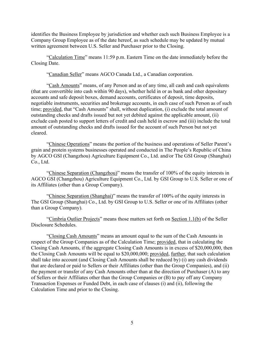 5 identifies the Business Employee by jurisdiction and whether each such Business Employee is a Company Group Employee as of the date hereof, as such schedule may be updated by mutual written agreement between U.S. Seller and Purchaser prior to the Closing. “Calculation Time” means 11:59 p.m. Eastern Time on the date immediately before the Closing Date. “Canadian Seller” means AGCO Canada Ltd., a Canadian corporation. “Cash Amounts” means, of any Person and as of any time, all cash and cash equivalents (that are convertible into cash within 90 days), whether held in or as bank and other depositary accounts and safe deposit boxes, demand accounts, certificates of deposit, time deposits, negotiable instruments, securities and brokerage accounts, in each case of such Person as of such time; provided, that “Cash Amounts” shall, without duplication, (i) exclude the total amount of outstanding checks and drafts issued but not yet debited against the applicable amount, (ii) exclude cash posted to support letters of credit and cash held in escrow and (iii) include the total amount of outstanding checks and drafts issued for the account of such Person but not yet cleared. “Chinese Operations” means the portion of the business and operations of Seller Parent’s grain and protein systems businesses operated and conducted in The People’s Republic of China by AGCO GSI (Changzhou) Agriculture Equipment Co., Ltd. and/or The GSI Group (Shanghai) Co., Ltd. “Chinese Separation (Changzhou)” means the transfer of 100% of the equity interests in AGCO GSI (Changzhou) Agriculture Equipment Co., Ltd. by GSI Group to U.S. Seller or one of its Affiliates (other than a Group Company). “Chinese Separation (Shanghai)” means the transfer of 100% of the equity interests in The GSI Group (Shanghai) Co., Ltd. by GSI Group to U.S. Seller or one of its Affiliates (other than a Group Company). “Cimbria Outlier Projects” means those matters set forth on Section 1.1(b) of the Seller Disclosure Schedules. “Closing Cash Amounts” means an amount equal to the sum of the Cash Amounts in respect of the Group Companies as of the Calculation Time; provided, that in calculating the Closing Cash Amounts, if the aggregate Closing Cash Amounts is in excess of $20,000,000, then the Closing Cash Amounts will be equal to $20,000,000; provided, further, that such calculation shall take into account (and Closing Cash Amounts shall be reduced by) (i) any cash dividends that are declared or paid to Sellers or their Affiliates (other than the Group Companies), and (ii) the payment or transfer of any Cash Amounts other than at the direction of Purchaser (A) to any of Sellers or their Affiliates other than the Group Companies or (B) to pay off any Company Transaction Expenses or Funded Debt, in each case of clauses (i) and (ii), following the Calculation Time and prior to the Closing.