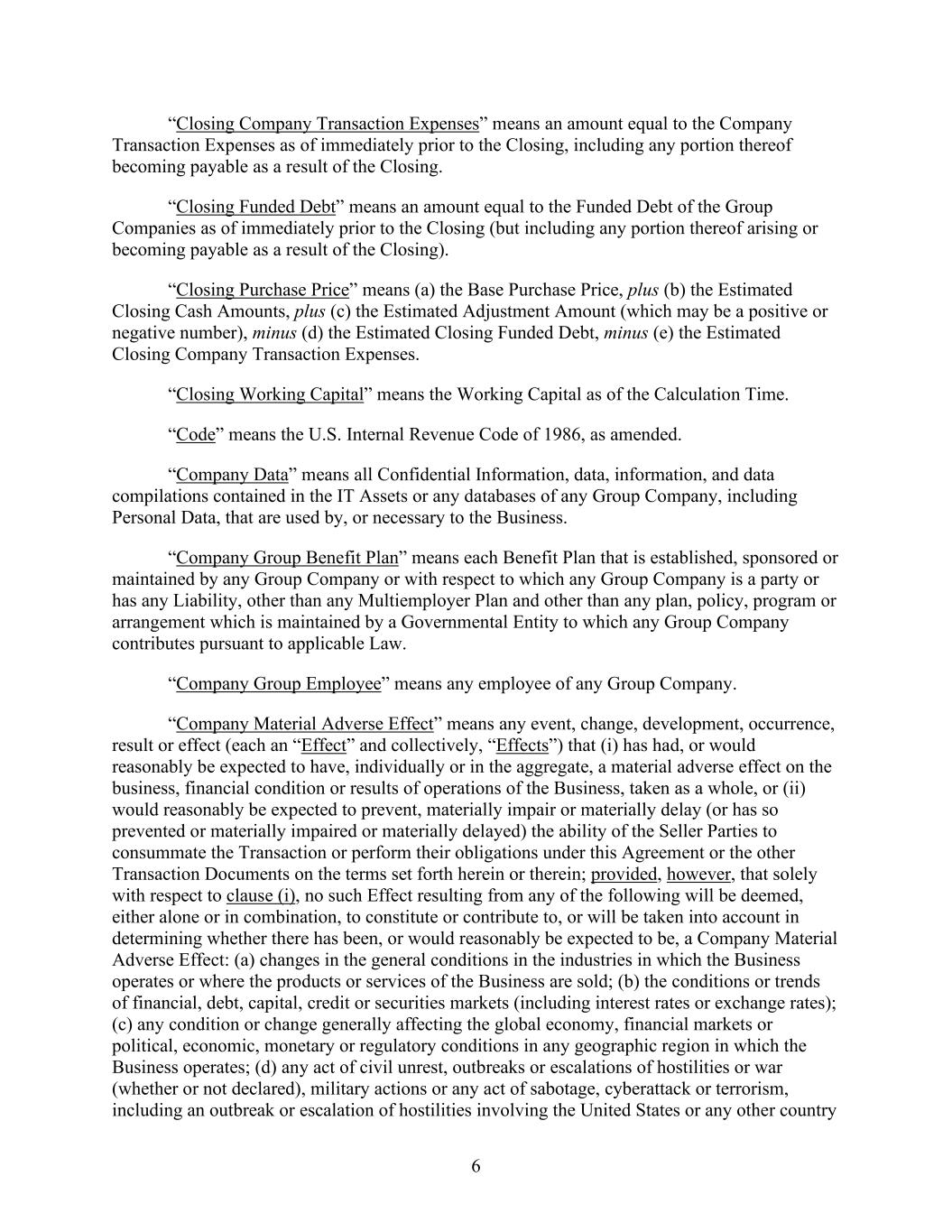 6 “Closing Company Transaction Expenses” means an amount equal to the Company Transaction Expenses as of immediately prior to the Closing, including any portion thereof becoming payable as a result of the Closing. “Closing Funded Debt” means an amount equal to the Funded Debt of the Group Companies as of immediately prior to the Closing (but including any portion thereof arising or becoming payable as a result of the Closing). “Closing Purchase Price” means (a) the Base Purchase Price, plus (b) the Estimated Closing Cash Amounts, plus (c) the Estimated Adjustment Amount (which may be a positive or negative number), minus (d) the Estimated Closing Funded Debt, minus (e) the Estimated Closing Company Transaction Expenses. “Closing Working Capital” means the Working Capital as of the Calculation Time. “Code” means the U.S. Internal Revenue Code of 1986, as amended. “Company Data” means all Confidential Information, data, information, and data compilations contained in the IT Assets or any databases of any Group Company, including Personal Data, that are used by, or necessary to the Business. “Company Group Benefit Plan” means each Benefit Plan that is established, sponsored or maintained by any Group Company or with respect to which any Group Company is a party or has any Liability, other than any Multiemployer Plan and other than any plan, policy, program or arrangement which is maintained by a Governmental Entity to which any Group Company contributes pursuant to applicable Law. “Company Group Employee” means any employee of any Group Company. “Company Material Adverse Effect” means any event, change, development, occurrence, result or effect (each an “Effect” and collectively, “Effects”) that (i) has had, or would reasonably be expected to have, individually or in the aggregate, a material adverse effect on the business, financial condition or results of operations of the Business, taken as a whole, or (ii) would reasonably be expected to prevent, materially impair or materially delay (or has so prevented or materially impaired or materially delayed) the ability of the Seller Parties to consummate the Transaction or perform their obligations under this Agreement or the other Transaction Documents on the terms set forth herein or therein; provided, however, that solely with respect to clause (i), no such Effect resulting from any of the following will be deemed, either alone or in combination, to constitute or contribute to, or will be taken into account in determining whether there has been, or would reasonably be expected to be, a Company Material Adverse Effect: (a) changes in the general conditions in the industries in which the Business operates or where the products or services of the Business are sold; (b) the conditions or trends of financial, debt, capital, credit or securities markets (including interest rates or exchange rates); (c) any condition or change generally affecting the global economy, financial markets or political, economic, monetary or regulatory conditions in any geographic region in which the Business operates; (d) any act of civil unrest, outbreaks or escalations of hostilities or war (whether or not declared), military actions or any act of sabotage, cyberattack or terrorism, including an outbreak or escalation of hostilities involving the United States or any other country