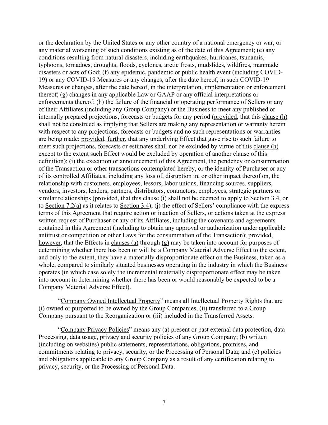 7 or the declaration by the United States or any other country of a national emergency or war, or any material worsening of such conditions existing as of the date of this Agreement; (e) any conditions resulting from natural disasters, including earthquakes, hurricanes, tsunamis, typhoons, tornadoes, droughts, floods, cyclones, arctic frosts, mudslides, wildfires, manmade disasters or acts of God; (f) any epidemic, pandemic or public health event (including COVID- 19) or any COVID-19 Measures or any changes, after the date hereof, in such COVID-19 Measures or changes, after the date hereof, in the interpretation, implementation or enforcement thereof; (g) changes in any applicable Law or GAAP or any official interpretations or enforcements thereof; (h) the failure of the financial or operating performance of Sellers or any of their Affiliates (including any Group Company) or the Business to meet any published or internally prepared projections, forecasts or budgets for any period (provided, that this clause (h) shall not be construed as implying that Sellers are making any representation or warranty herein with respect to any projections, forecasts or budgets and no such representations or warranties are being made; provided, further, that any underlying Effect that gave rise to such failure to meet such projections, forecasts or estimates shall not be excluded by virtue of this clause (h) except to the extent such Effect would be excluded by operation of another clause of this definition); (i) the execution or announcement of this Agreement, the pendency or consummation of the Transaction or other transactions contemplated hereby, or the identity of Purchaser or any of its controlled Affiliates, including any loss of, disruption in, or other impact thereof on, the relationship with customers, employees, lessors, labor unions, financing sources, suppliers, vendors, investors, lenders, partners, distributors, contractors, employees, strategic partners or similar relationships (provided, that this clause (i) shall not be deemed to apply to Section 3.4, or to Section 7.2(a) as it relates to Section 3.4); (j) the effect of Sellers’ compliance with the express terms of this Agreement that require action or inaction of Sellers, or actions taken at the express written request of Purchaser or any of its Affiliates, including the covenants and agreements contained in this Agreement (including to obtain any approval or authorization under applicable antitrust or competition or other Laws for the consummation of the Transaction); provided, however, that the Effects in clauses (a) through (g) may be taken into account for purposes of determining whether there has been or will be a Company Material Adverse Effect to the extent, and only to the extent, they have a materially disproportionate effect on the Business, taken as a whole, compared to similarly situated businesses operating in the industry in which the Business operates (in which case solely the incremental materially disproportionate effect may be taken into account in determining whether there has been or would reasonably be expected to be a Company Material Adverse Effect). “Company Owned Intellectual Property” means all Intellectual Property Rights that are (i) owned or purported to be owned by the Group Companies, (ii) transferred to a Group Company pursuant to the Reorganization or (iii) included in the Transferred Assets. “Company Privacy Policies” means any (a) present or past external data protection, data Processing, data usage, privacy and security policies of any Group Company; (b) written (including on websites) public statements, representations, obligations, promises, and commitments relating to privacy, security, or the Processing of Personal Data; and (c) policies and obligations applicable to any Group Company as a result of any certification relating to privacy, security, or the Processing of Personal Data.