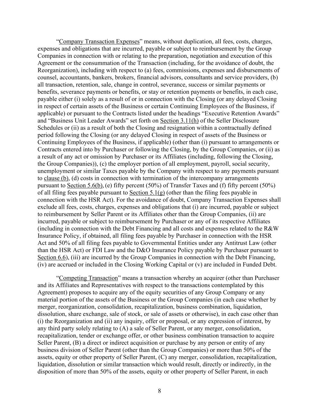 8 “Company Transaction Expenses” means, without duplication, all fees, costs, charges, expenses and obligations that are incurred, payable or subject to reimbursement by the Group Companies in connection with or relating to the preparation, negotiation and execution of this Agreement or the consummation of the Transaction (including, for the avoidance of doubt, the Reorganization), including with respect to (a) fees, commissions, expenses and disbursements of counsel, accountants, bankers, brokers, financial advisors, consultants and service providers, (b) all transaction, retention, sale, change in control, severance, success or similar payments or benefits, severance payments or benefits, or stay or retention payments or benefits, in each case, payable either (i) solely as a result of or in connection with the Closing (or any delayed Closing in respect of certain assets of the Business or certain Continuing Employees of the Business, if applicable) or pursuant to the Contracts listed under the headings “Executive Retention Awards” and “Business Unit Leader Awards” set forth on Section 3.11(h) of the Seller Disclosure Schedules or (ii) as a result of both the Closing and resignation within a contractually defined period following the Closing (or any delayed Closing in respect of assets of the Business or Continuing Employees of the Business, if applicable) (other than (i) pursuant to arrangements or Contracts entered into by Purchaser or following the Closing, by the Group Companies, or (ii) as a result of any act or omission by Purchaser or its Affiliates (including, following the Closing, the Group Companies)), (c) the employer portion of all employment, payroll, social security, unemployment or similar Taxes payable by the Company with respect to any payments pursuant to clause (b), (d) costs in connection with termination of the intercompany arrangements pursuant to Section 5.6(b), (e) fifty percent (50%) of Transfer Taxes and (f) fifty percent (50%) of all filing fees payable pursuant to Section 5.1(g) (other than the filing fees payable in connection with the HSR Act). For the avoidance of doubt, Company Transaction Expenses shall exclude all fees, costs, charges, expenses and obligations that (i) are incurred, payable or subject to reimbursement by Seller Parent or its Affiliates other than the Group Companies, (ii) are incurred, payable or subject to reimbursement by Purchaser or any of its respective Affiliates (including in connection with the Debt Financing and all costs and expenses related to the R&W Insurance Policy, if obtained, all filing fees payable by Purchaser in connection with the HSR Act and 50% of all filing fees payable to Governmental Entities under any Antitrust Law (other than the HSR Act) or FDI Law and the D&O Insurance Policy payable by Purchaser pursuant to Section 6.6), (iii) are incurred by the Group Companies in connection with the Debt Financing, (iv) are accrued or included in the Closing Working Capital or (v) are included in Funded Debt. “Competing Transaction” means a transaction whereby an acquirer (other than Purchaser and its Affiliates and Representatives with respect to the transactions contemplated by this Agreement) proposes to acquire any of the equity securities of any Group Company or any material portion of the assets of the Business or the Group Companies (in each case whether by merger, reorganization, consolidation, recapitalization, business combination, liquidation, dissolution, share exchange, sale of stock, or sale of assets or otherwise), in each case other than (i) the Reorganization and (ii) any inquiry, offer or proposal, or any expression of interest, by any third party solely relating to (A) a sale of Seller Parent, or any merger, consolidation, recapitalization, tender or exchange offer, or other business combination transaction to acquire Seller Parent, (B) a direct or indirect acquisition or purchase by any person or entity of any business division of Seller Parent (other than the Group Companies) or more than 50% of the assets, equity or other property of Seller Parent, (C) any merger, consolidation, recapitalization, liquidation, dissolution or similar transaction which would result, directly or indirectly, in the disposition of more than 50% of the assets, equity or other property of Seller Parent, in each