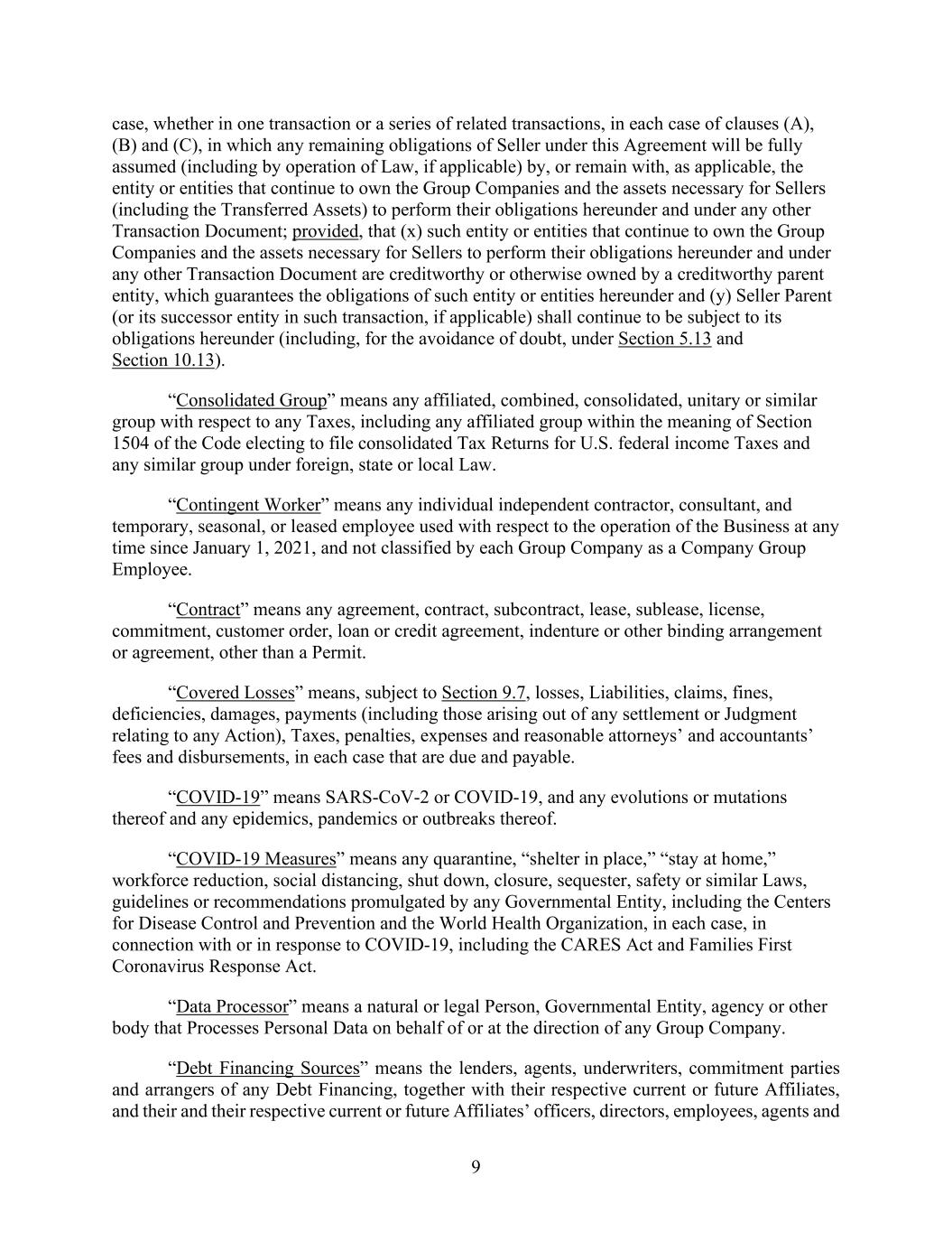 9 case, whether in one transaction or a series of related transactions, in each case of clauses (A), (B) and (C), in which any remaining obligations of Seller under this Agreement will be fully assumed (including by operation of Law, if applicable) by, or remain with, as applicable, the entity or entities that continue to own the Group Companies and the assets necessary for Sellers (including the Transferred Assets) to perform their obligations hereunder and under any other Transaction Document; provided, that (x) such entity or entities that continue to own the Group Companies and the assets necessary for Sellers to perform their obligations hereunder and under any other Transaction Document are creditworthy or otherwise owned by a creditworthy parent entity, which guarantees the obligations of such entity or entities hereunder and (y) Seller Parent (or its successor entity in such transaction, if applicable) shall continue to be subject to its obligations hereunder (including, for the avoidance of doubt, under Section 5.13 and Section 10.13). “Consolidated Group” means any affiliated, combined, consolidated, unitary or similar group with respect to any Taxes, including any affiliated group within the meaning of Section 1504 of the Code electing to file consolidated Tax Returns for U.S. federal income Taxes and any similar group under foreign, state or local Law. “Contingent Worker” means any individual independent contractor, consultant, and temporary, seasonal, or leased employee used with respect to the operation of the Business at any time since January 1, 2021, and not classified by each Group Company as a Company Group Employee. “Contract” means any agreement, contract, subcontract, lease, sublease, license, commitment, customer order, loan or credit agreement, indenture or other binding arrangement or agreement, other than a Permit. “Covered Losses” means, subject to Section 9.7, losses, Liabilities, claims, fines, deficiencies, damages, payments (including those arising out of any settlement or Judgment relating to any Action), Taxes, penalties, expenses and reasonable attorneys’ and accountants’ fees and disbursements, in each case that are due and payable. “COVID-19” means SARS-CoV-2 or COVID-19, and any evolutions or mutations thereof and any epidemics, pandemics or outbreaks thereof. “COVID-19 Measures” means any quarantine, “shelter in place,” “stay at home,” workforce reduction, social distancing, shut down, closure, sequester, safety or similar Laws, guidelines or recommendations promulgated by any Governmental Entity, including the Centers for Disease Control and Prevention and the World Health Organization, in each case, in connection with or in response to COVID-19, including the CARES Act and Families First Coronavirus Response Act. “Data Processor” means a natural or legal Person, Governmental Entity, agency or other body that Processes Personal Data on behalf of or at the direction of any Group Company. “Debt Financing Sources” means the lenders, agents, underwriters, commitment parties and arrangers of any Debt Financing, together with their respective current or future Affiliates, and their and their respective current or future Affiliates’ officers, directors, employees, agents and