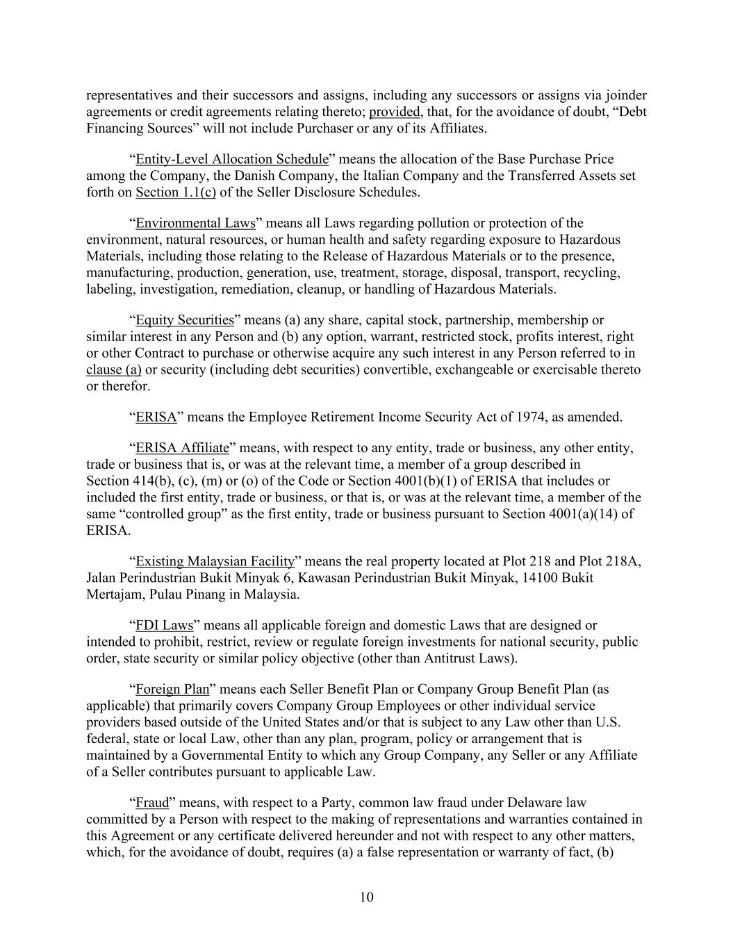10 representatives and their successors and assigns, including any successors or assigns via joinder agreements or credit agreements relating thereto; provided, that, for the avoidance of doubt, “Debt Financing Sources” will not include Purchaser or any of its Affiliates. “Entity-Level Allocation Schedule” means the allocation of the Base Purchase Price among the Company, the Danish Company, the Italian Company and the Transferred Assets set forth on Section 1.1(c) of the Seller Disclosure Schedules. “Environmental Laws” means all Laws regarding pollution or protection of the environment, natural resources, or human health and safety regarding exposure to Hazardous Materials, including those relating to the Release of Hazardous Materials or to the presence, manufacturing, production, generation, use, treatment, storage, disposal, transport, recycling, labeling, investigation, remediation, cleanup, or handling of Hazardous Materials. “Equity Securities” means (a) any share, capital stock, partnership, membership or similar interest in any Person and (b) any option, warrant, restricted stock, profits interest, right or other Contract to purchase or otherwise acquire any such interest in any Person referred to in clause (a) or security (including debt securities) convertible, exchangeable or exercisable thereto or therefor. “ERISA” means the Employee Retirement Income Security Act of 1974, as amended. “ERISA Affiliate” means, with respect to any entity, trade or business, any other entity, trade or business that is, or was at the relevant time, a member of a group described in Section 414(b), (c), (m) or (o) of the Code or Section 4001(b)(1) of ERISA that includes or included the first entity, trade or business, or that is, or was at the relevant time, a member of the same “controlled group” as the first entity, trade or business pursuant to Section 4001(a)(14) of ERISA. “Existing Malaysian Facility” means the real property located at Plot 218 and Plot 218A, Jalan Perindustrian Bukit Minyak 6, Kawasan Perindustrian Bukit Minyak, 14100 Bukit Mertajam, Pulau Pinang in Malaysia. “FDI Laws” means all applicable foreign and domestic Laws that are designed or intended to prohibit, restrict, review or regulate foreign investments for national security, public order, state security or similar policy objective (other than Antitrust Laws). “Foreign Plan” means each Seller Benefit Plan or Company Group Benefit Plan (as applicable) that primarily covers Company Group Employees or other individual service providers based outside of the United States and/or that is subject to any Law other than U.S. federal, state or local Law, other than any plan, program, policy or arrangement that is maintained by a Governmental Entity to which any Group Company, any Seller or any Affiliate of a Seller contributes pursuant to applicable Law. “Fraud” means, with respect to a Party, common law fraud under Delaware law committed by a Person with respect to the making of representations and warranties contained in this Agreement or any certificate delivered hereunder and not with respect to any other matters, which, for the avoidance of doubt, requires (a) a false representation or warranty of fact, (b)