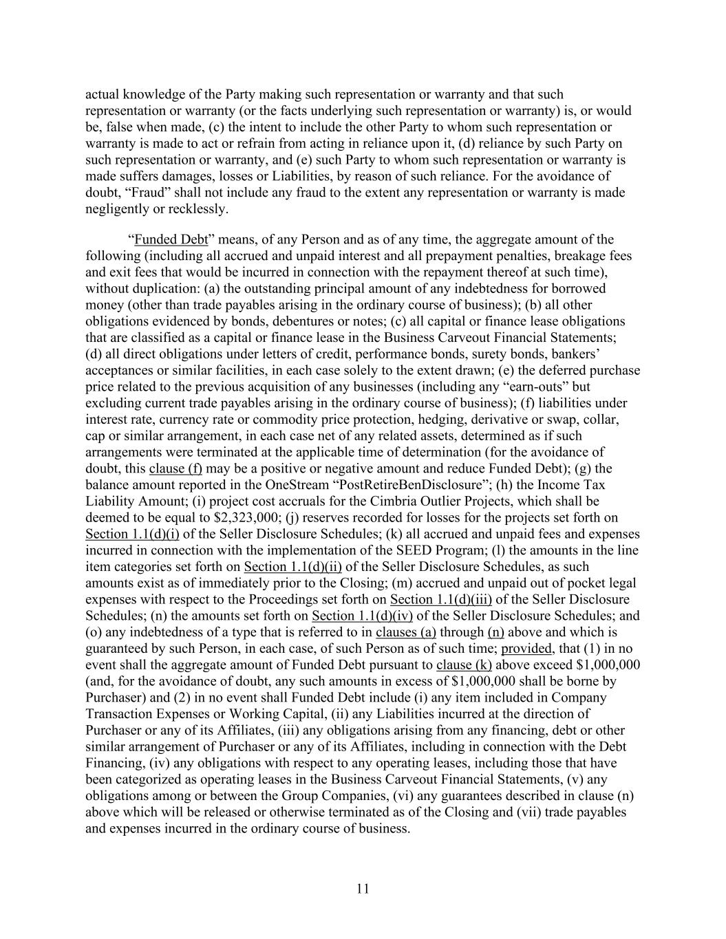 11 actual knowledge of the Party making such representation or warranty and that such representation or warranty (or the facts underlying such representation or warranty) is, or would be, false when made, (c) the intent to include the other Party to whom such representation or warranty is made to act or refrain from acting in reliance upon it, (d) reliance by such Party on such representation or warranty, and (e) such Party to whom such representation or warranty is made suffers damages, losses or Liabilities, by reason of such reliance. For the avoidance of doubt, “Fraud” shall not include any fraud to the extent any representation or warranty is made negligently or recklessly. “Funded Debt” means, of any Person and as of any time, the aggregate amount of the following (including all accrued and unpaid interest and all prepayment penalties, breakage fees and exit fees that would be incurred in connection with the repayment thereof at such time), without duplication: (a) the outstanding principal amount of any indebtedness for borrowed money (other than trade payables arising in the ordinary course of business); (b) all other obligations evidenced by bonds, debentures or notes; (c) all capital or finance lease obligations that are classified as a capital or finance lease in the Business Carveout Financial Statements; (d) all direct obligations under letters of credit, performance bonds, surety bonds, bankers’ acceptances or similar facilities, in each case solely to the extent drawn; (e) the deferred purchase price related to the previous acquisition of any businesses (including any “earn-outs” but excluding current trade payables arising in the ordinary course of business); (f) liabilities under interest rate, currency rate or commodity price protection, hedging, derivative or swap, collar, cap or similar arrangement, in each case net of any related assets, determined as if such arrangements were terminated at the applicable time of determination (for the avoidance of doubt, this clause (f) may be a positive or negative amount and reduce Funded Debt); (g) the balance amount reported in the OneStream “PostRetireBenDisclosure”; (h) the Income Tax Liability Amount; (i) project cost accruals for the Cimbria Outlier Projects, which shall be deemed to be equal to $2,323,000; (j) reserves recorded for losses for the projects set forth on Section 1.1(d)(i) of the Seller Disclosure Schedules; (k) all accrued and unpaid fees and expenses incurred in connection with the implementation of the SEED Program; (l) the amounts in the line item categories set forth on Section 1.1(d)(ii) of the Seller Disclosure Schedules, as such amounts exist as of immediately prior to the Closing; (m) accrued and unpaid out of pocket legal expenses with respect to the Proceedings set forth on Section 1.1(d)(iii) of the Seller Disclosure Schedules; (n) the amounts set forth on Section 1.1(d)(iv) of the Seller Disclosure Schedules; and (o) any indebtedness of a type that is referred to in clauses (a) through (n) above and which is guaranteed by such Person, in each case, of such Person as of such time; provided, that (1) in no event shall the aggregate amount of Funded Debt pursuant to clause (k) above exceed $1,000,000 (and, for the avoidance of doubt, any such amounts in excess of $1,000,000 shall be borne by Purchaser) and (2) in no event shall Funded Debt include (i) any item included in Company Transaction Expenses or Working Capital, (ii) any Liabilities incurred at the direction of Purchaser or any of its Affiliates, (iii) any obligations arising from any financing, debt or other similar arrangement of Purchaser or any of its Affiliates, including in connection with the Debt Financing, (iv) any obligations with respect to any operating leases, including those that have been categorized as operating leases in the Business Carveout Financial Statements, (v) any obligations among or between the Group Companies, (vi) any guarantees described in clause (n) above which will be released or otherwise terminated as of the Closing and (vii) trade payables and expenses incurred in the ordinary course of business.