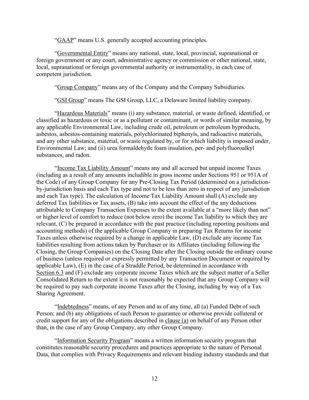 12 “GAAP” means U.S. generally accepted accounting principles. “Governmental Entity” means any national, state, local, provincial, supranational or foreign government or any court, administrative agency or commission or other national, state, local, supranational or foreign governmental authority or instrumentality, in each case of competent jurisdiction. “Group Company” means any of the Company and the Company Subsidiaries. “GSI Group” means The GSI Group, LLC, a Delaware limited liability company. “Hazardous Materials” means (i) any substance, material, or waste defined, identified, or classified as hazardous or toxic or as a pollutant or contaminant, or words of similar meaning, by any applicable Environmental Law, including crude oil, petroleum or petroleum byproducts, asbestos, asbestos-containing materials, polychlorinated biphenyls, and radioactive materials, and any other substance, material, or waste regulated by, or for which liability is imposed under, Environmental Law; and (ii) urea formaldehyde foam insulation, per- and polyfluoroalkyl substances, and radon. “Income Tax Liability Amount” means any and all accrued but unpaid income Taxes (including as a result of any amounts includible in gross income under Sections 951 or 951A of the Code) of any Group Company for any Pre-Closing Tax Period (determined on a jurisdiction- by-jurisdiction basis and each Tax type and not to be less than zero in respect of any jurisdiction and each Tax type). The calculation of Income Tax Liability Amount shall (A) exclude any deferred Tax liabilities or Tax assets, (B) take into account the effect of the any deductions attributable to Company Transaction Expenses to the extent available at a “more likely than not” or higher level of comfort to reduce (not below zero) the income Tax liability to which they are relevant, (C) be prepared in accordance with the past practice (including reporting positions and accounting methods) of the applicable Group Company in preparing Tax Returns for income Taxes unless otherwise required by a change in applicable Law, (D) exclude any income Tax liabilities resulting from actions taken by Purchaser or its Affiliates (including following the Closing, the Group Companies) on the Closing Date after the Closing outside the ordinary course of business (unless required or expressly permitted by any Transaction Document or required by applicable Law), (E) in the case of a Straddle Period, be determined in accordance with Section 6.3 and (F) exclude any corporate income Taxes which are the subject matter of a Seller Consolidated Return to the extent it is not reasonably be expected that any Group Company will be required to pay such corporate income Taxes after the Closing, including by way of a Tax Sharing Agreement. “Indebtedness” means, of any Person and as of any time, all (a) Funded Debt of such Person; and (b) any obligations of such Person to guarantee or otherwise provide collateral or credit support for any of the obligations described in clause (a) on behalf of any Person other than, in the case of any Group Company, any other Group Company. “Information Security Program” means a written information security program that constitutes reasonable security procedures and practices appropriate to the nature of Personal Data, that complies with Privacy Requirements and relevant binding industry standards and that