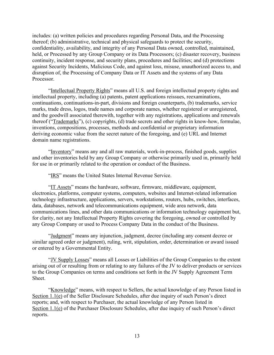 13 includes: (a) written policies and procedures regarding Personal Data, and the Processing thereof; (b) administrative, technical and physical safeguards to protect the security, confidentiality, availability, and integrity of any Personal Data owned, controlled, maintained, held, or Processed by any Group Company or its Data Processors; (c) disaster recovery, business continuity, incident response, and security plans, procedures and facilities; and (d) protections against Security Incidents, Malicious Code, and against loss, misuse, unauthorized access to, and disruption of, the Processing of Company Data or IT Assets and the systems of any Data Processor. “Intellectual Property Rights” means all U.S. and foreign intellectual property rights and intellectual property, including (a) patents, patent applications reissues, reexaminations, continuations, continuations-in-part, divisions and foreign counterparts, (b) trademarks, service marks, trade dress, logos, trade names and corporate names, whether registered or unregistered, and the goodwill associated therewith, together with any registrations, applications and renewals thereof (“Trademarks”), (c) copyrights, (d) trade secrets and other rights in know-how, formulae, inventions, compositions, processes, methods and confidential or proprietary information deriving economic value from the secret nature of the foregoing, and (e) URL and Internet domain name registrations. “Inventory” means any and all raw materials, work-in-process, finished goods, supplies and other inventories held by any Group Company or otherwise primarily used in, primarily held for use in or primarily related to the operation or conduct of the Business. “IRS” means the United States Internal Revenue Service. “IT Assets” means the hardware, software, firmware, middleware, equipment, electronics, platforms, computer systems, computers, websites and Internet-related information technology infrastructure, applications, servers, workstations, routers, hubs, switches, interfaces, data, databases, network and telecommunications equipment, wide area network, data communications lines, and other data communications or information technology equipment but, for clarity, not any Intellectual Property Rights covering the foregoing, owned or controlled by any Group Company or used to Process Company Data in the conduct of the Business. “Judgment” means any injunction, judgment, decree (including any consent decree or similar agreed order or judgment), ruling, writ, stipulation, order, determination or award issued or entered by a Governmental Entity. “JV Supply Losses” means all Losses or Liabilities of the Group Companies to the extent arising out of or resulting from or relating to any failures of the JV to deliver products or services to the Group Companies on terms and conditions set forth in the JV Supply Agreement Term Sheet. “Knowledge” means, with respect to Sellers, the actual knowledge of any Person listed in Section 1.1(e) of the Seller Disclosure Schedules, after due inquiry of such Person’s direct reports; and, with respect to Purchaser, the actual knowledge of any Person listed in Section 1.1(e) of the Purchaser Disclosure Schedules, after due inquiry of such Person’s direct reports.